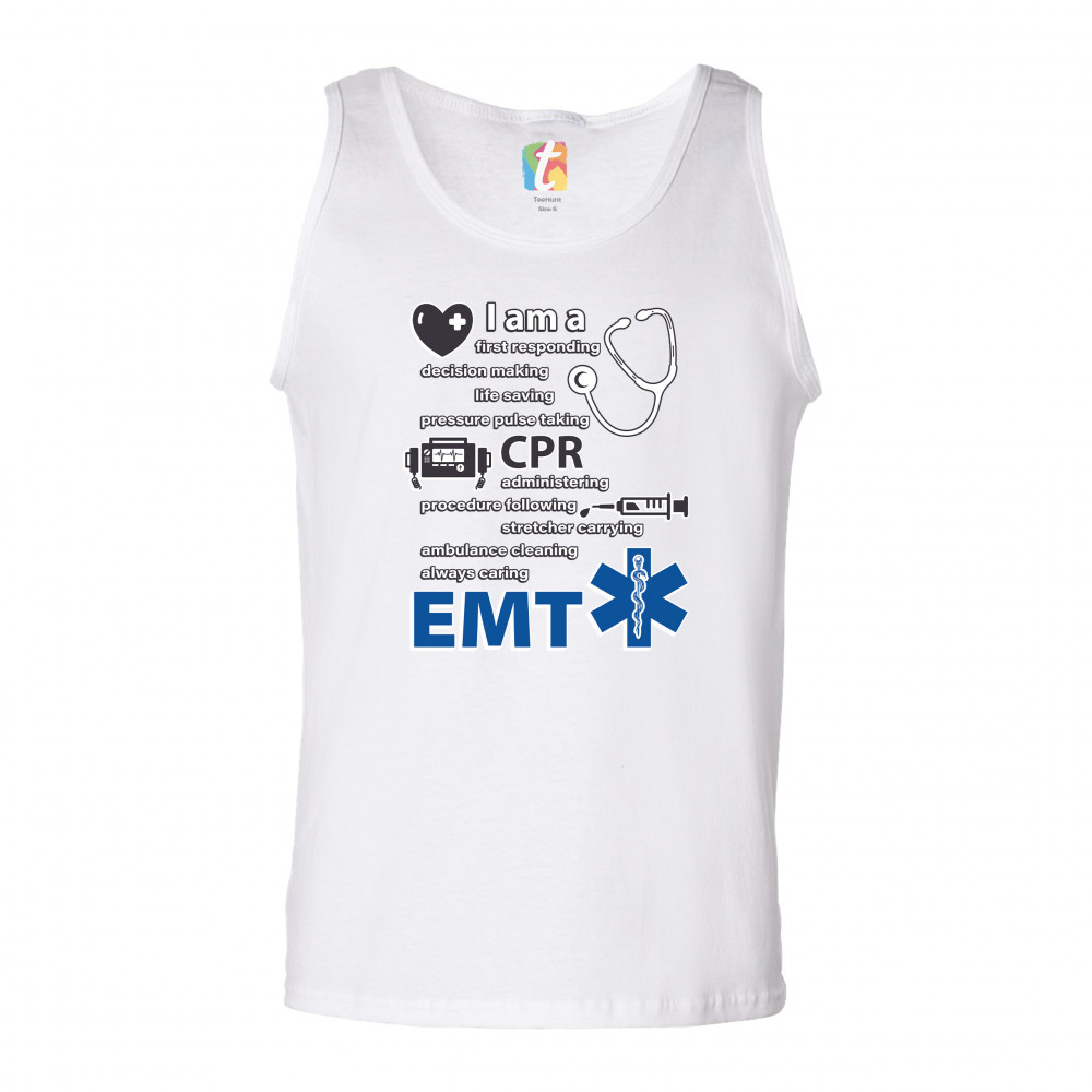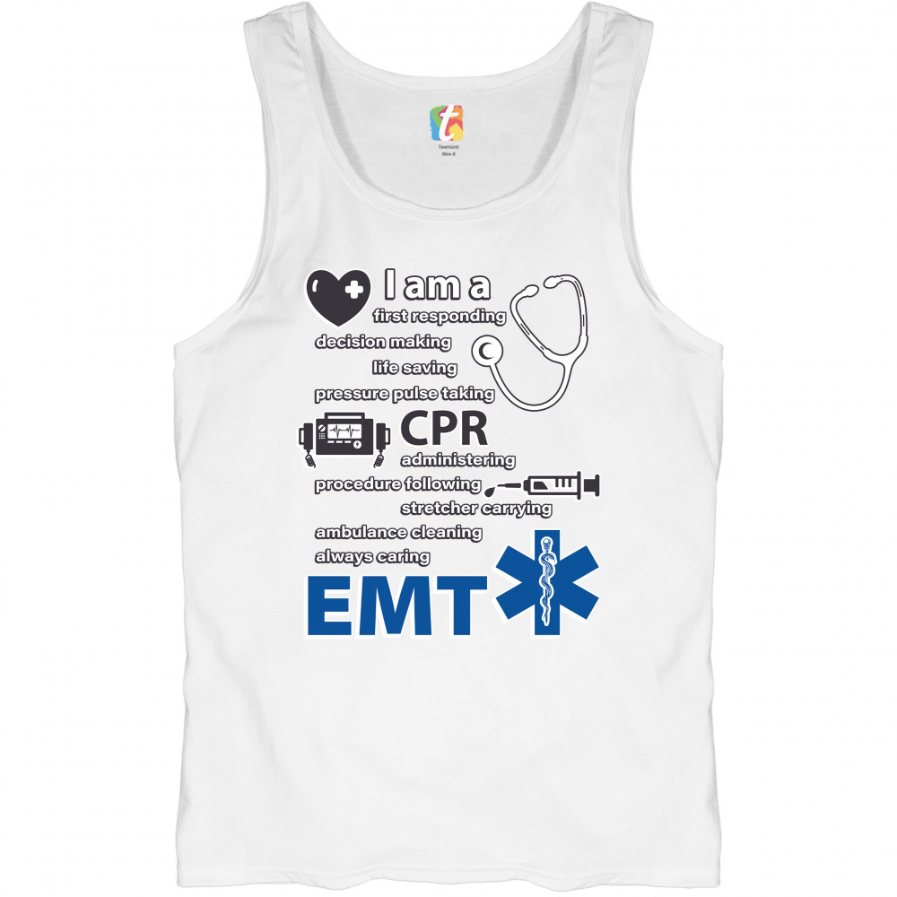 A print saying "I am a first responding, decision making, life saving, pressure pulse taking, CPR administering, procedure following, stretcher carrying, ambulance cleaning, always caring EMT". The print also features images of a heart, a stethoscope, a defibrillator, a syringe and the Star of Life. A great choice as a gift for a first responder.