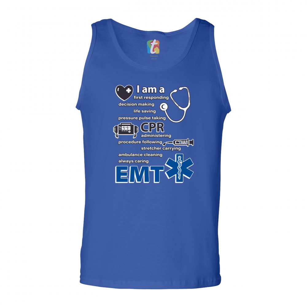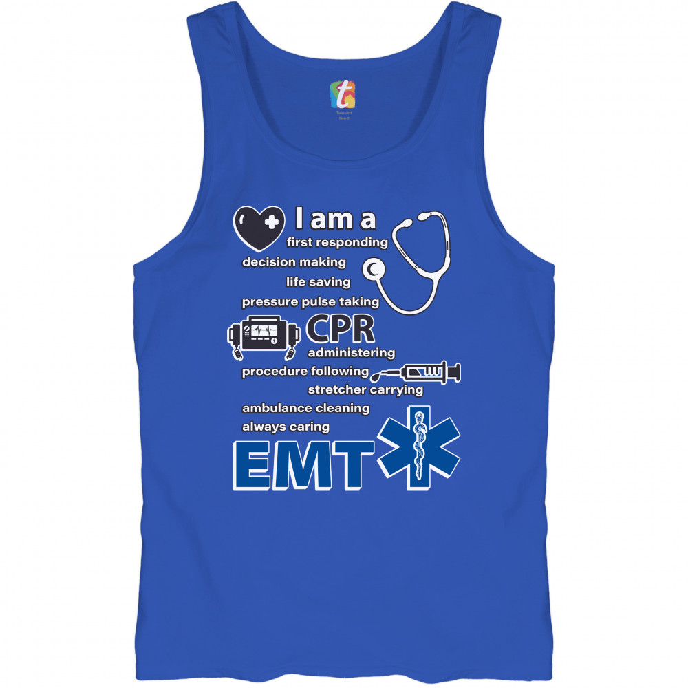 A print saying "I am a first responding, decision making, life saving, pressure pulse taking, CPR administering, procedure following, stretcher carrying, ambulance cleaning, always caring EMT". The print also features images of a heart, a stethoscope, a defibrillator, a syringe and the Star of Life. A great choice as a gift for a first responder.
