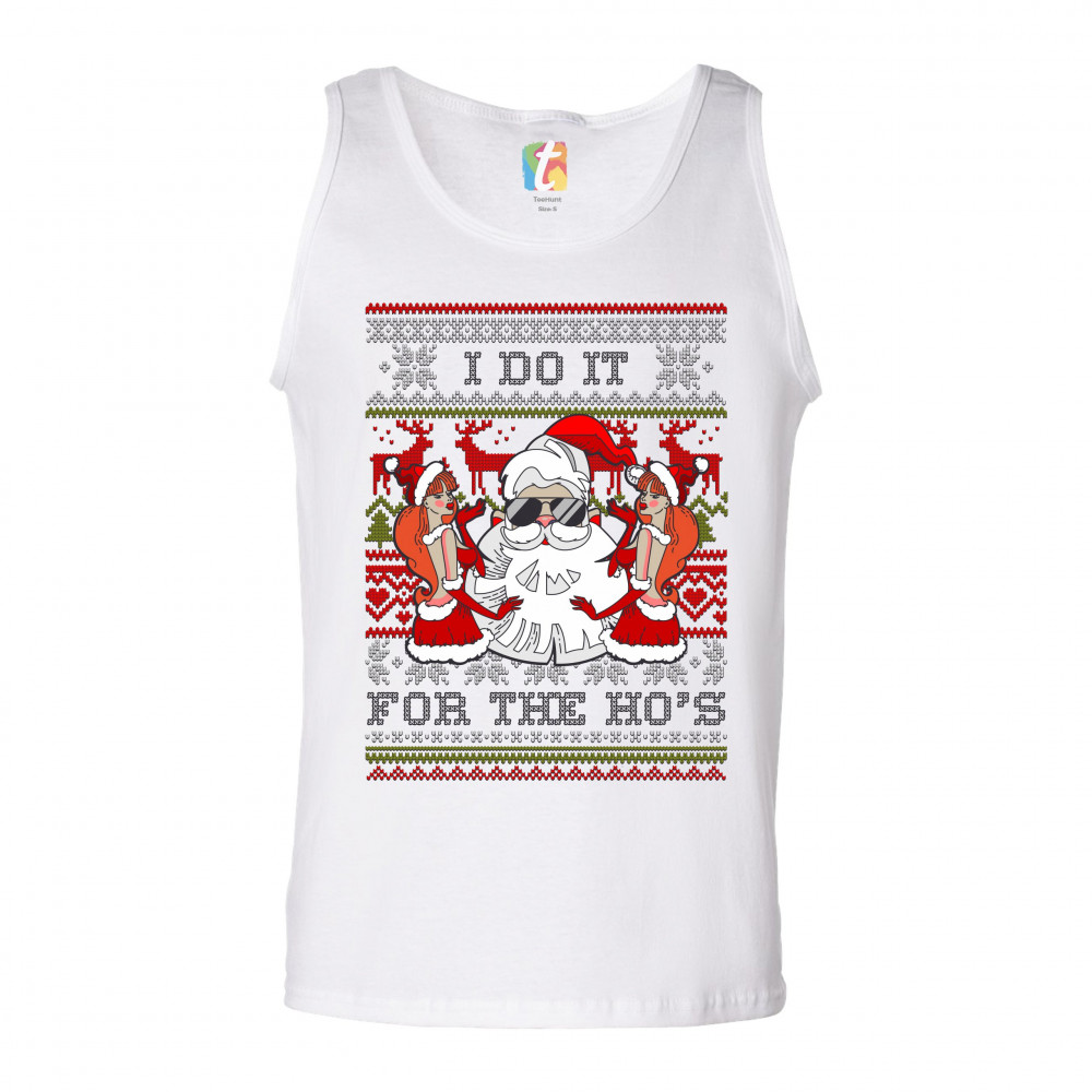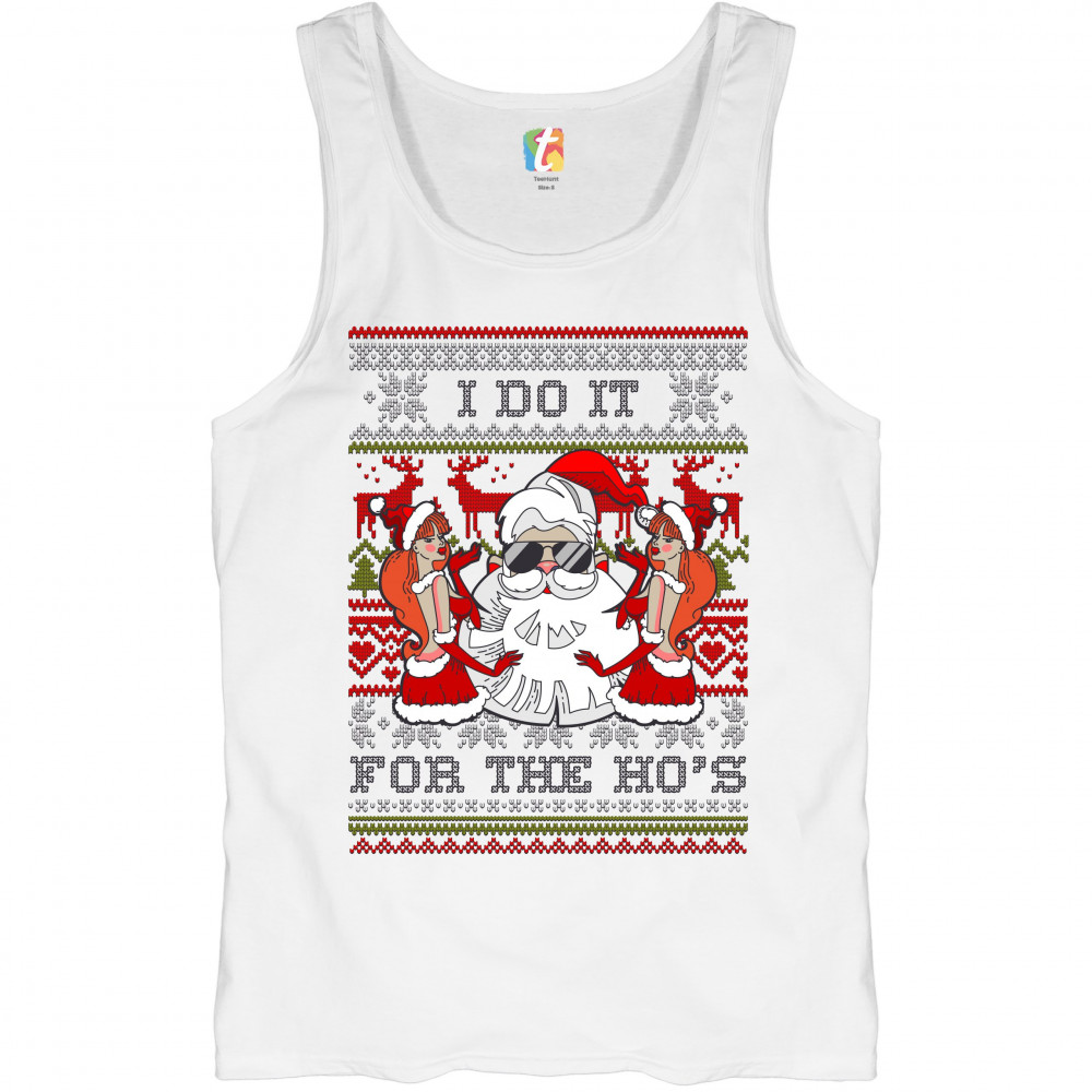 A funny print saying: "I do it for the ho's". It features a badass Santa Claus wearing sunglasses and two sexy girls in revealing Christmas outfits leaning on Santa's beard. The print is decorated wit the ugly sweater pattern in the background. Amazing ch