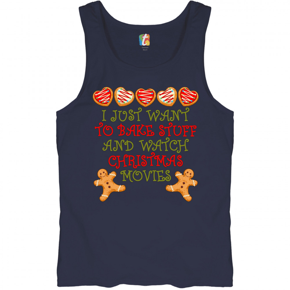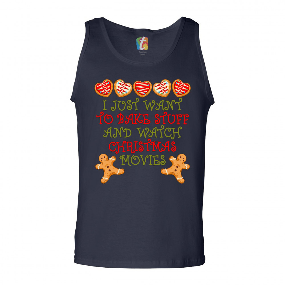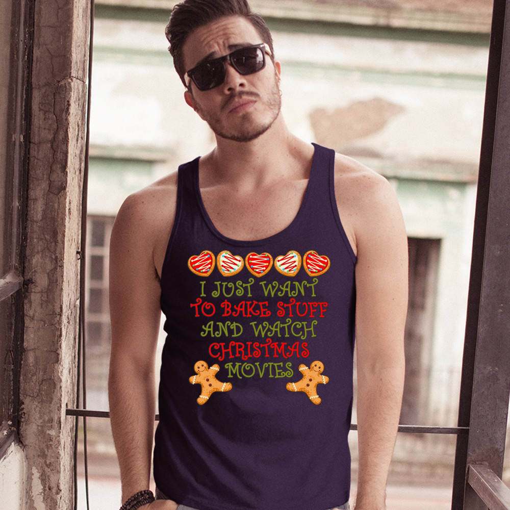 I JUST WANT TO BAKE STUFF AND WATCH CHRISTMAS MOVIES tank top xmas men's top navy blue