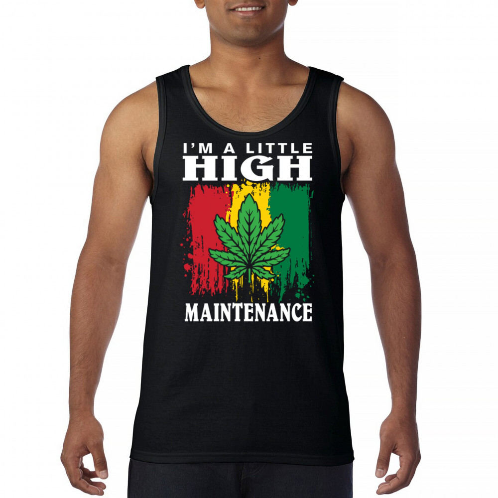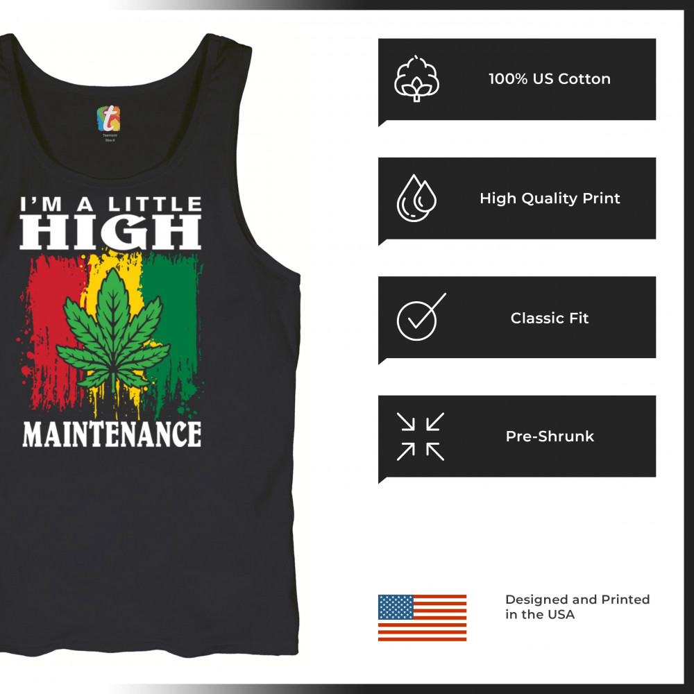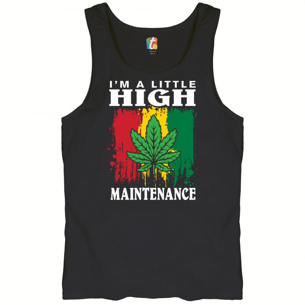 "I'm a Little High Maintenance" design with a bold cannabis leaf and vibrant background. Perfect for fans of Mary Jane, humor, and relaxed, trippy style.