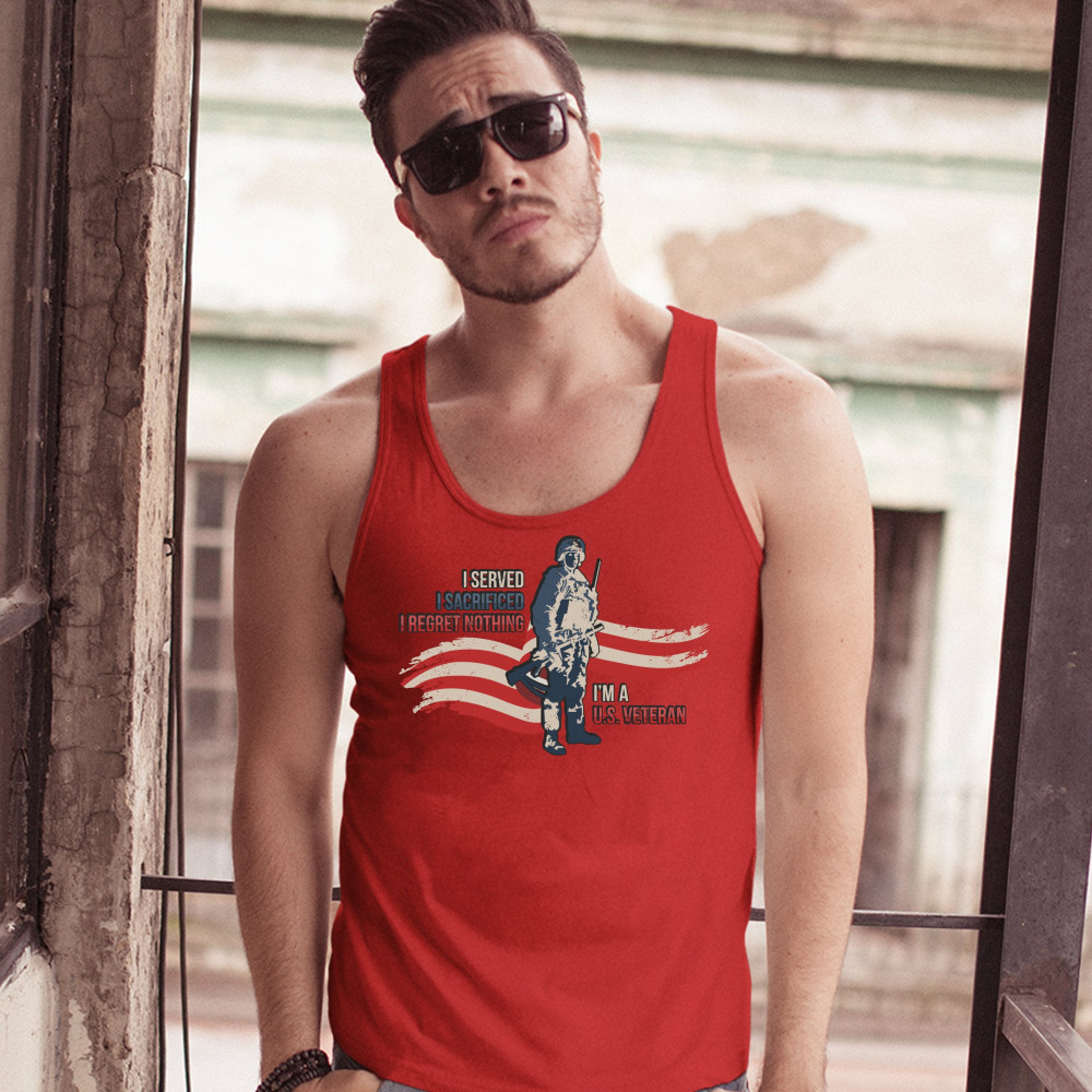 A patriotic print featuring a red-and-white stripe in the background and a soldier holding a rifle. The print says: "I Served I Sacrificed I Regreat Nothing I'm a U.S. Veteran". Great choice to wear on Independence Day or any other patriotic holiday.