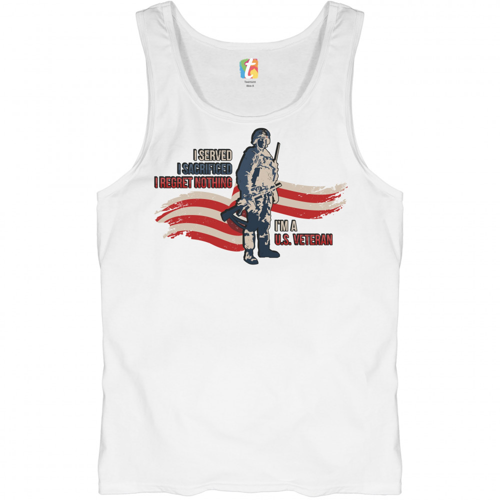 A patriotic print featuring a red-and-white stripe in the background and a soldier holding a rifle. The print says: "I Served I Sacrificed I Regreat Nothing I'm a U.S. Veteran". Great choice to wear on Independence Day or any other patriotic holiday.