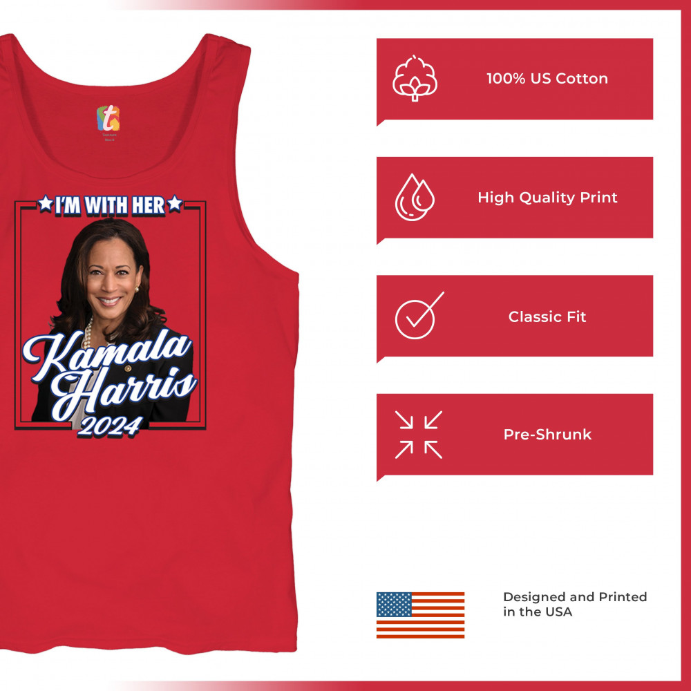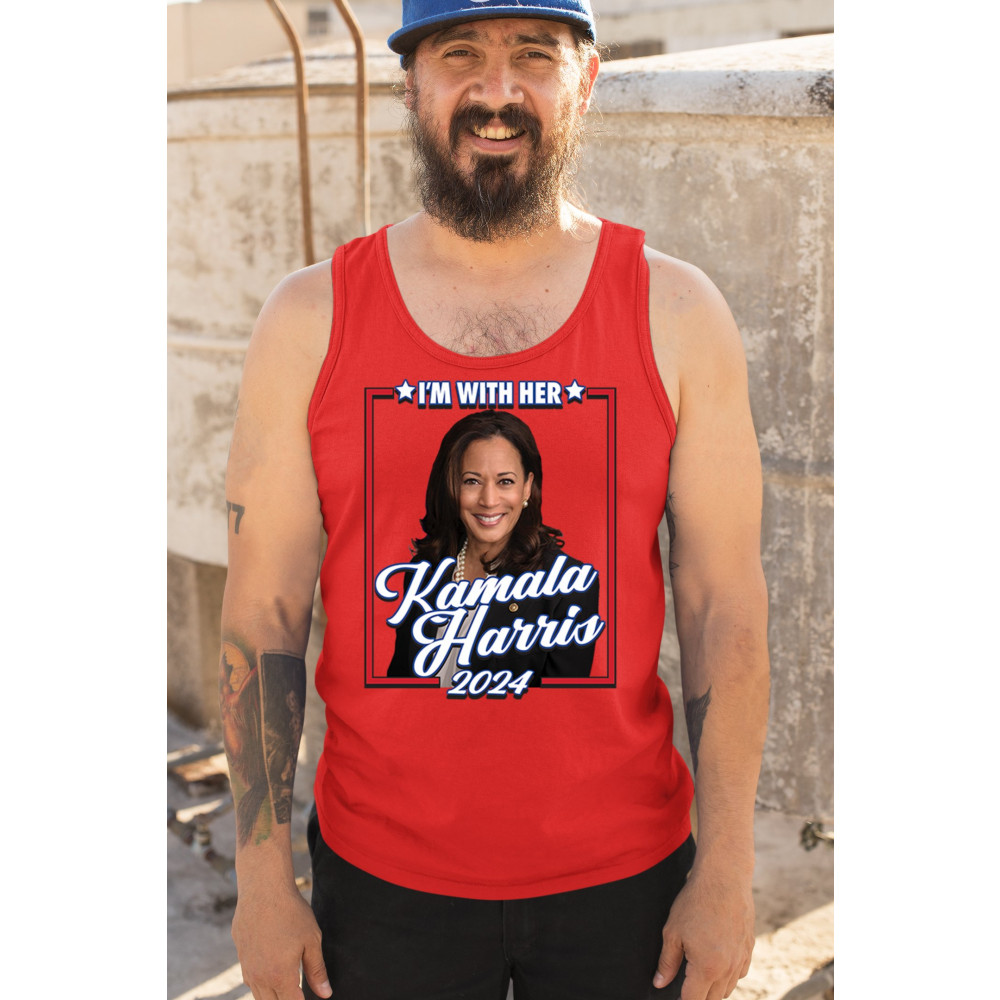 Stand with Kamala Harris in her 2024 presidential campaign with this vibrant design. Highlighting her commitment to progressive causes, this design is perfect for supporters of LGBTQ+ rights, women's rights, and social justice. Featuring the iconic "I'm With Her" slogan, it's a bold statement for anyone who believes in a brighter future. Wear it to rallies, events, or any day to show your support for Kamala Harris and her vision for America. A great addition to any supporter’s collection!