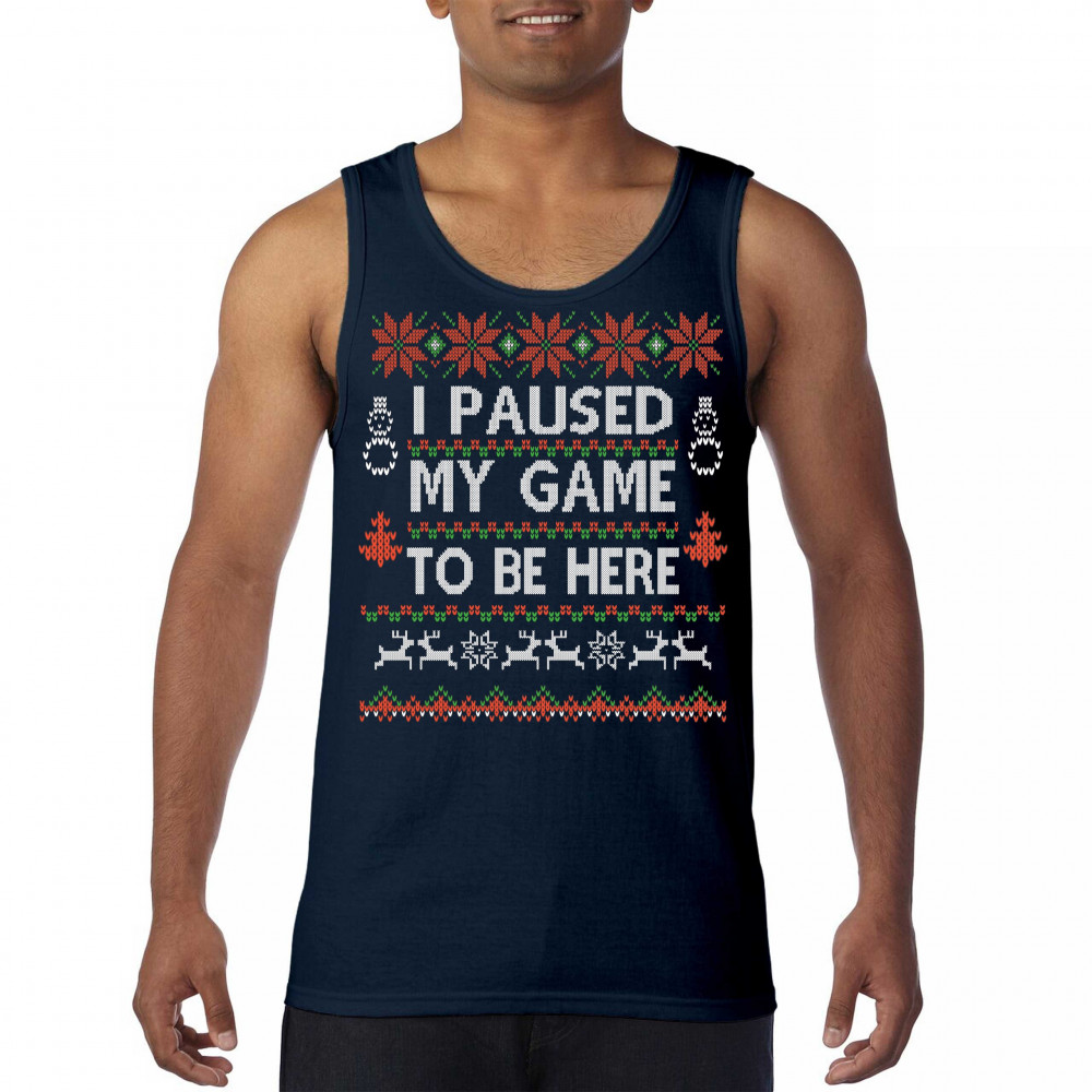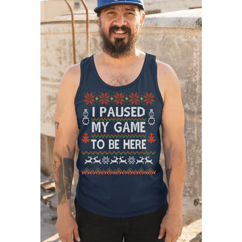 I PAUSED MY GAME TO BE HERE UGLY SWEATER THEME tank top christmas men's top navy blue