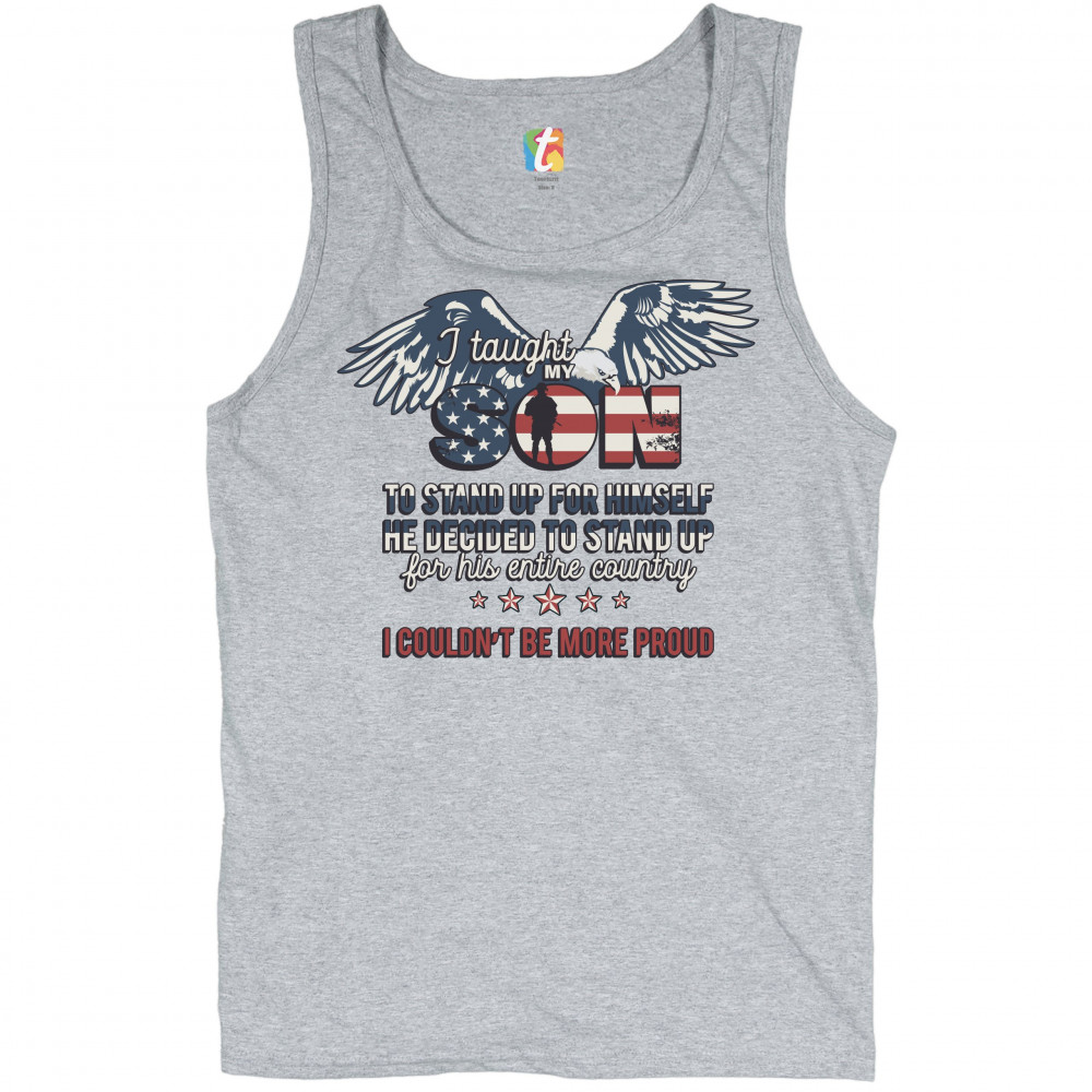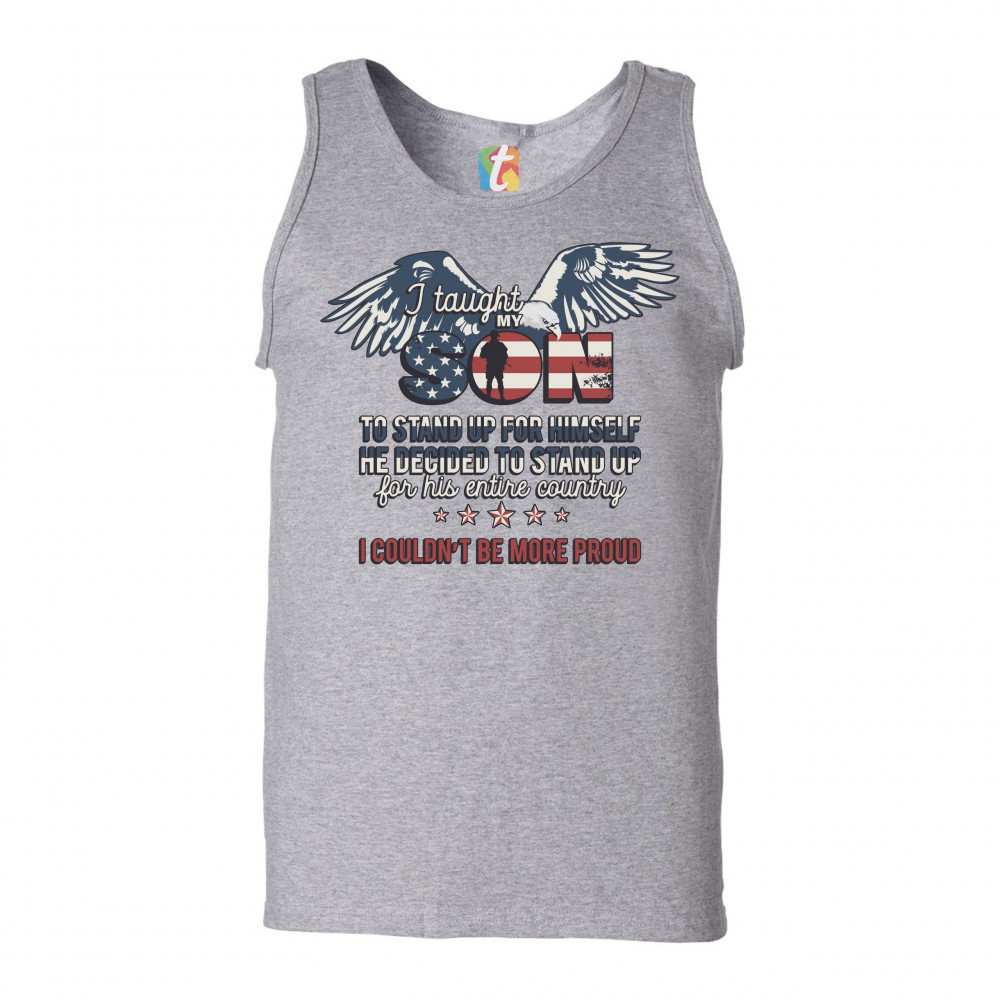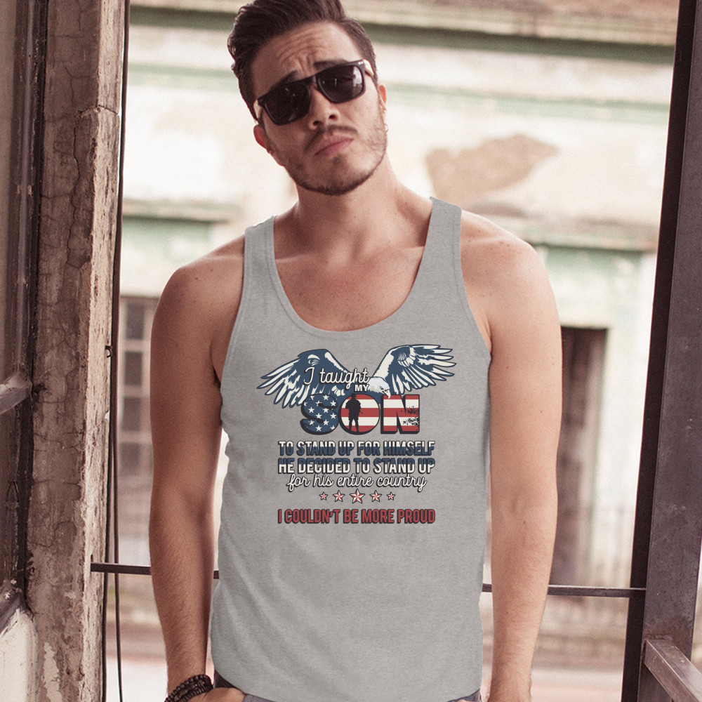 A patriotic print saying: "I Taught My Son to Stand up for Himself, He Decided to Stand Up for His Entire Country, I Couldn't Be More Proud". The print features a bald eagle, several stars and a small silhouette of a soldier inside of a letter "O" in "Son