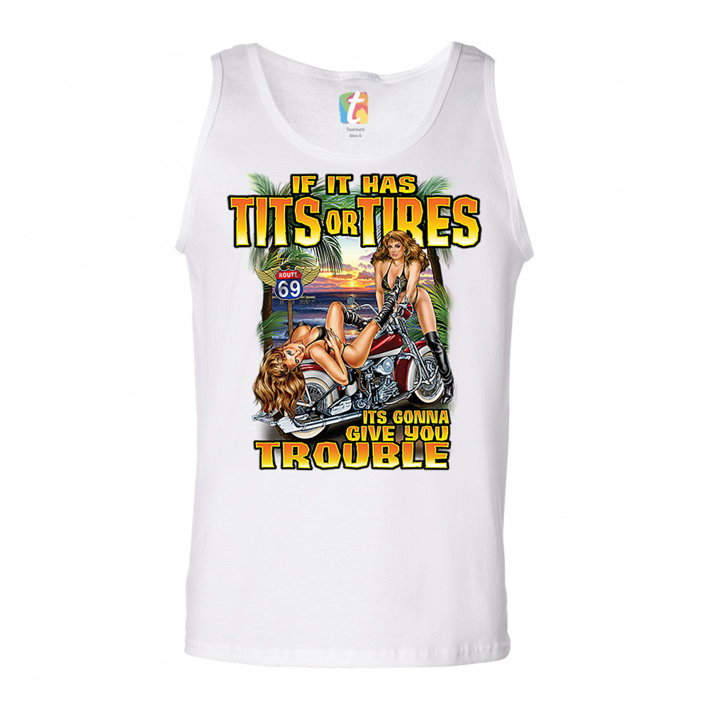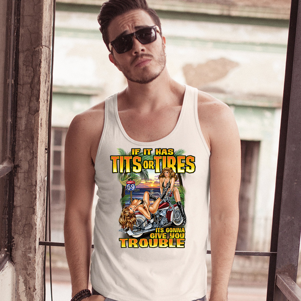 A print featuring two barely dressed sexy women leaning on a vintage motorcycle parked at the beach. There is a "Route 69" road sign in the background. The print says: "If it has tits or tires it's gonna give you trouble". A great choice for a motorcycle
