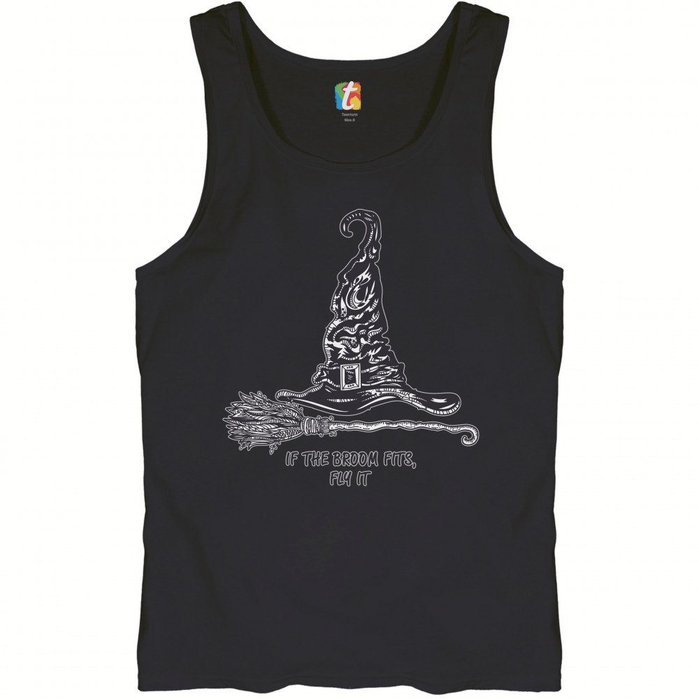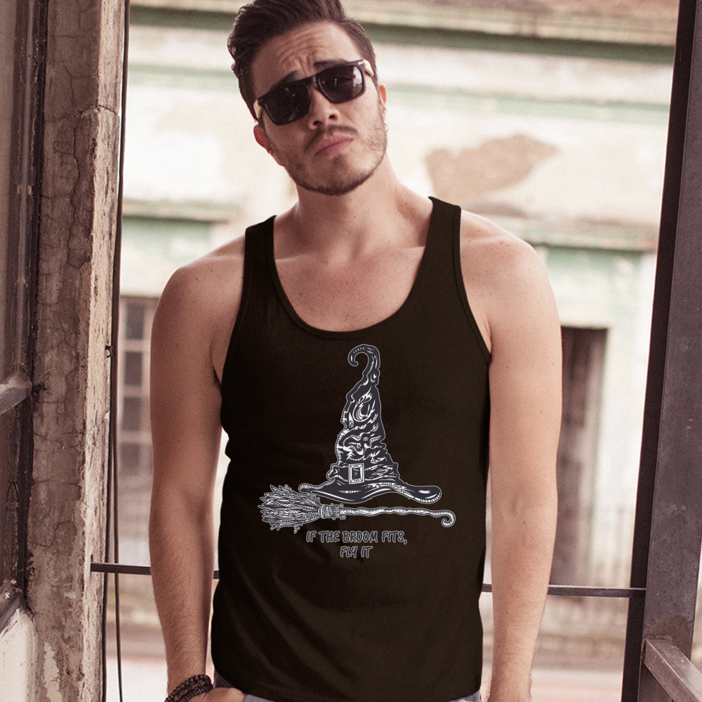IF THE BROOM FITS, FLY IT tank top funny witch hat halloween men's top black