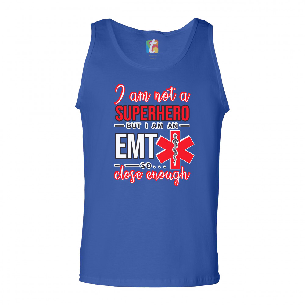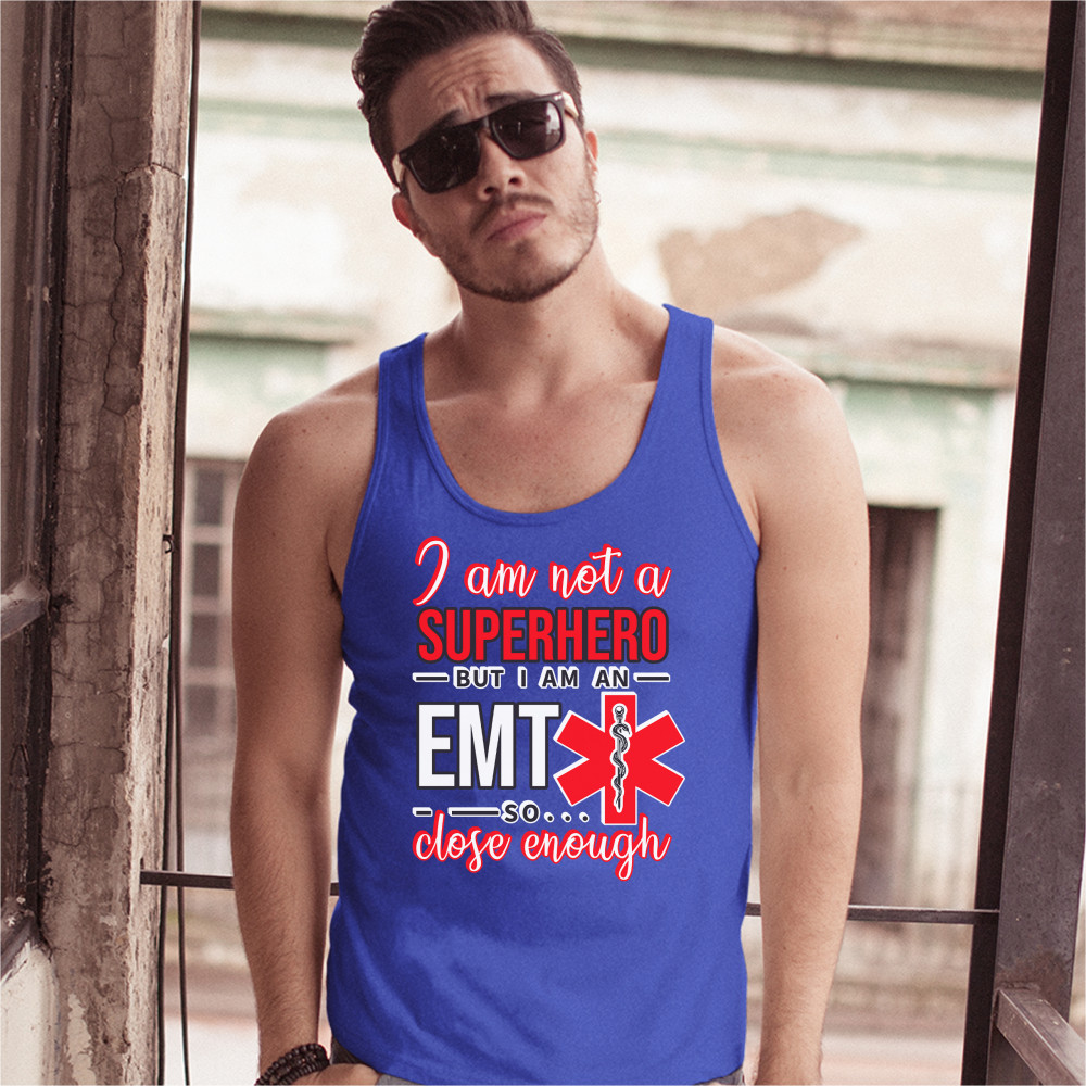 A funny print saying "I'm Not a Superhero But I'm an EMT so Close Enough". All words are written in different fonts. The print also includes the Star of Life, the worldwide recognized symbol of emergency medical services, with the Rod of Asclepius inside of it. A great choice as a gift for a first responder.