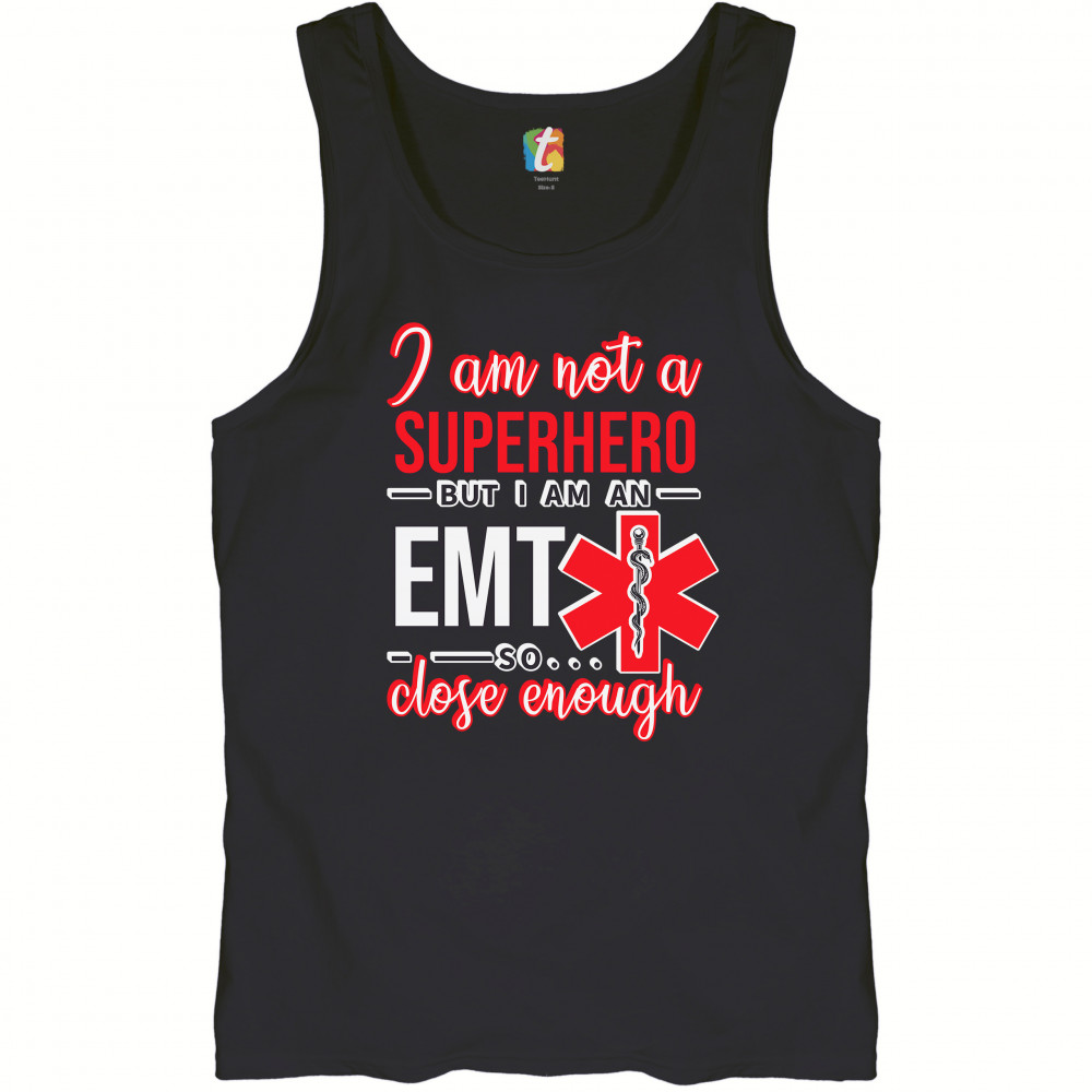 A funny print saying "I'm Not a Superhero But I'm an EMT so Close Enough". All words are written in different fonts. The print also includes the Star of Life, the worldwide recognized symbol of emergency medical services, with the Rod of Asclepius inside of it. A great choice as a gift for a first responder.