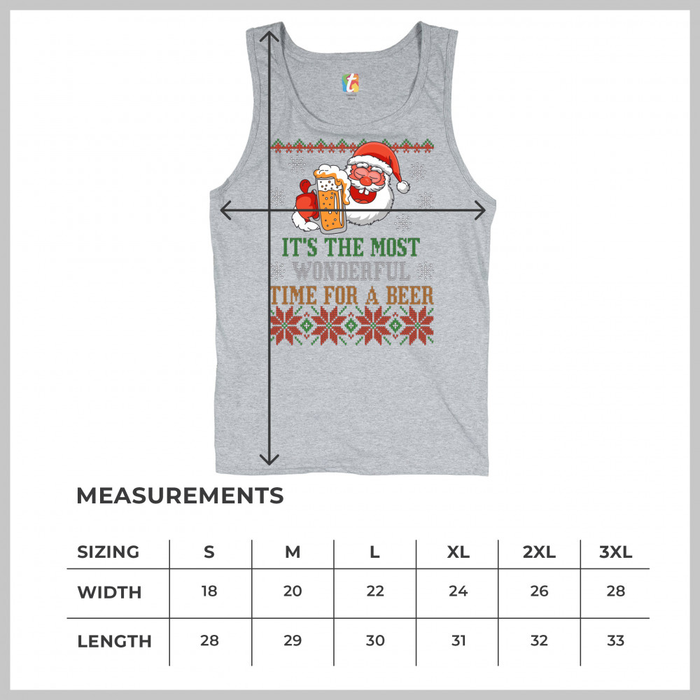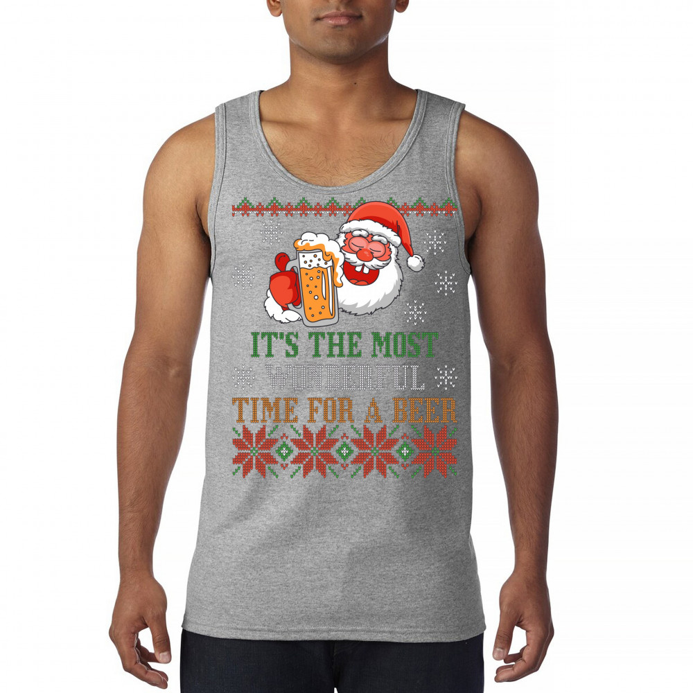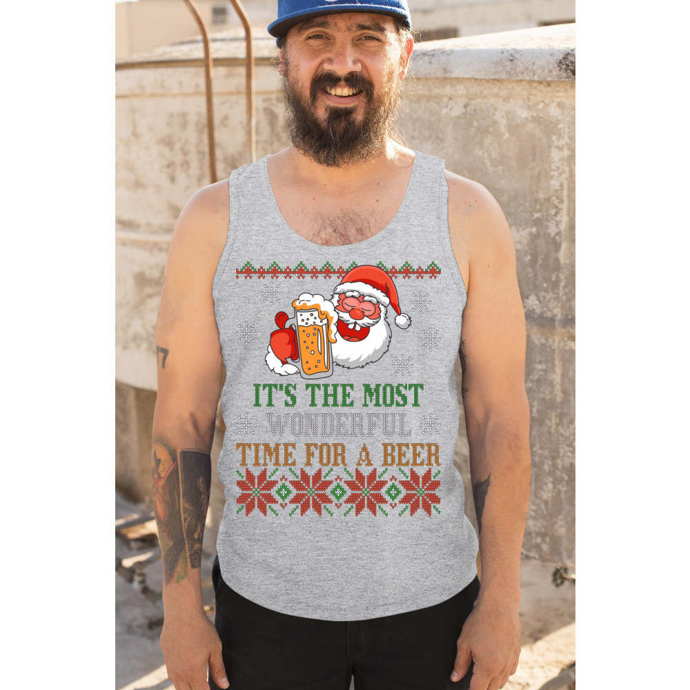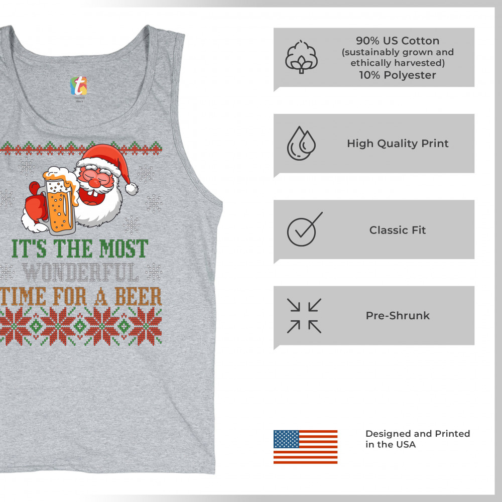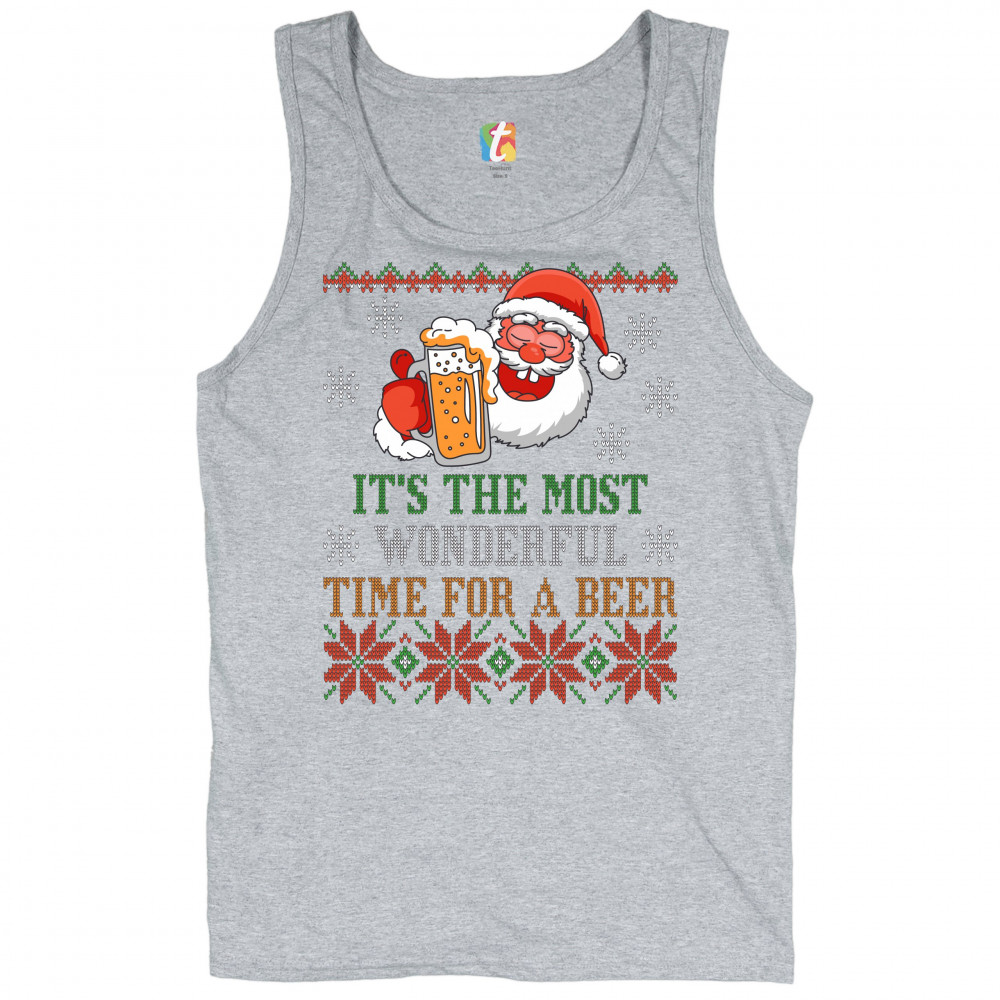 A print saying: "It's the Most Wonderful Time for a Beer" and featuring Santa Claus holding a glass of beer. The print is designed as an ugly sweater. Amazing choice for a single person who wants to make people smile and spread positive vibes on Christmas