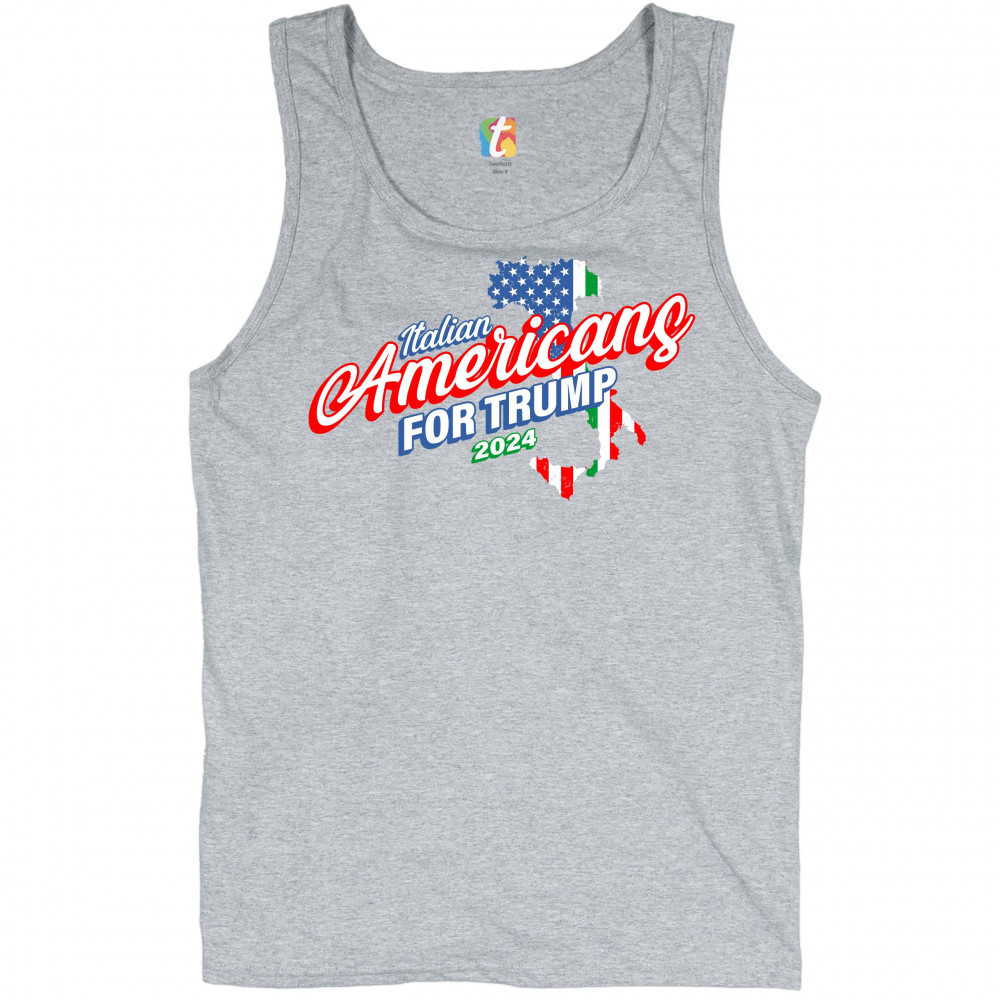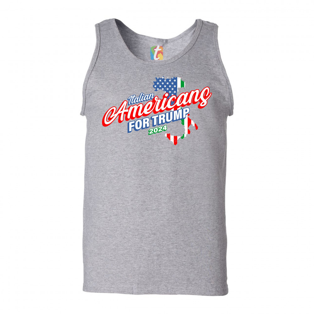 A political print saying "Italian Americans for Trump 2024". The print features a silhouette of Italy in the background with parts of the American and Italian flags inside of it. A great choice to wear for a Trump rally or give as a gift to a Donald Trump