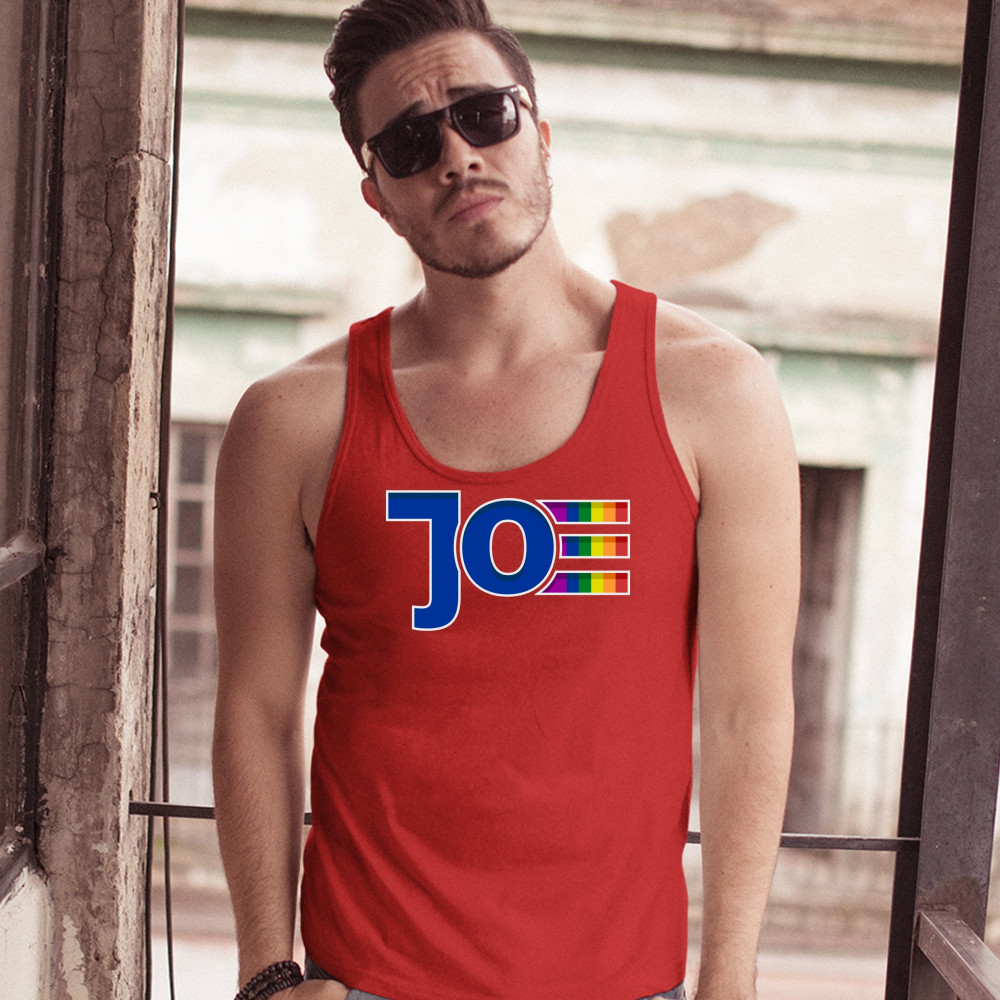 A political print featuring the name of the democratic presidential candidate "Joe". The letter "e" is painted with the colors of the lgbt rainbow. It is a great choice to wear to show your support for the democratic presidential nominee and his vice pres