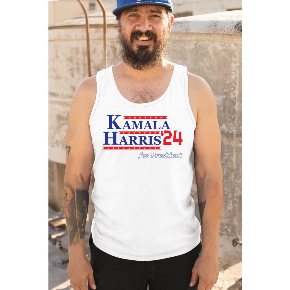Celebrate your support for Kamala Harris with this striking design. Featuring "Kamala Harris '24" in patriotic red, white, and blue, this piece is perfect for anyone dedicated to the 2024 presidential campaign. Whether you're attending a rally, a campaign event, or simply want to show your support, this design is ideal. Stand with Kamala Harris and advocate for liberal, democratic values, and the empowerment of minority communities. Perfect for supporters of black Americans, Hispanic Americans, and the LGBTQ community.