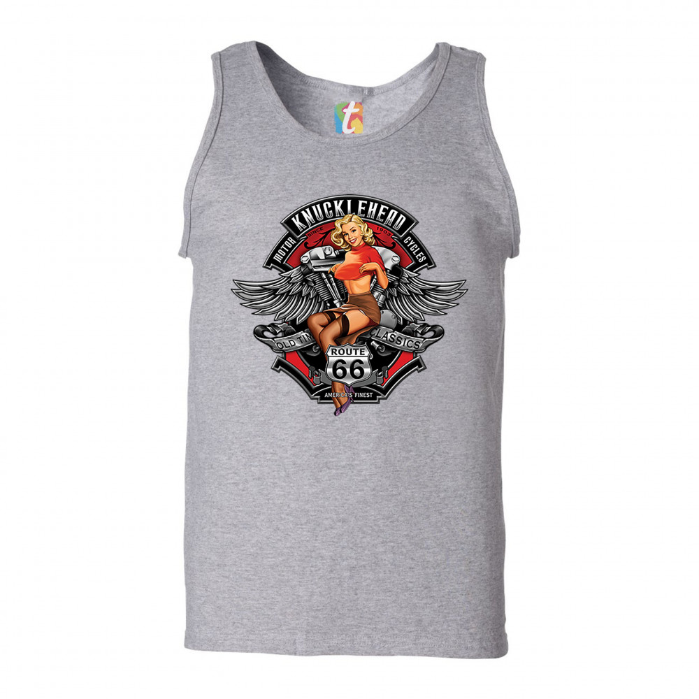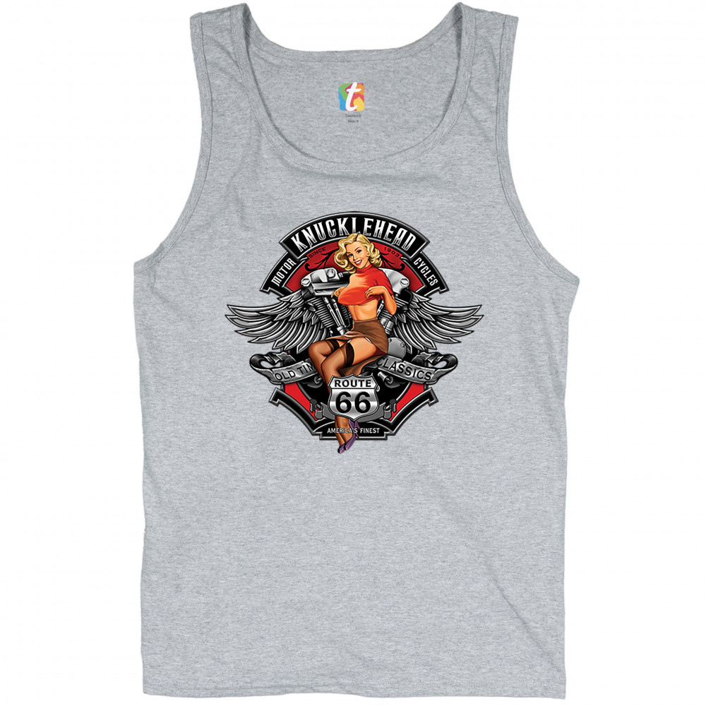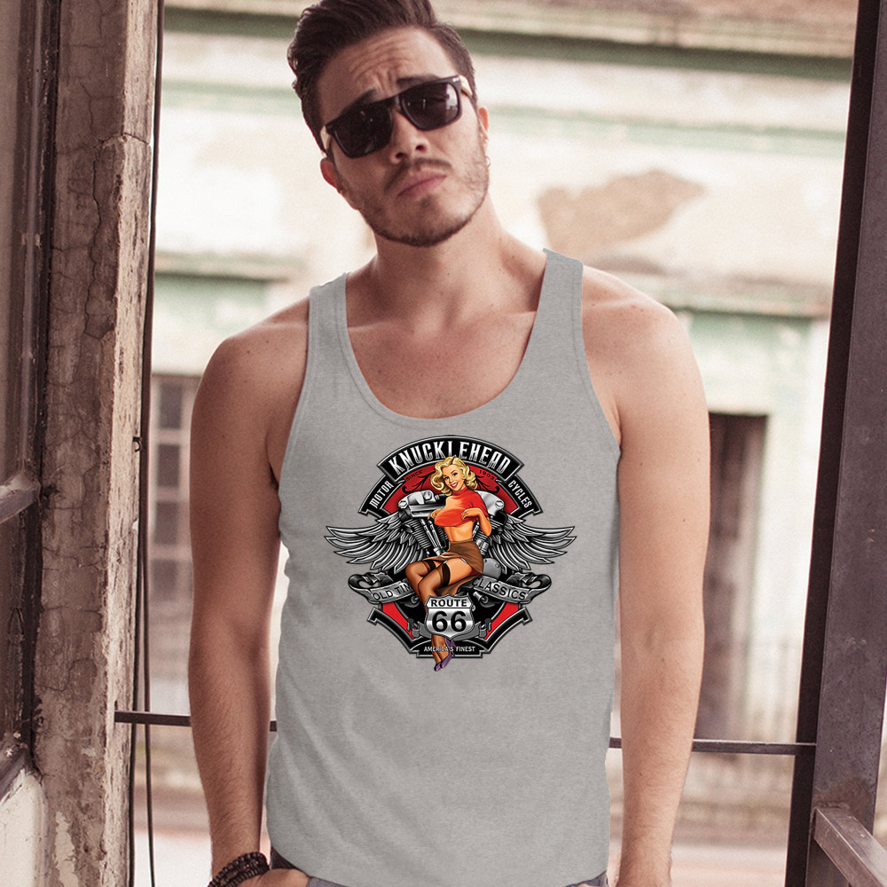 A print featuring a sexy pin-up girl. In front of her legs there is a "Route 66" sign. In the background there is a motorcycle engine and wings behind it. The print says: "Knucklehead motorcycles since 1903. Old time classics. America's finest". A great c