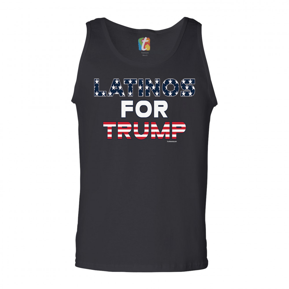A political print saying "Latinos for Trump". The letters contain the Stars and Stripes of the American flag inside of them. A great choice to wear for a Trump rally or give as a gift to a Donald Trump and Mike Pence supporter before 2020 presidential elections.