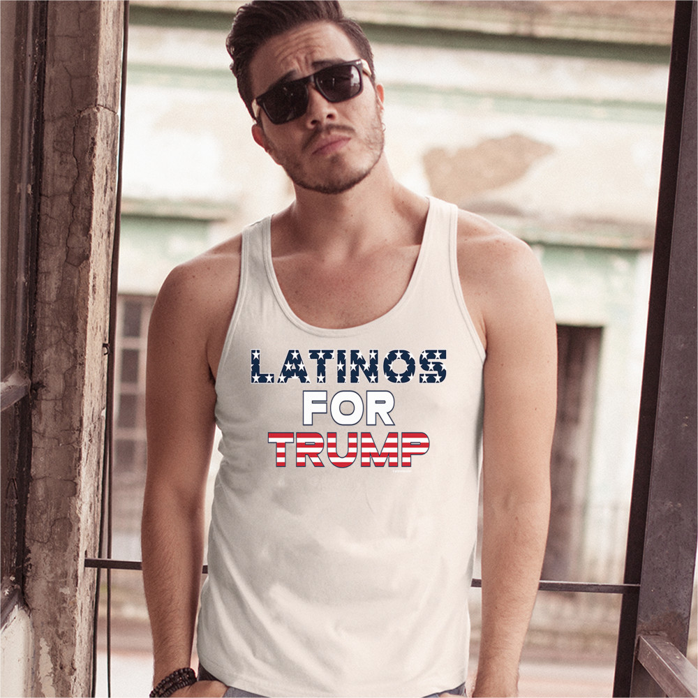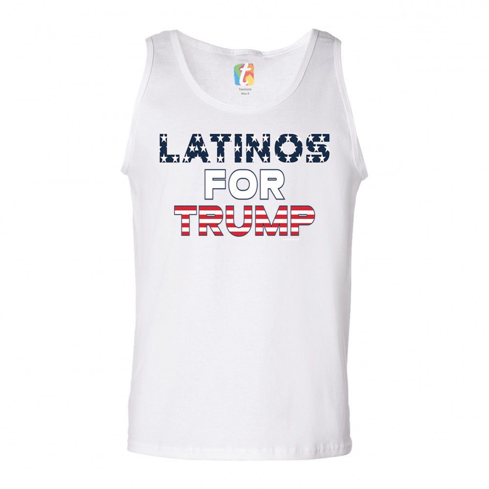 A political print saying "Latinos for Trump". The letters contain the Stars and Stripes of the American flag inside of them. A great choice to wear for a Trump rally or give as a gift to a Donald Trump and Mike Pence supporter before 2020 presidential elections.