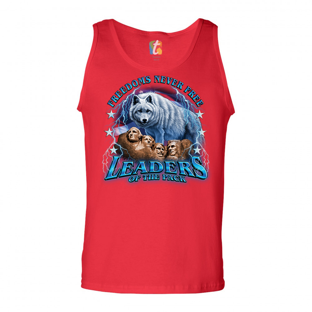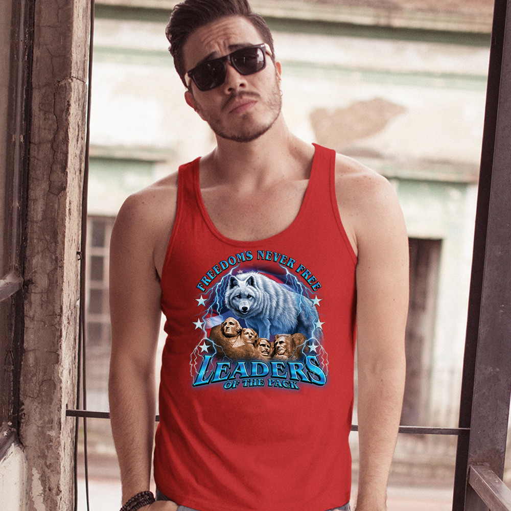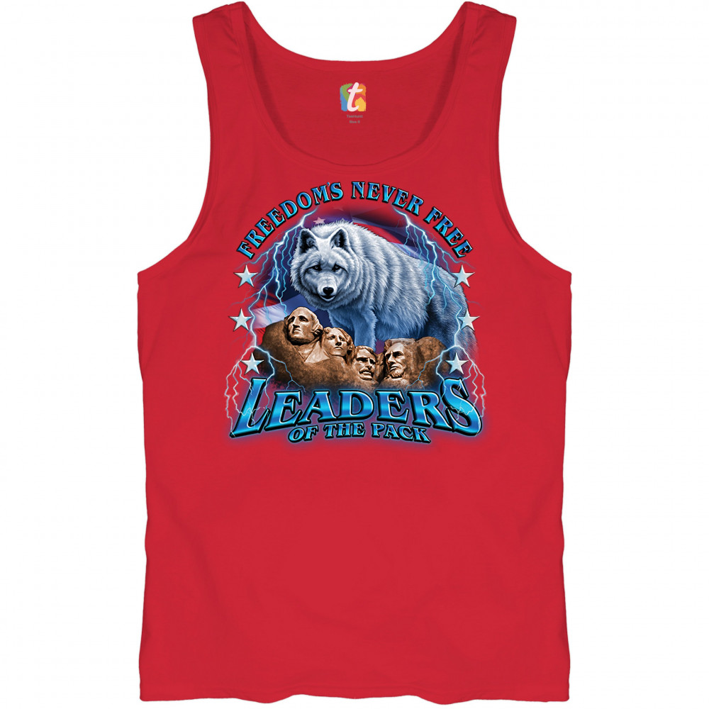 A patriotic print featuring the Mount Rushmore. There is a huge white wolf with the American flag in the background and lightning strikes all over the place. The print says: "Freedom's Never Free, Leaders of the Pack". Great choice to wear on Independence