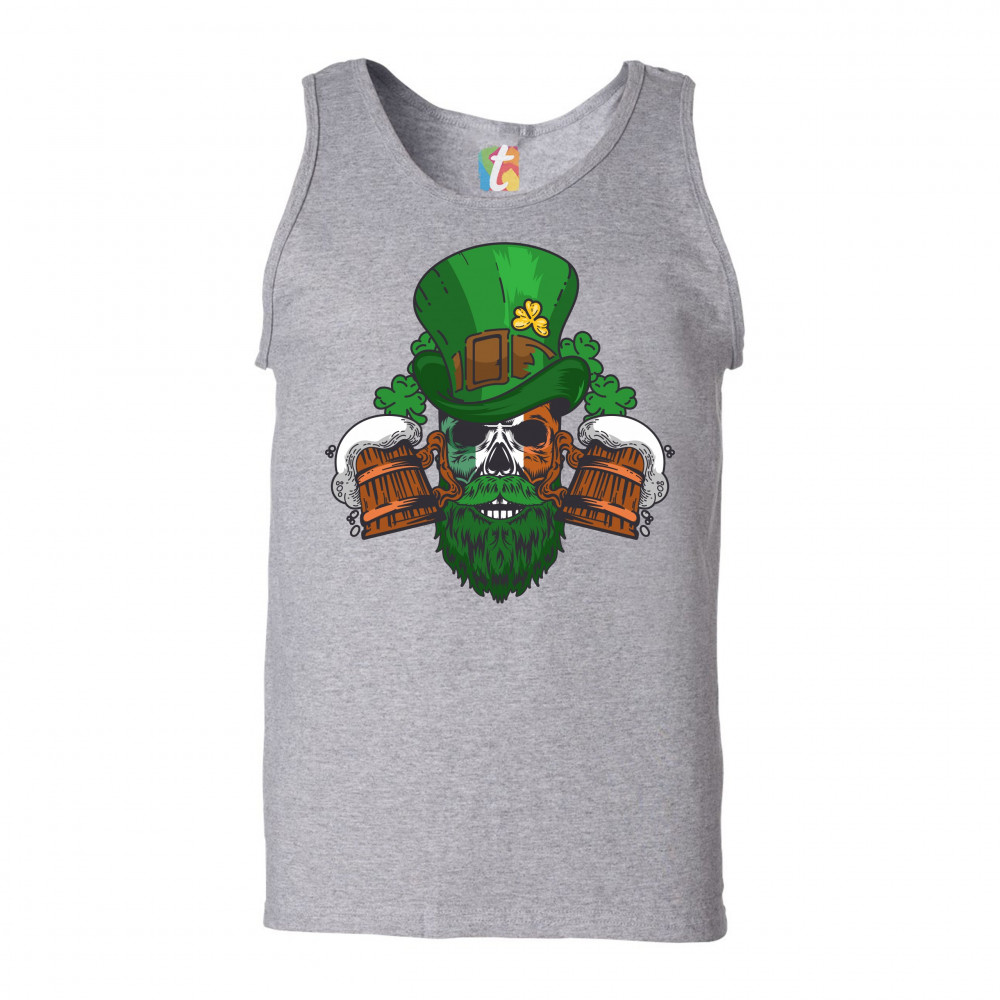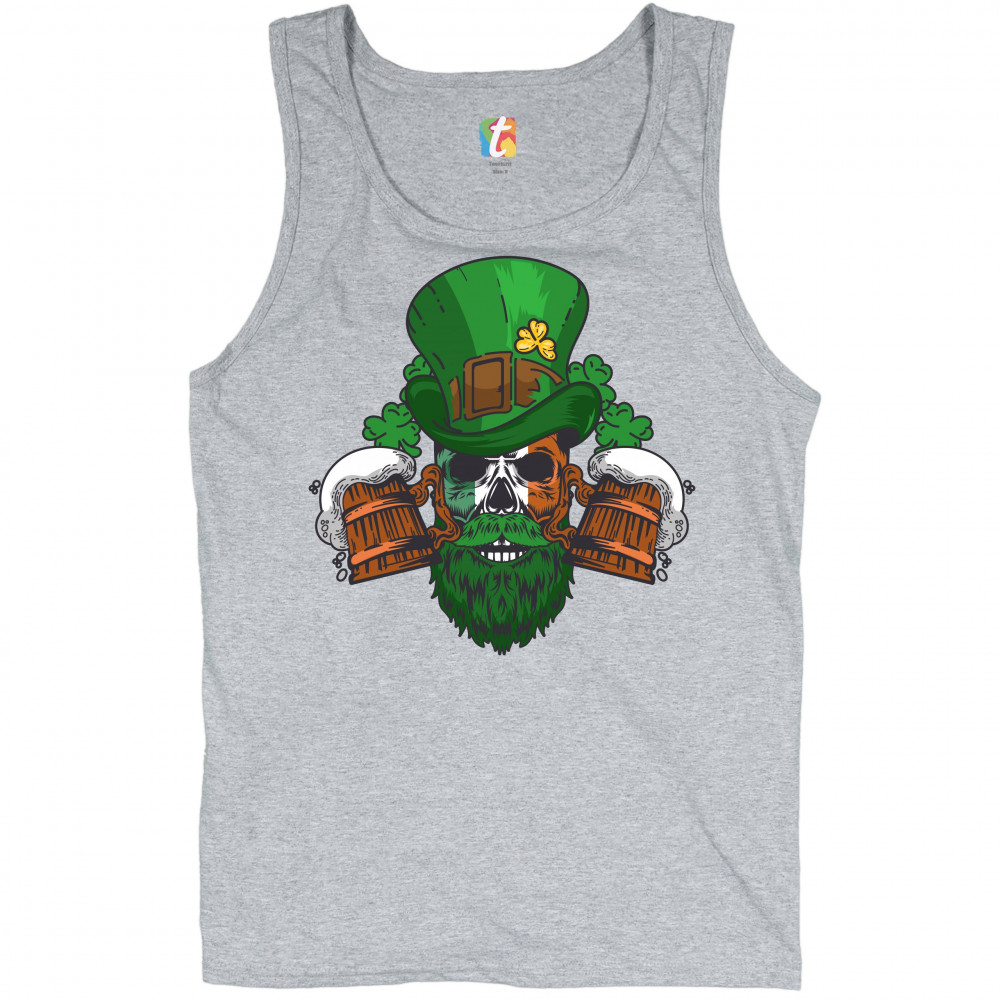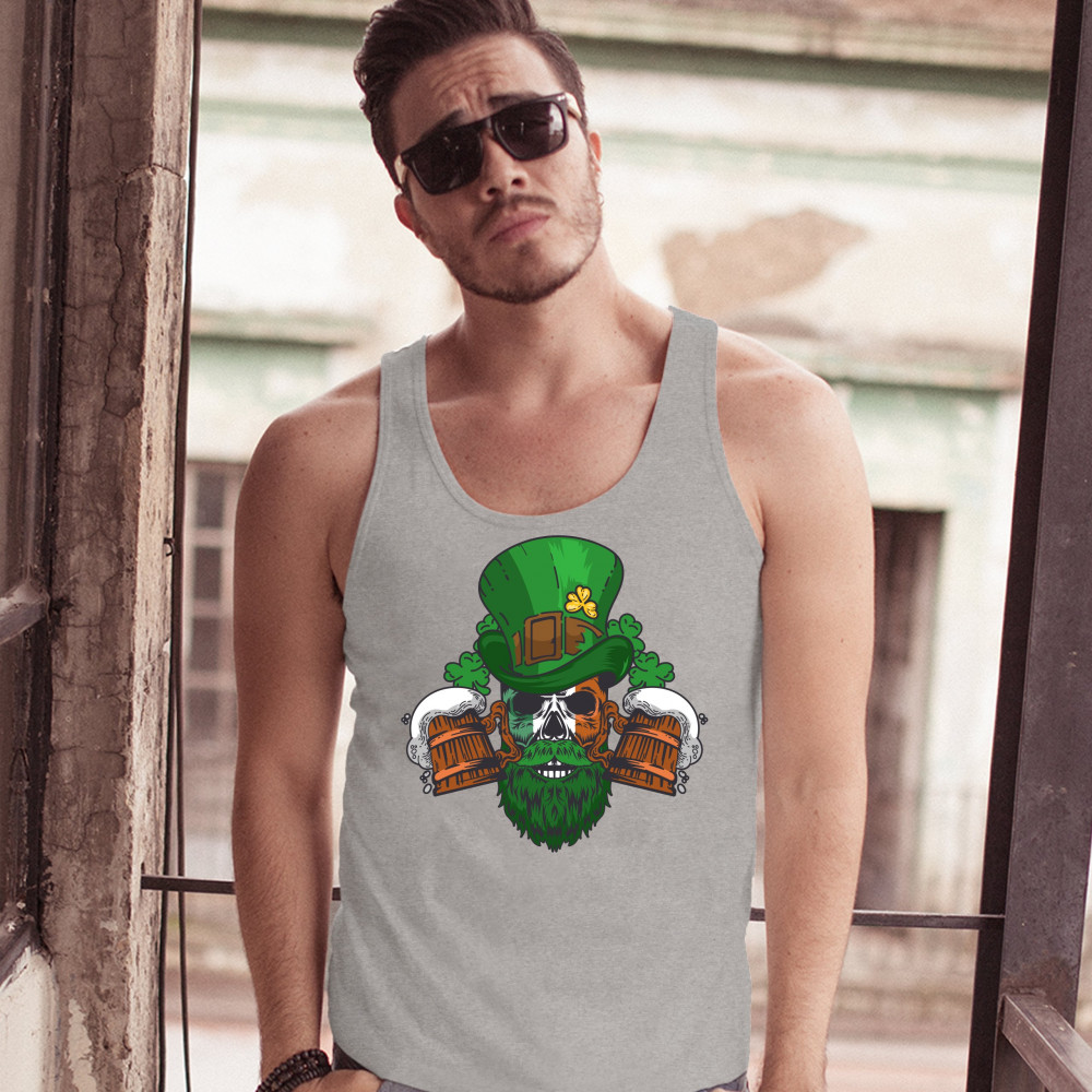 A print featuring a skull with green beard and Irish flag face. The skull is wearing a leprechaun hat. There are two beer mugs and numerous shamrocks around the skull. A great choice to wear on March 17 to celebrate the St. Patrick's Day and showcase your