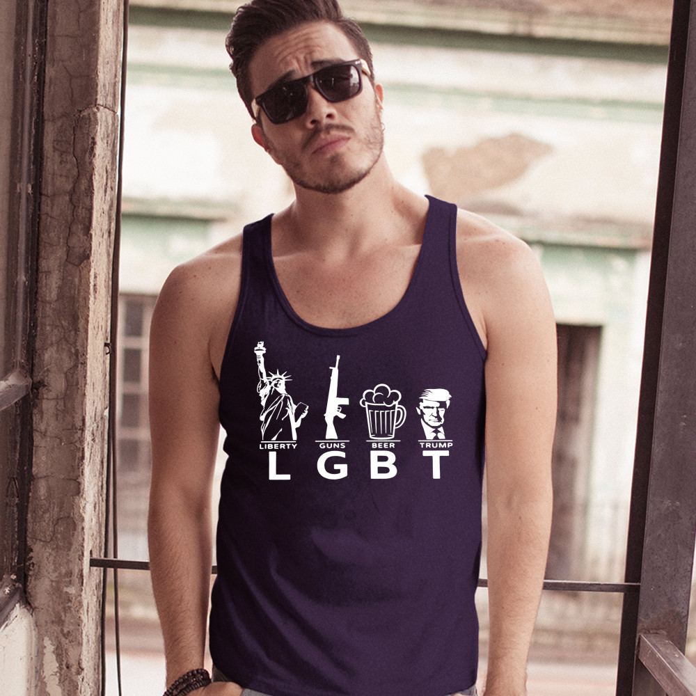 A funny political print featuring big letters LGBT, which stand for "Liberty, Guns, Beer and Trump". Above each word there are an underlined images of the Statue of Liberty, a rifle, a glass of beer and a picture of Donald Trump respectively. A great choi