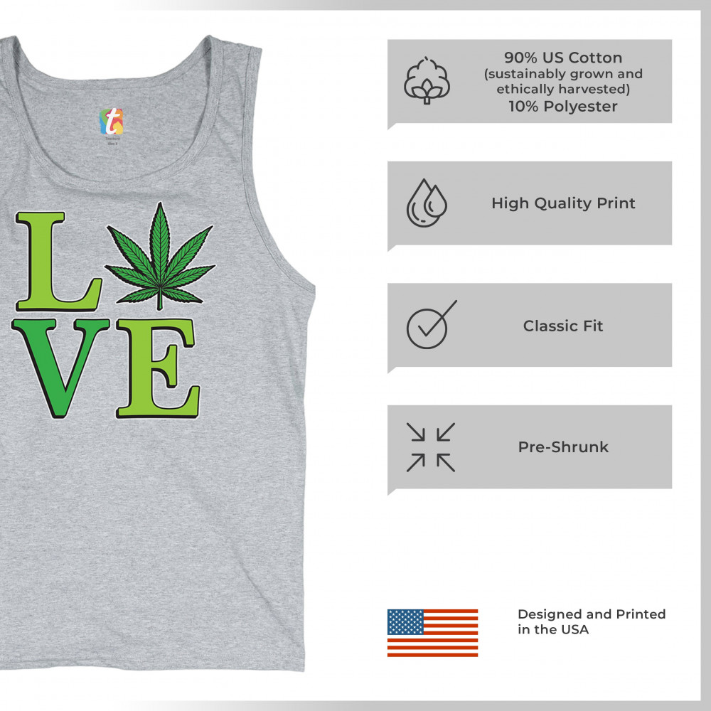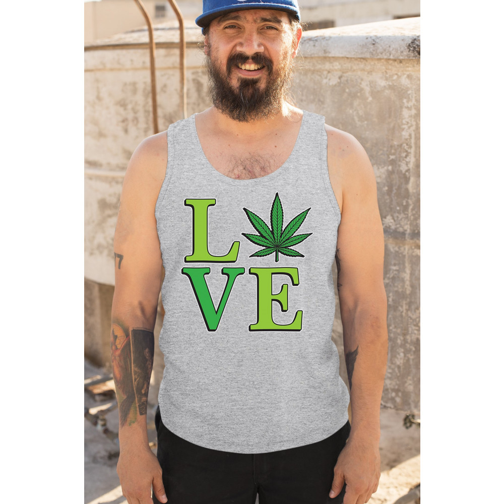 LOVE design with a bold weed leaf. Perfect for 420 fans, stoners, cannabis lifestyle wear, green pride, and marijuana lovers.