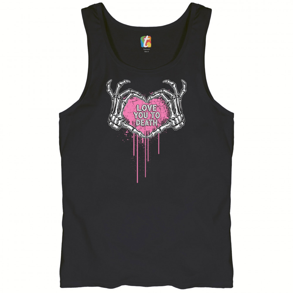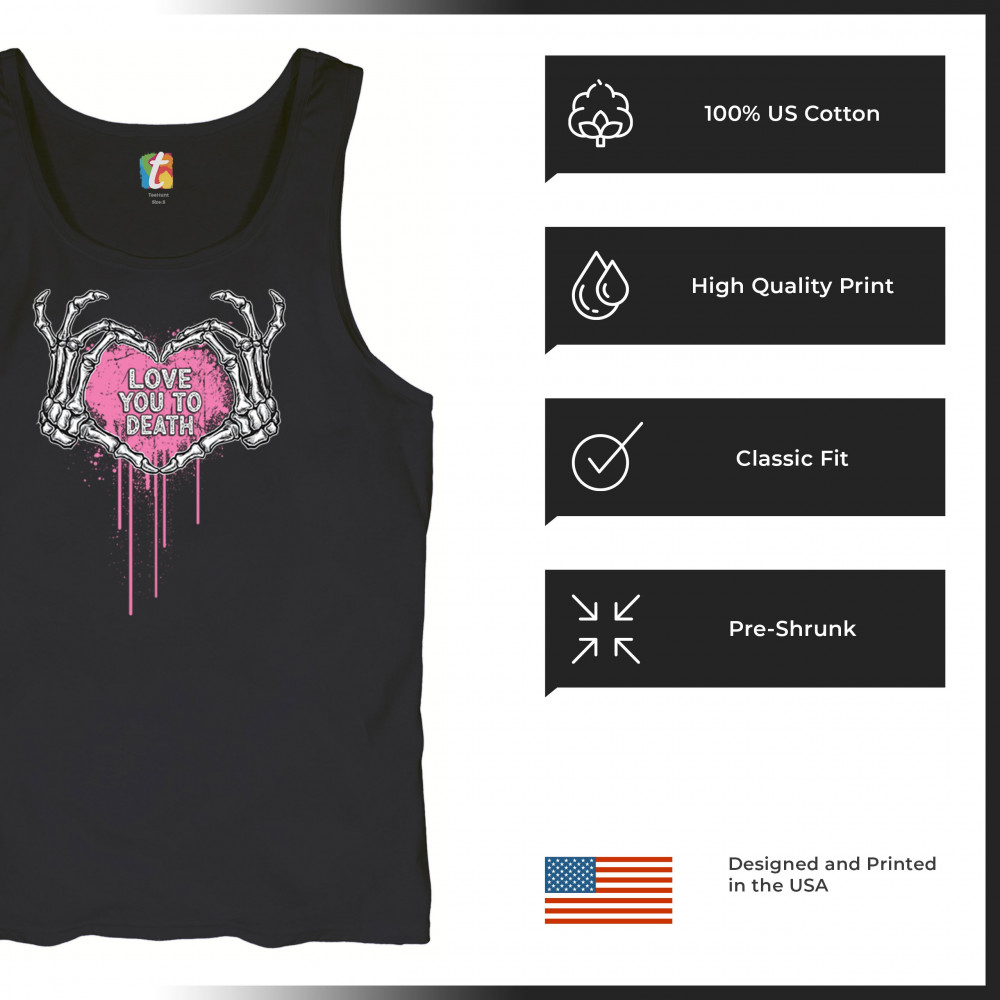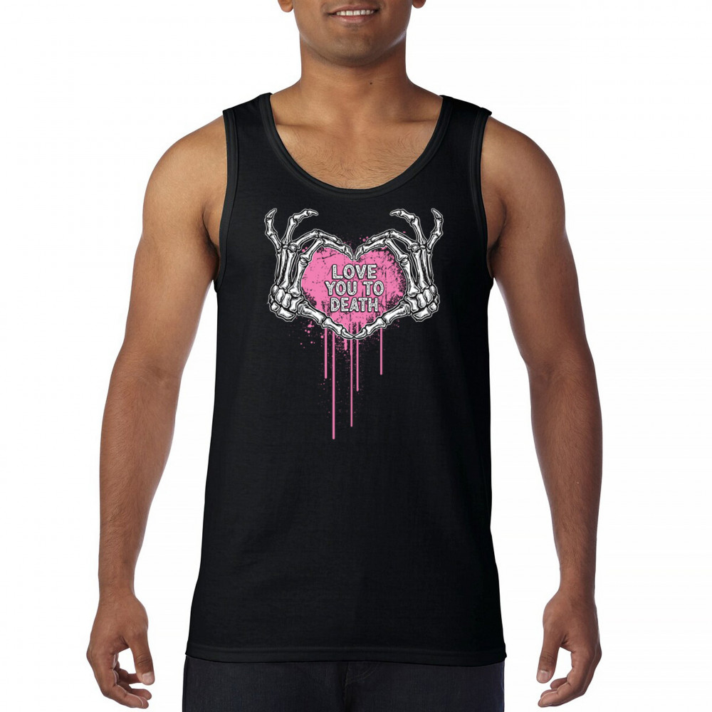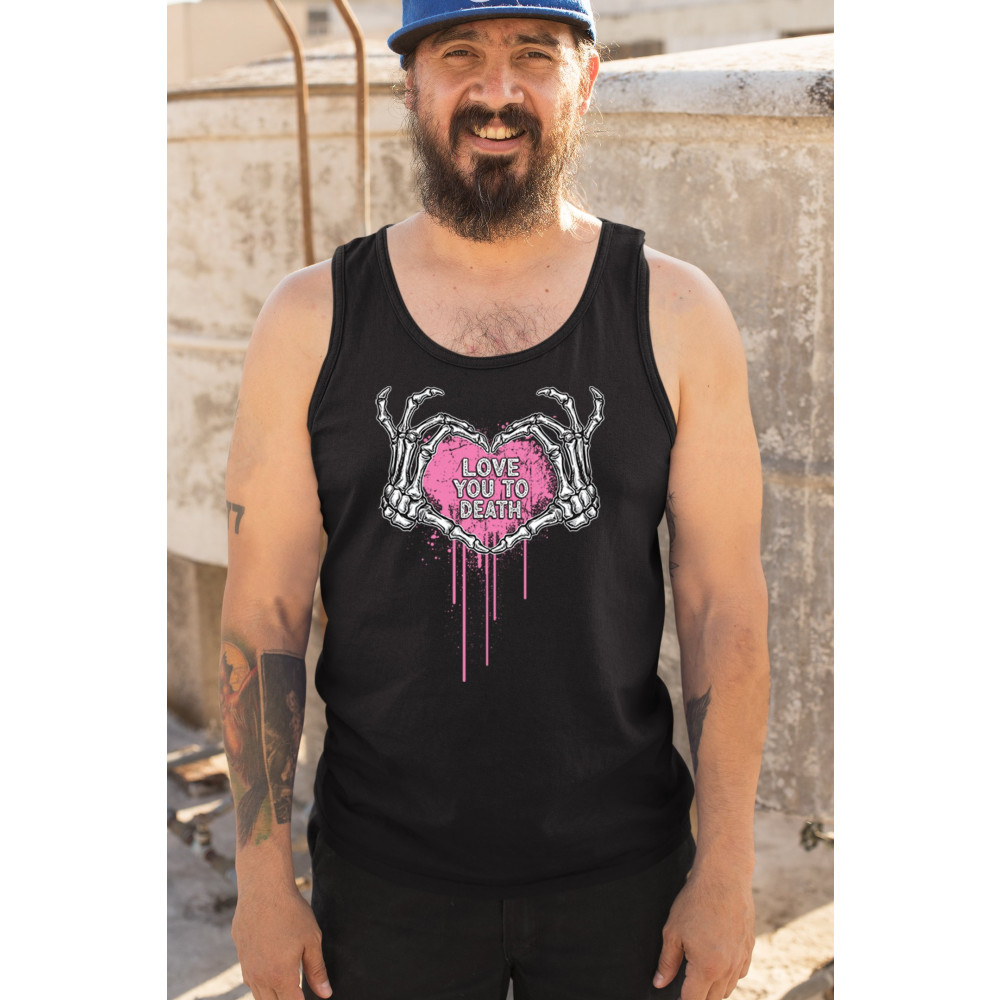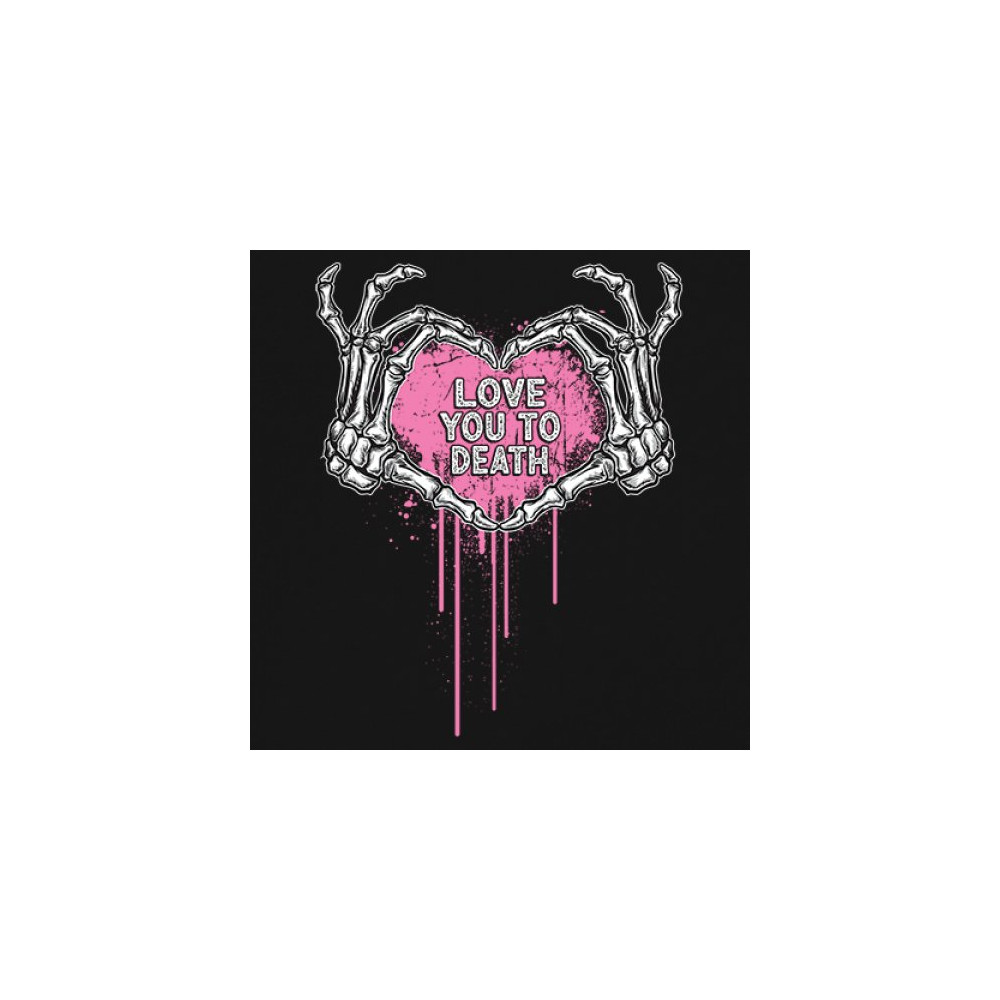 Show your spooky side with this skeleton hands heart design featuring a pink background and the phrase "Love You to Death." A perfect piece for alternative couples, Halloween lovers, and romantic rebels who embrace both affection and dark humor. Great for spooky season, date nights, and alt fashion outfits.