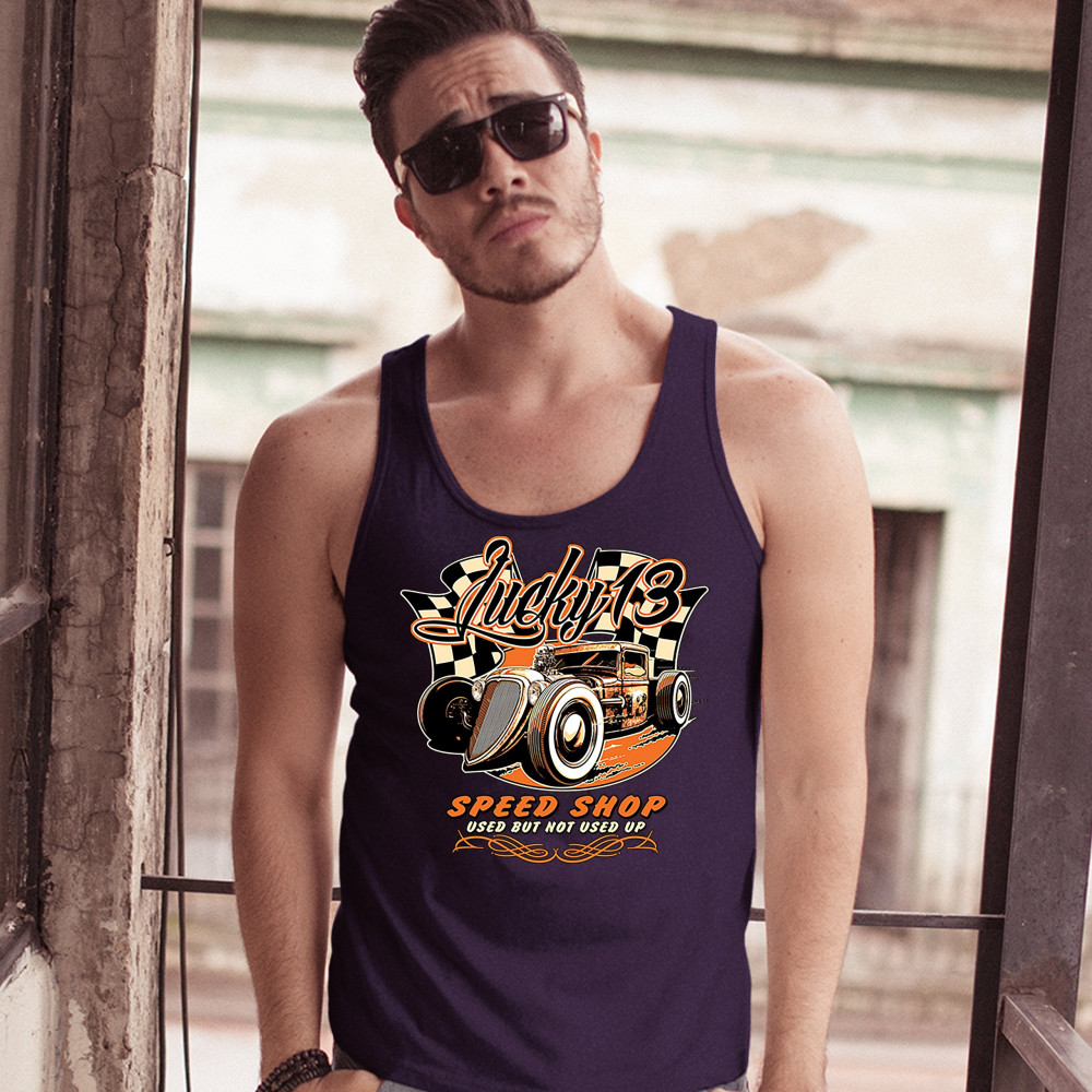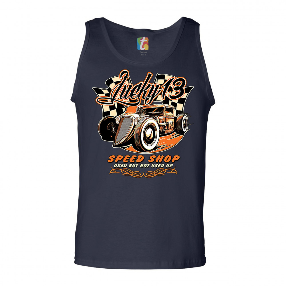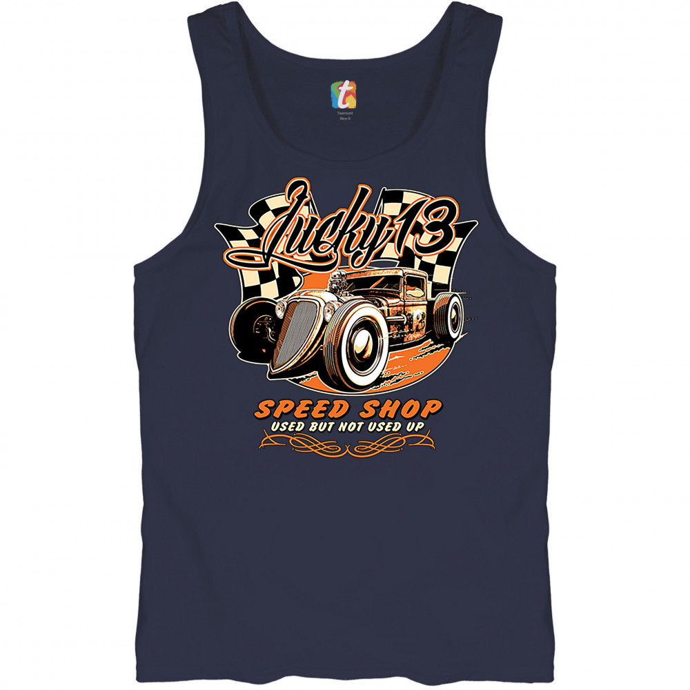 LUCKY 13 SPEED SHOP tank top rat rod route 66 vintage racing car men's top navy blue