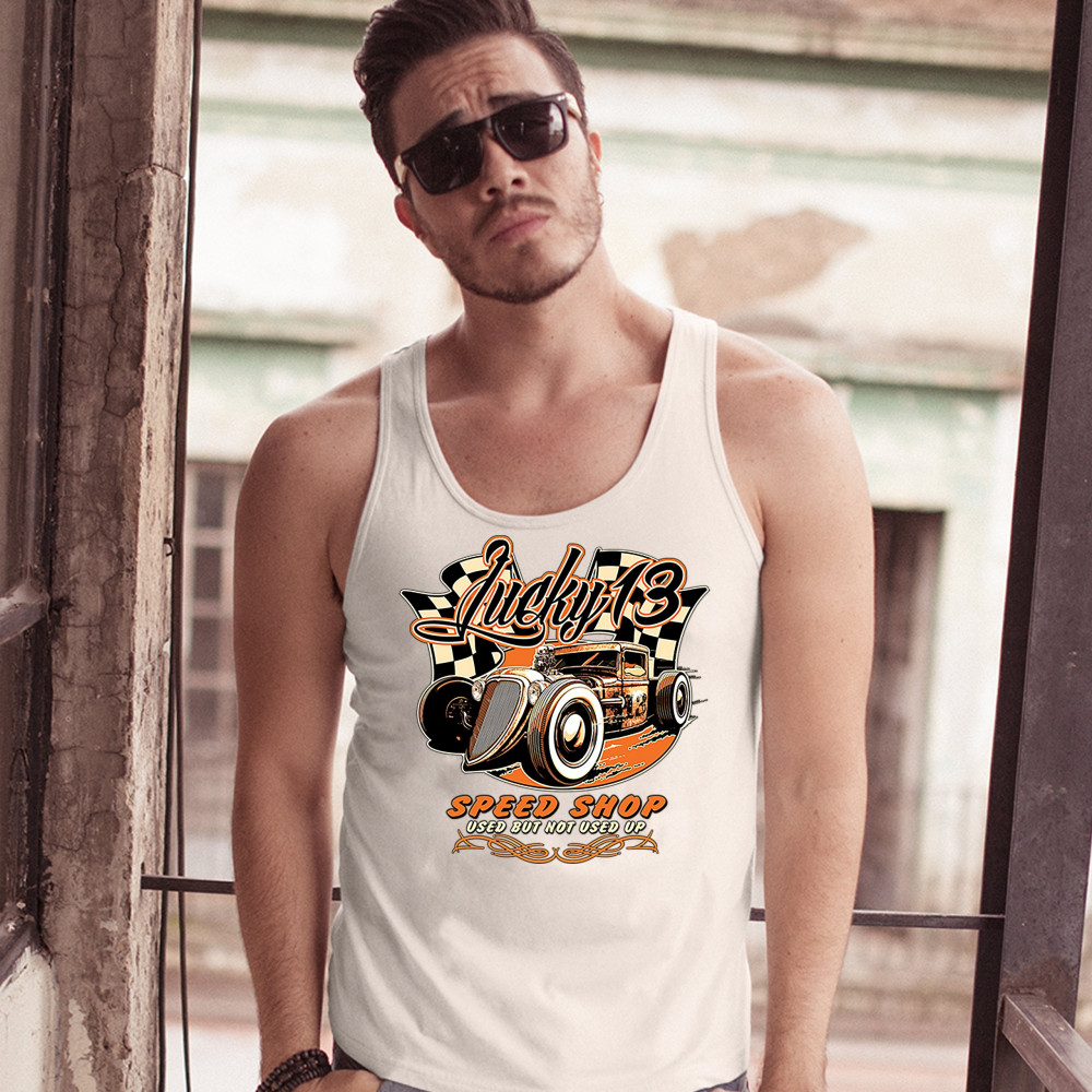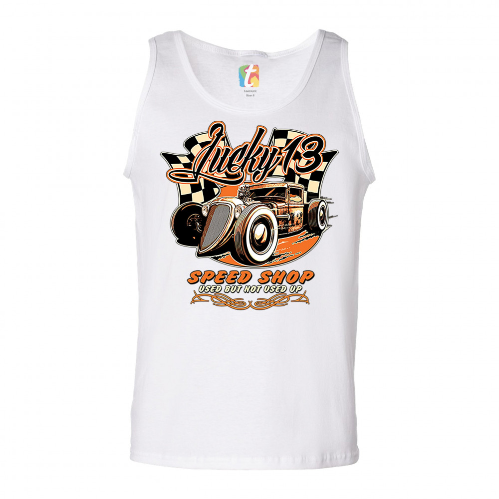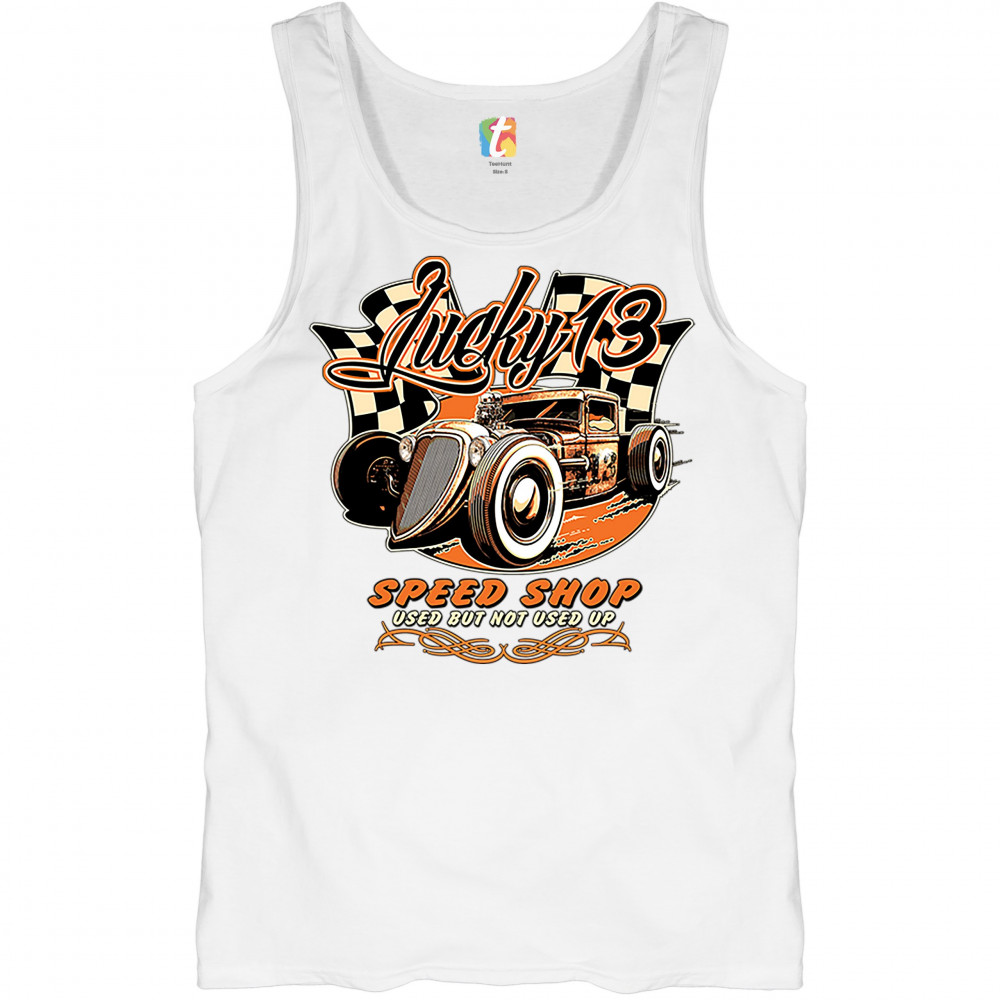 LUCKY 13 SPEED SHOP tank top rat rod route 66 vintage racing car men's top white