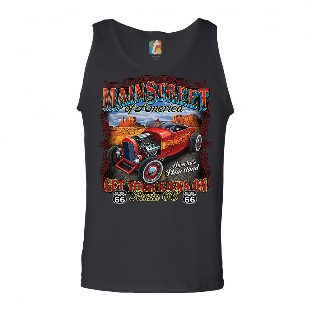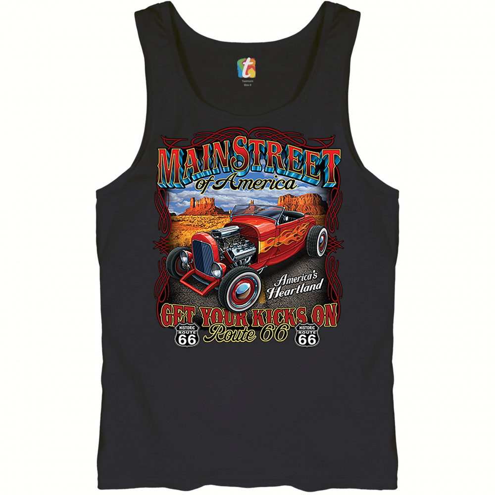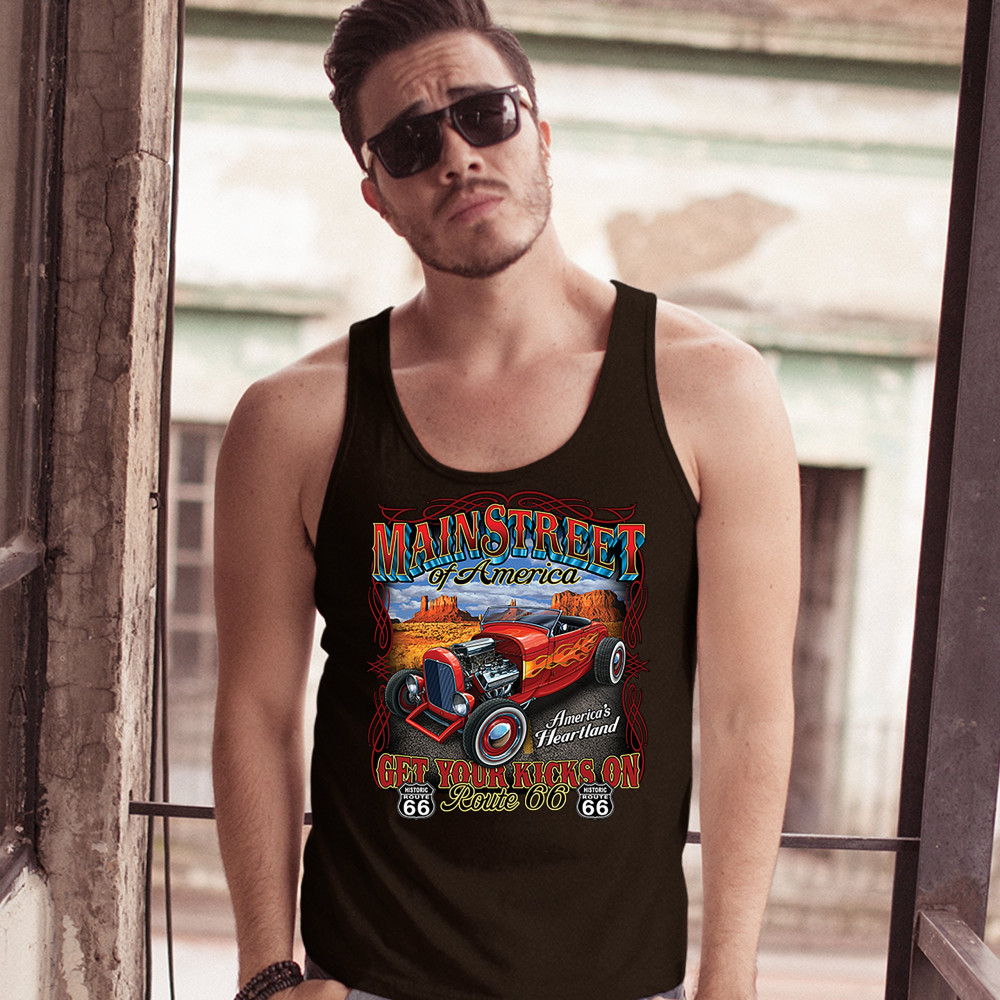 A print featuring a vintage hot rod with an exposed engine and flame paint job parked on a highway. The print says: "Main Street of America", "America's Heartland" and "Get Your Kicks on Route 66". The print also features two Route 66 signs. A great choic