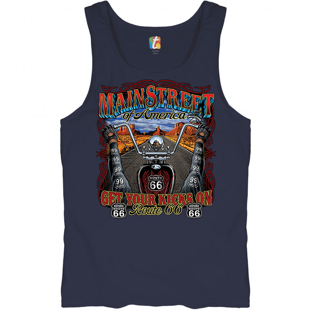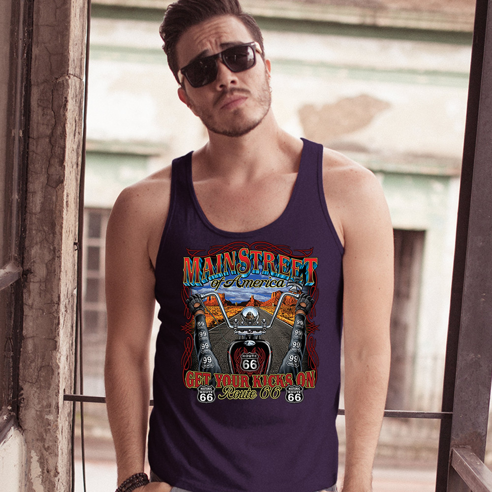 A print featuring a POV of a biker riding a chopper on a Route 66. There are are numerous "Route 66" and "Historic Route 66" signs all over the print and the print says: "Main street of America" and "Gwt your kicks on Route 66". A great choice for a motor