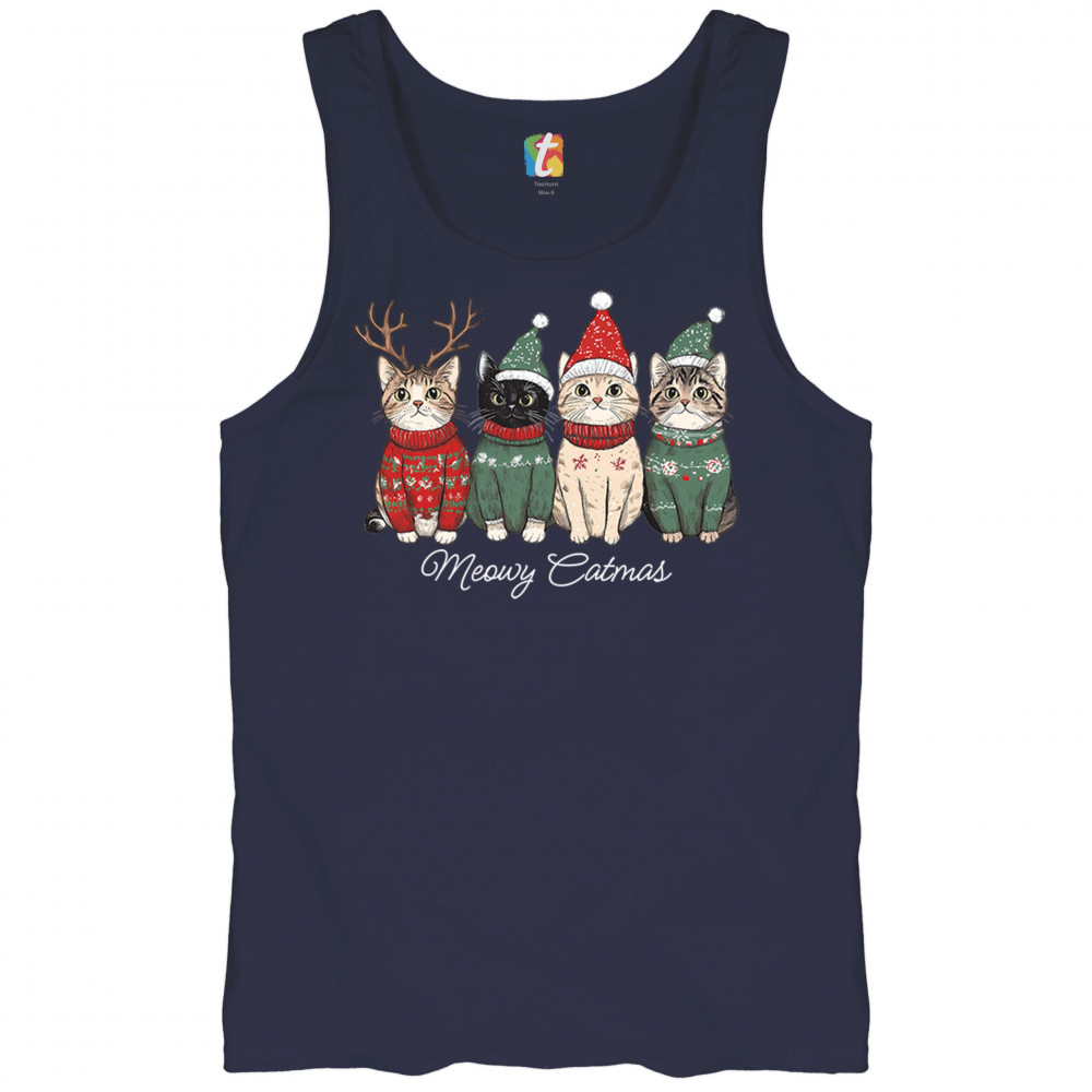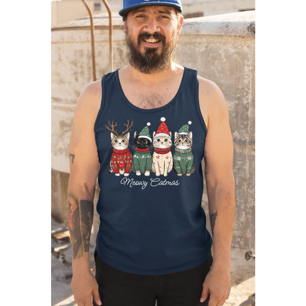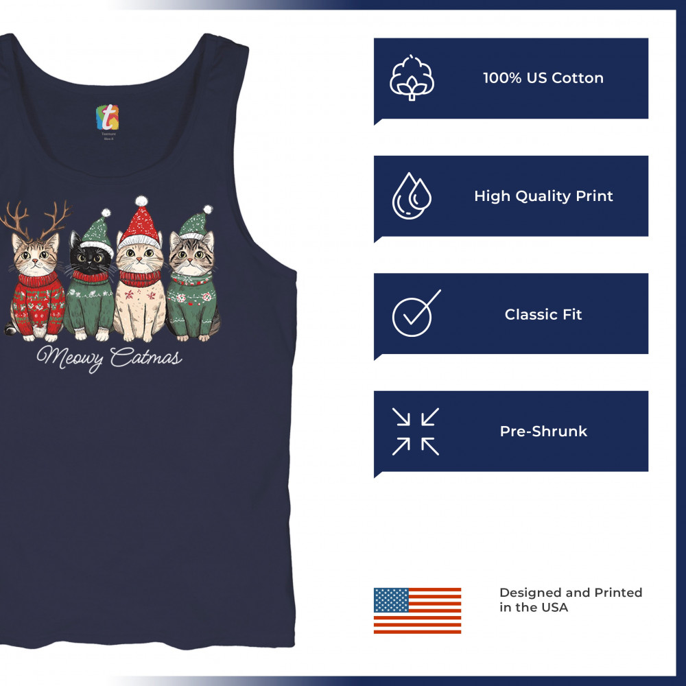 Cute Meowy Catmas design with festive kittens, perfect for cat lovers wanting a cozy holiday graphic and fun Christmas pet theme.