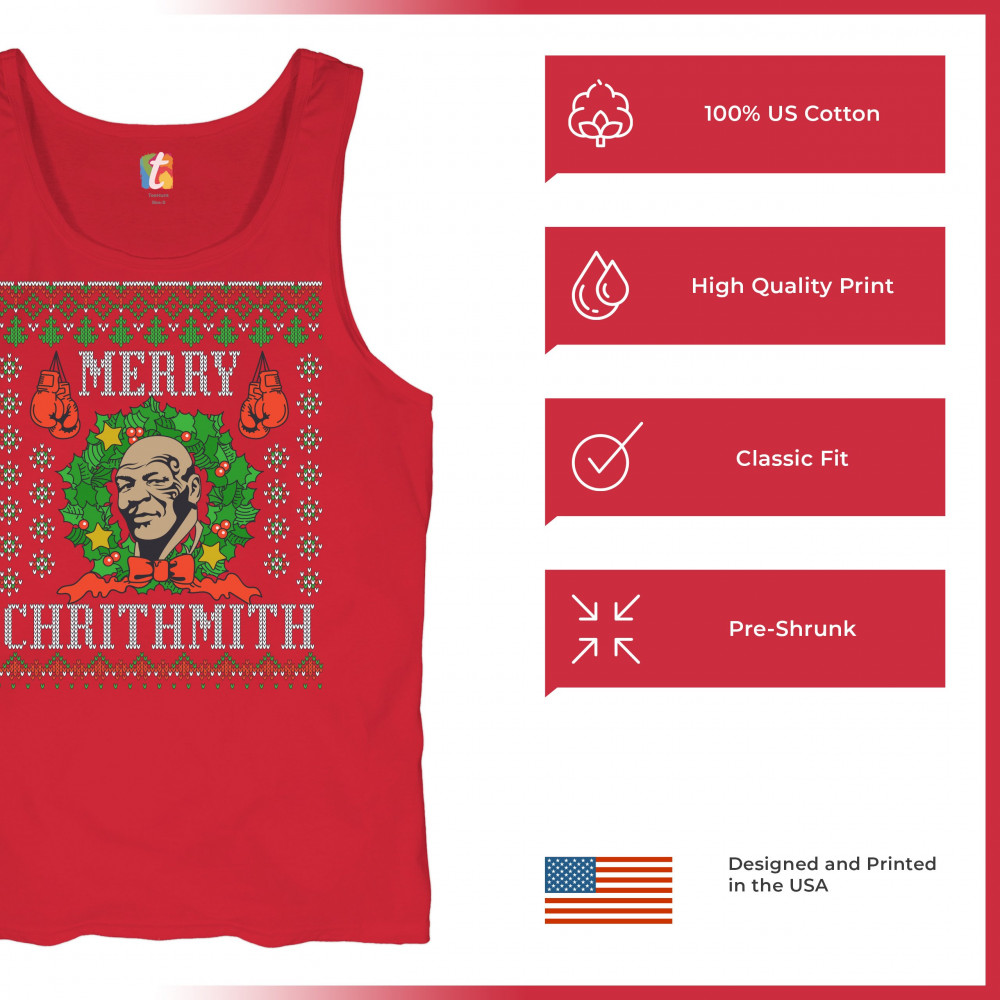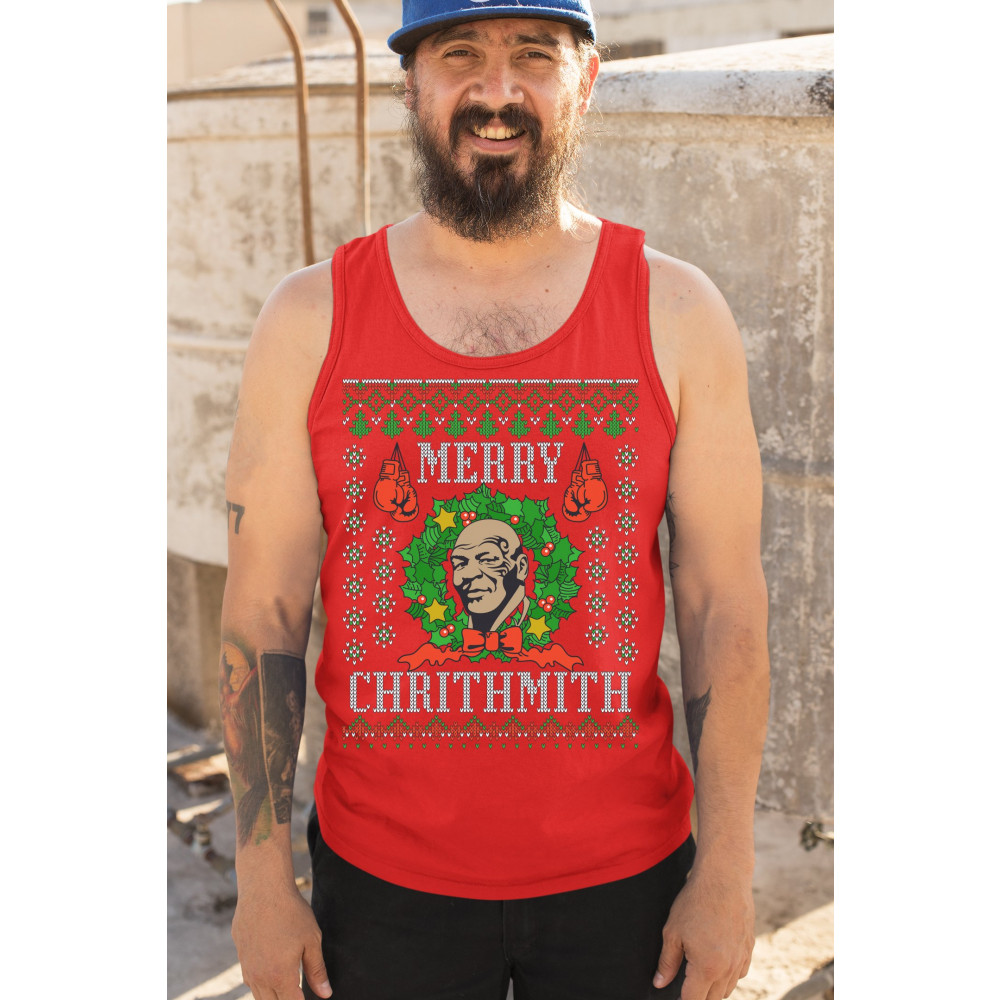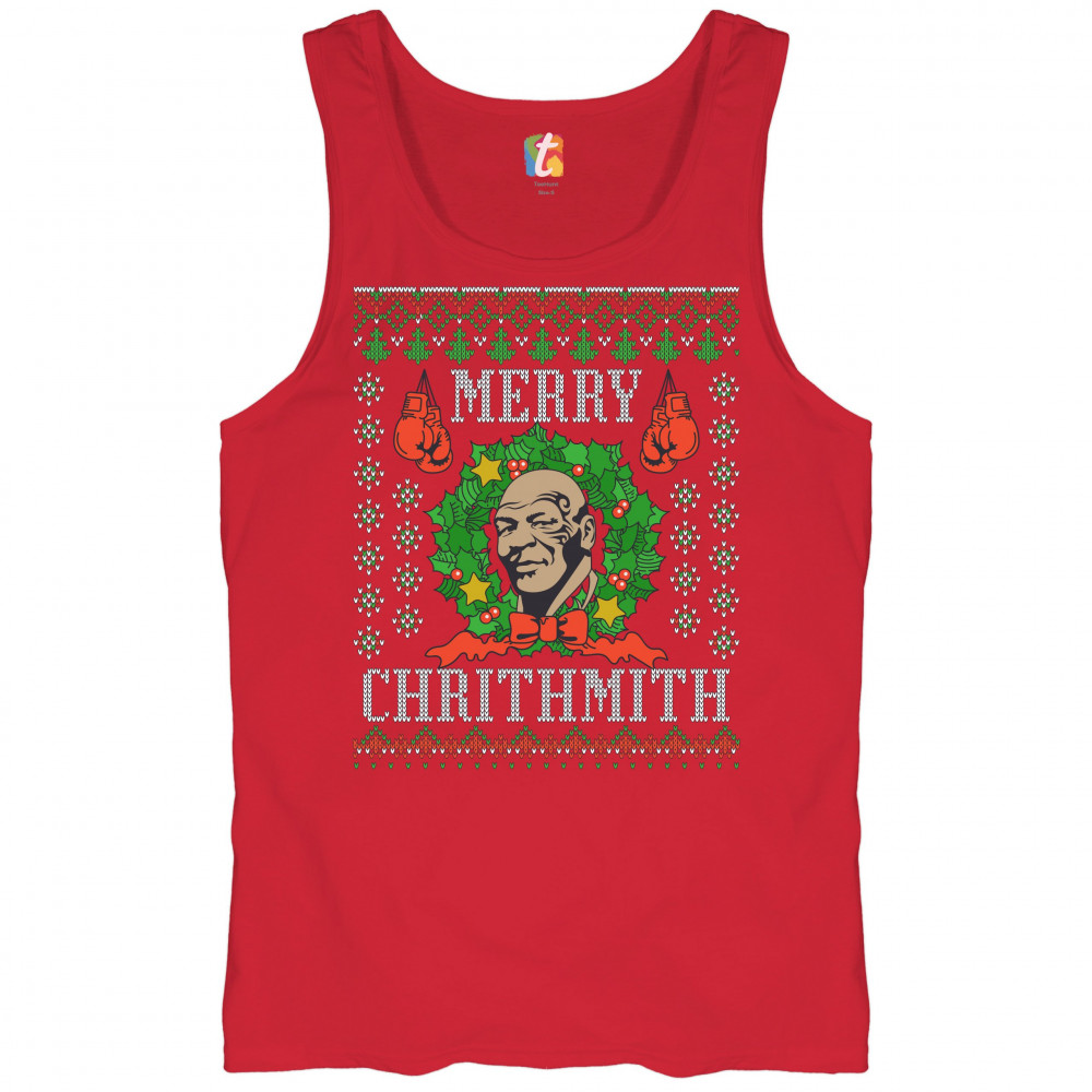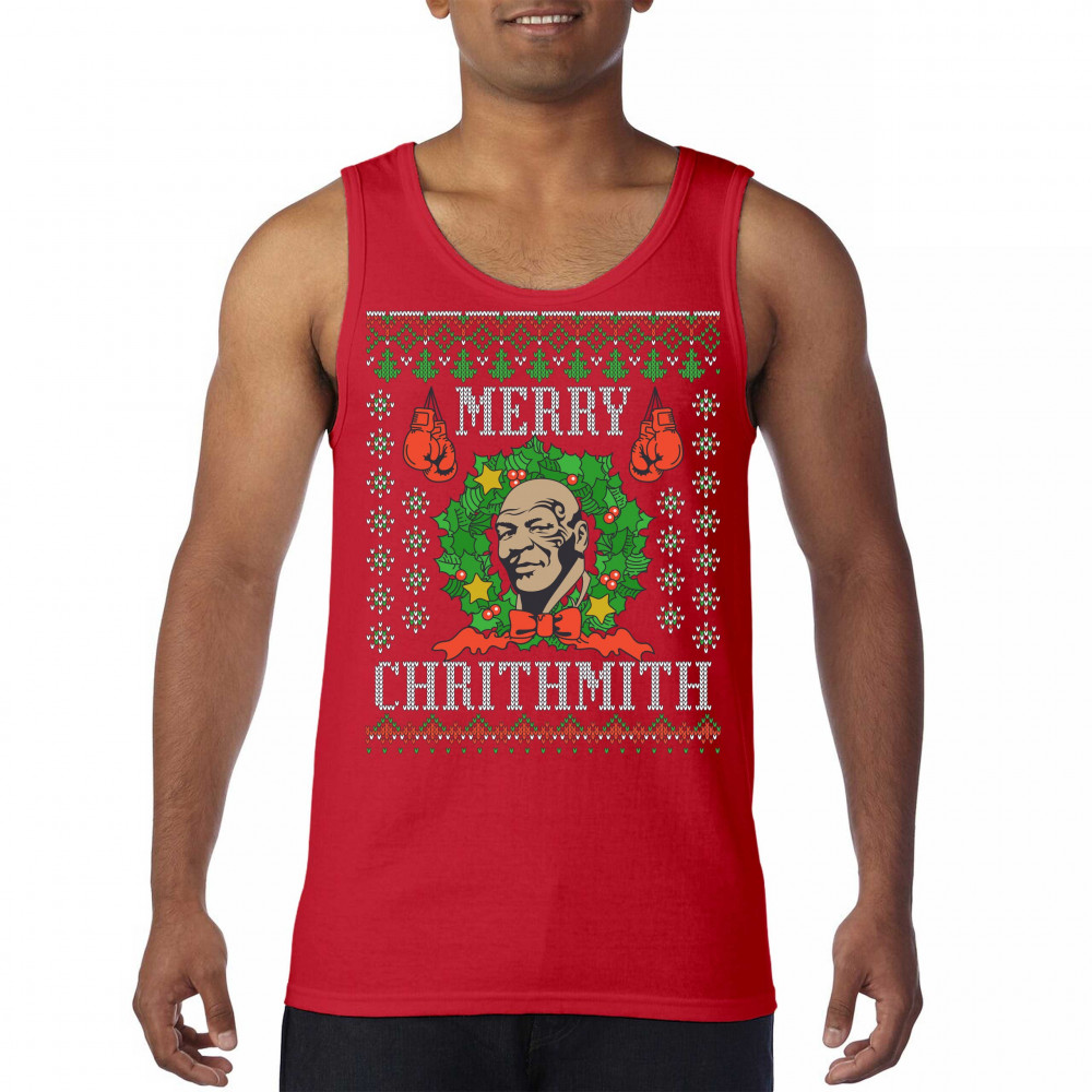 A print saying: "Merry Chrithmith" and featuring the face of Mike Tyson inside of a Christmas chaplet and two pairs of boxing gloves. The print is designed as an ugly sweater. Amazing choice to make people smile and spread positive vibes on Christmas Eve.