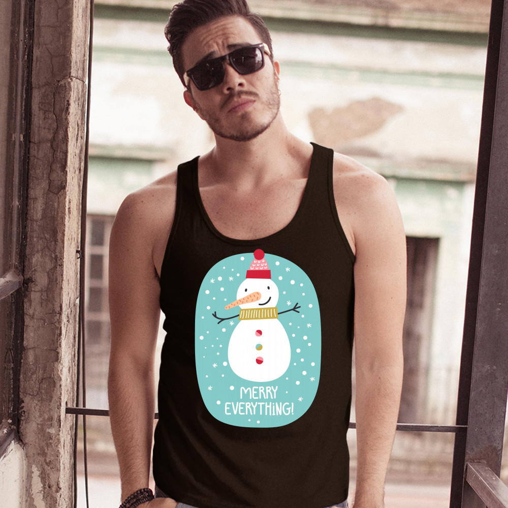 A print featuring a happy snowman with a carrot nose wearing a hat and a scarf smiling and spreading it's hands. It is snowing and below the snowman it says: "Merry Christmas". Amazing choice to make people smile and spread positive vibes on Christmas Eve