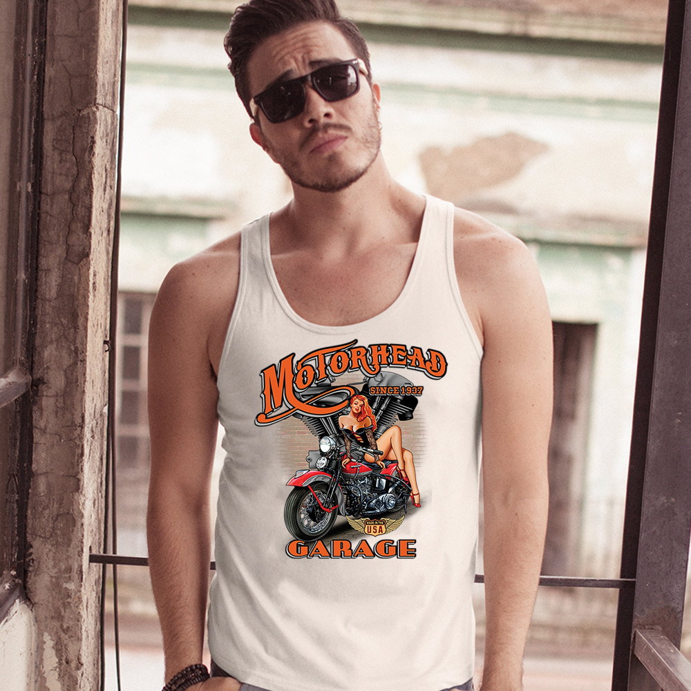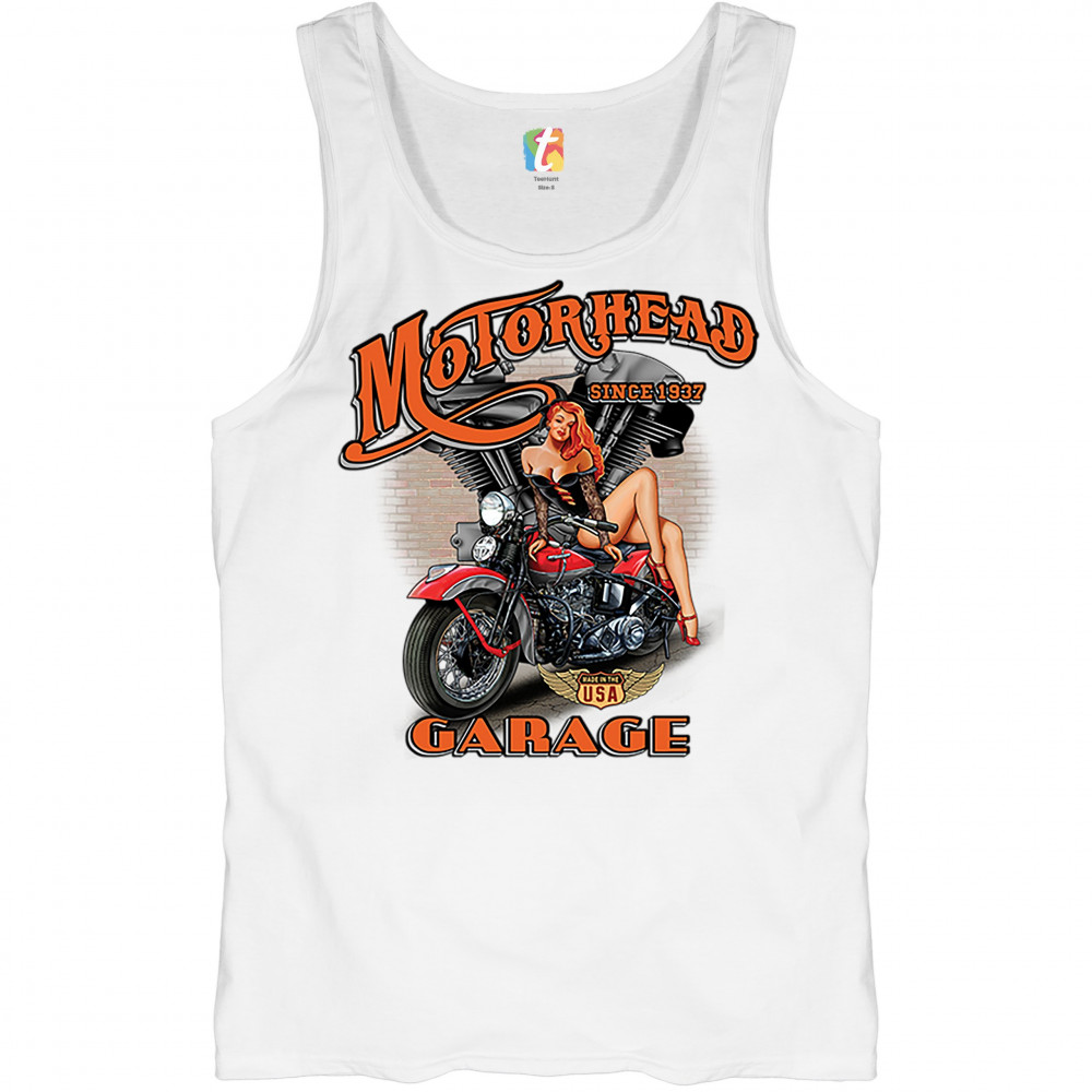 A print featuring a sexy pin-up girl sitting on a motorcycle. In the background there is a motorcycle engine and a brick wall. The print says: "Motorhead Garage since 1937" and features a "Made in the USA" sign. A great choice for a motorcycle enthusiast.