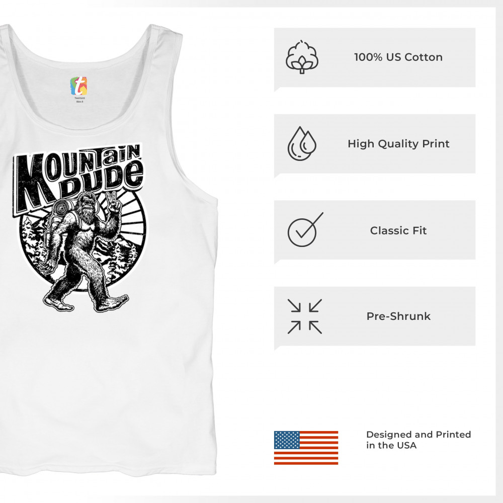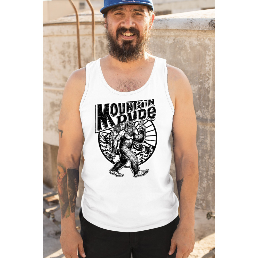 Celebrate outdoor adventures with the "Mountain Dude" design, featuring Sasquatch and mountain scenery. Perfect for hikers, campers, and Bigfoot fans.