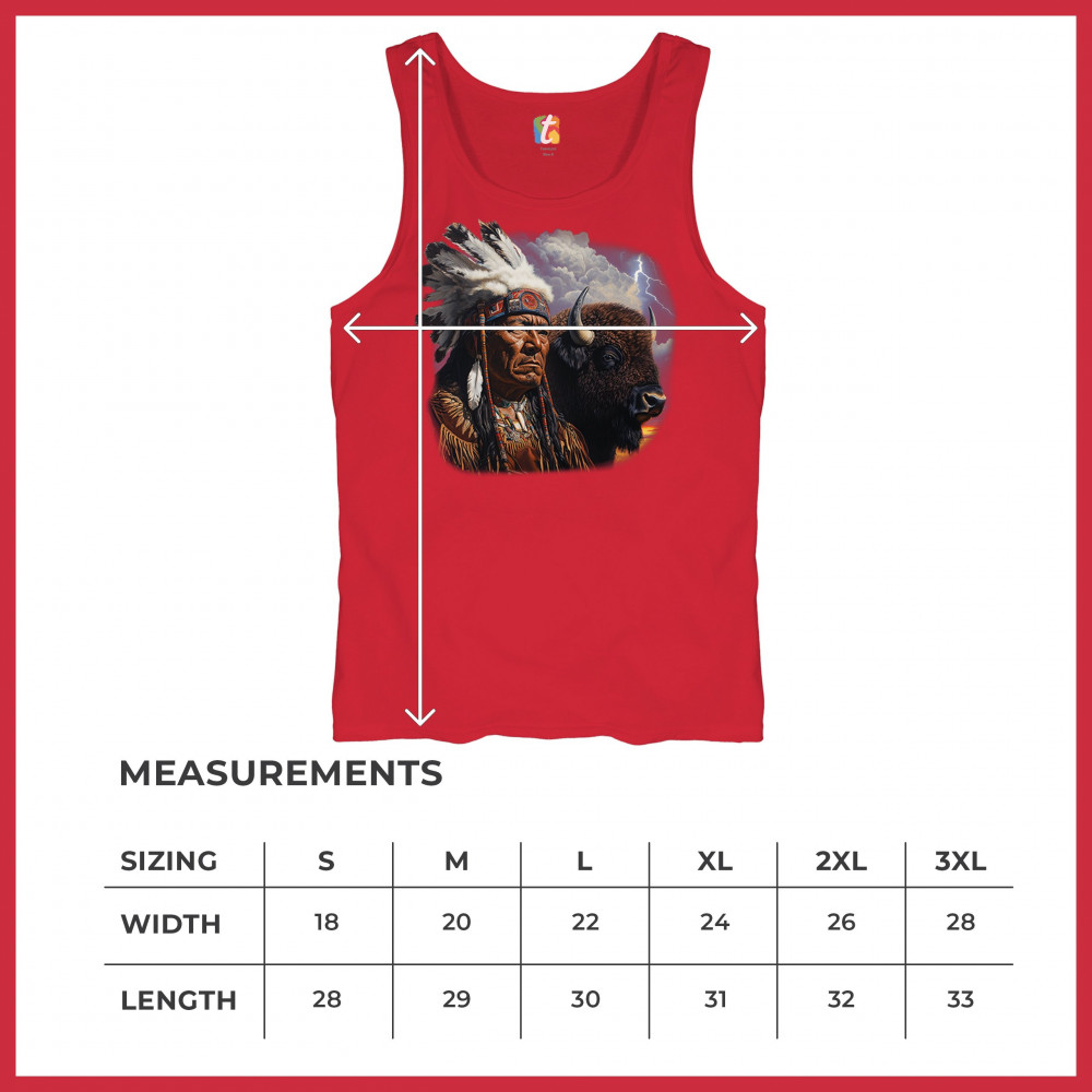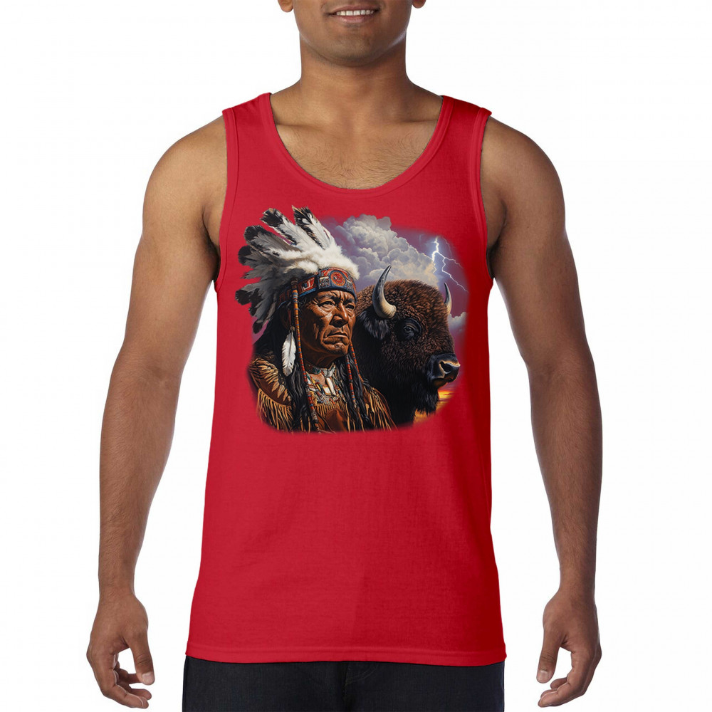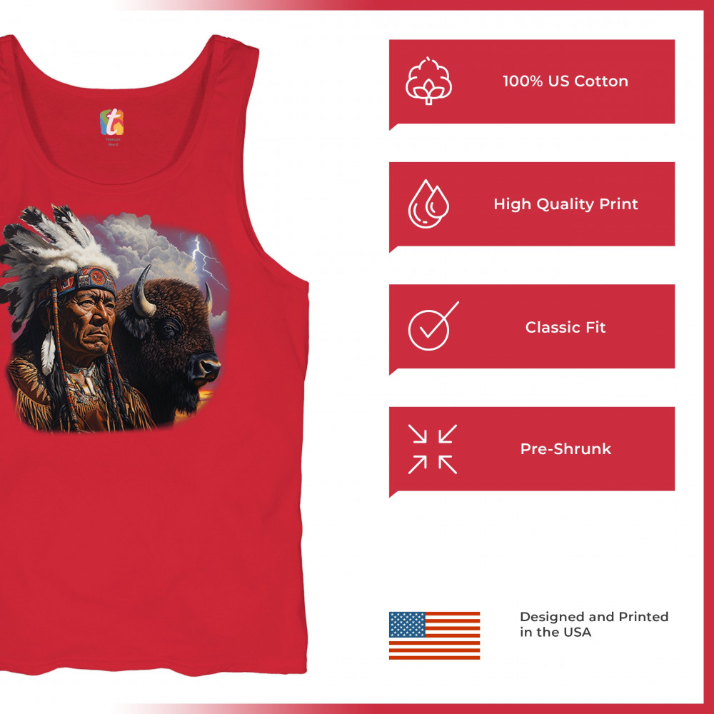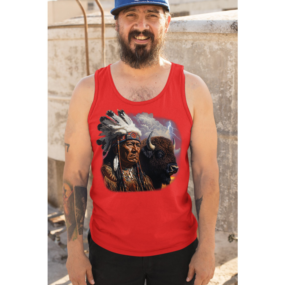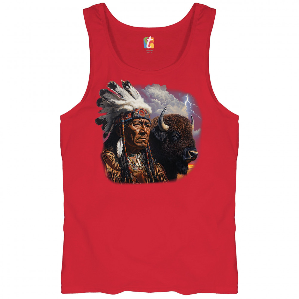 This powerful design features a Native American elder in traditional dress and feathered headdress beside a noble bison. Framed by a stormy sky and lightning, the art symbolizes tribal pride, spiritual harmony, ancestral strength, and a deep connection to nature’s raw energy.