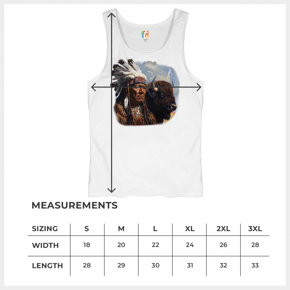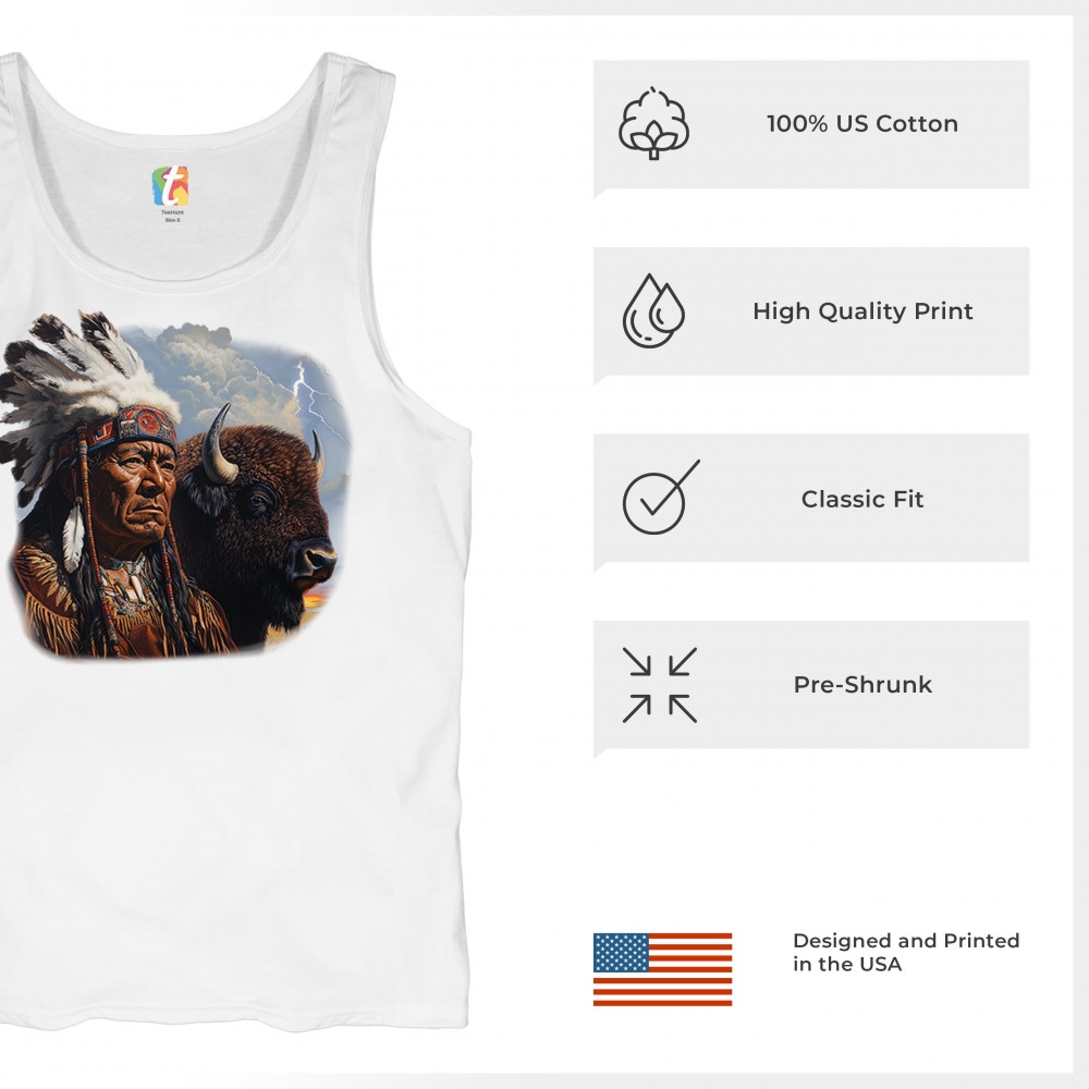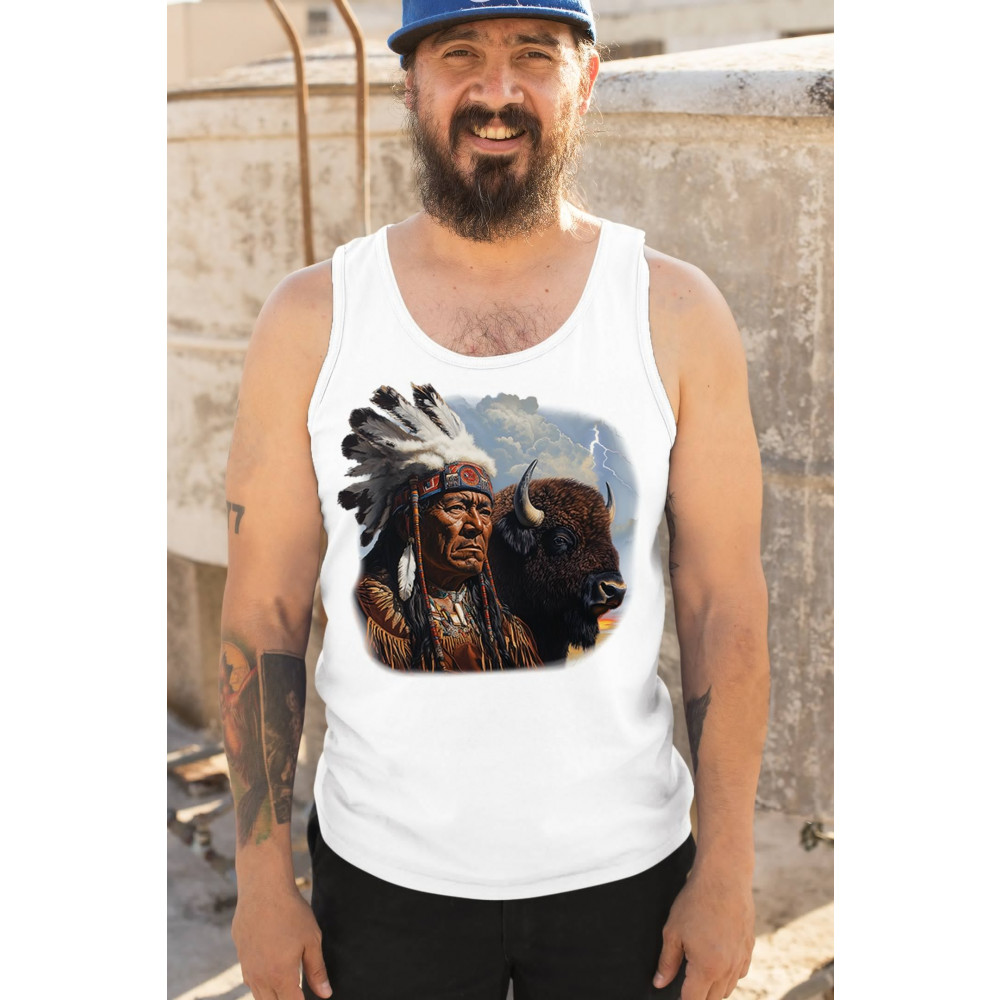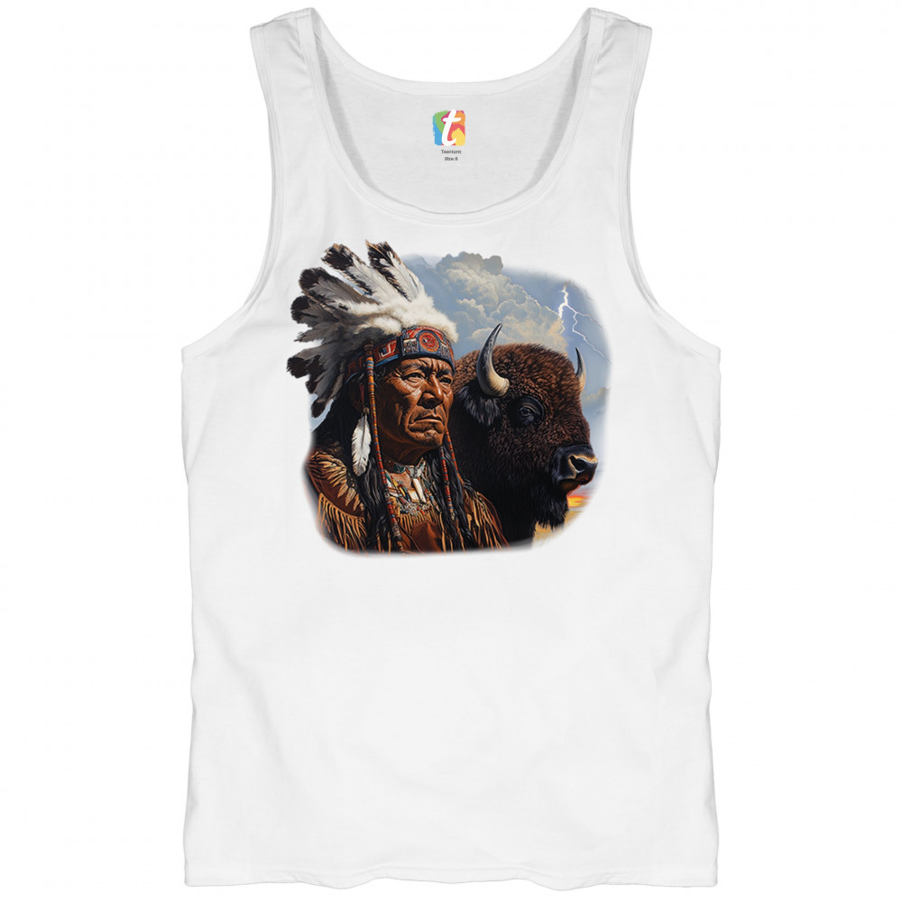 This powerful design features a Native American elder in traditional dress and feathered headdress beside a noble bison. Framed by a stormy sky and lightning, the art symbolizes tribal pride, spiritual harmony, ancestral strength, and a deep connection to nature’s raw energy.