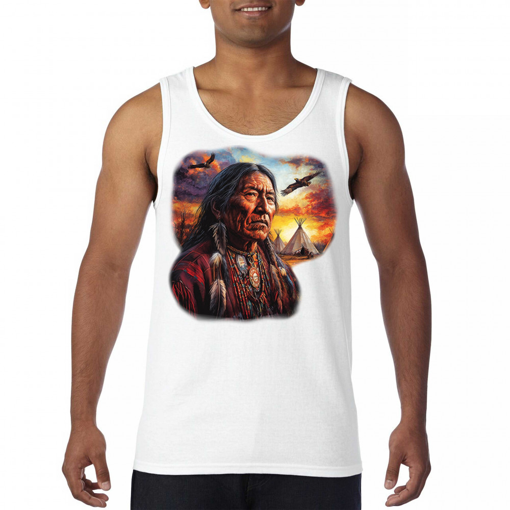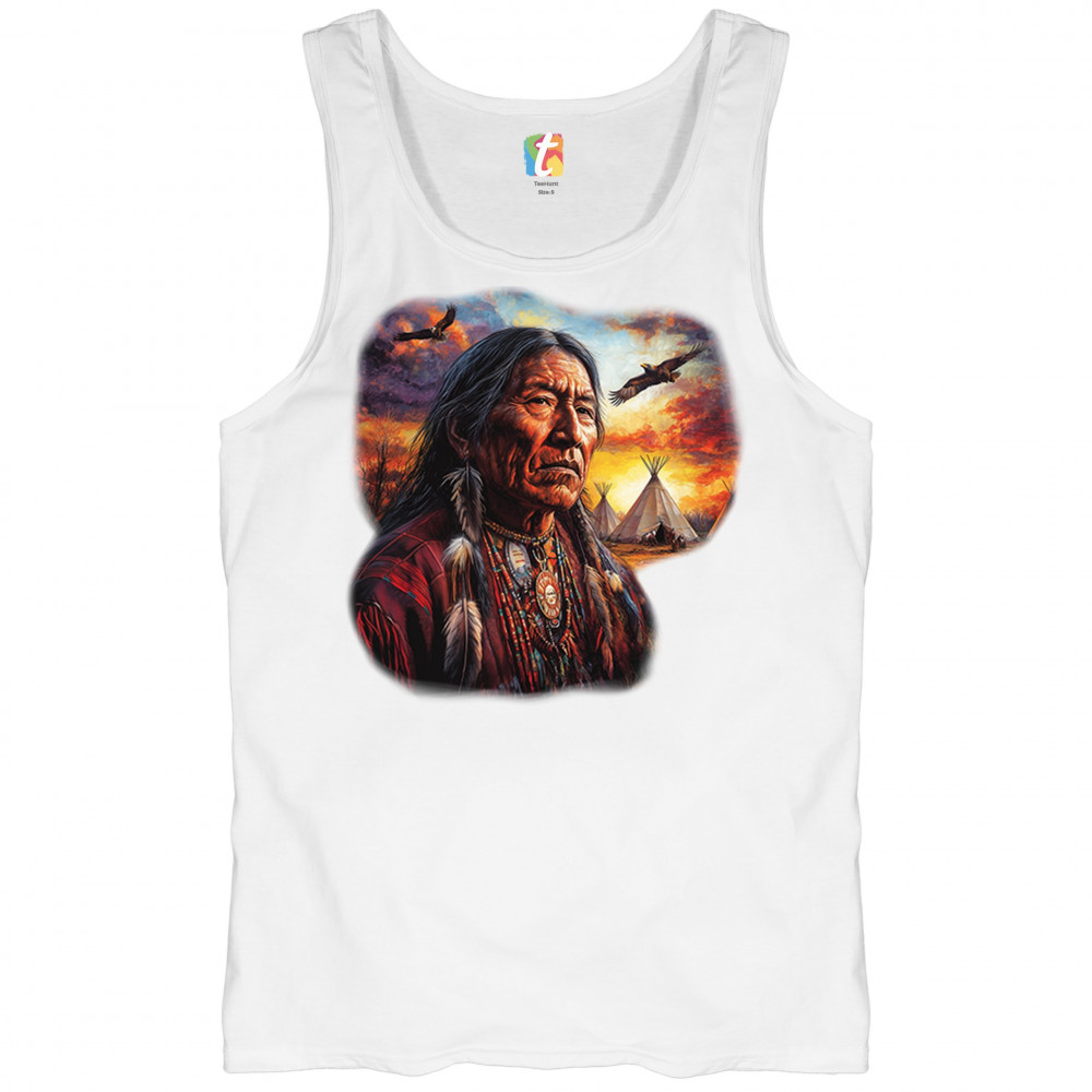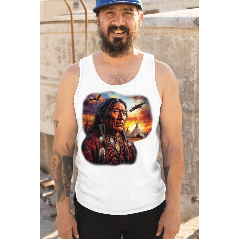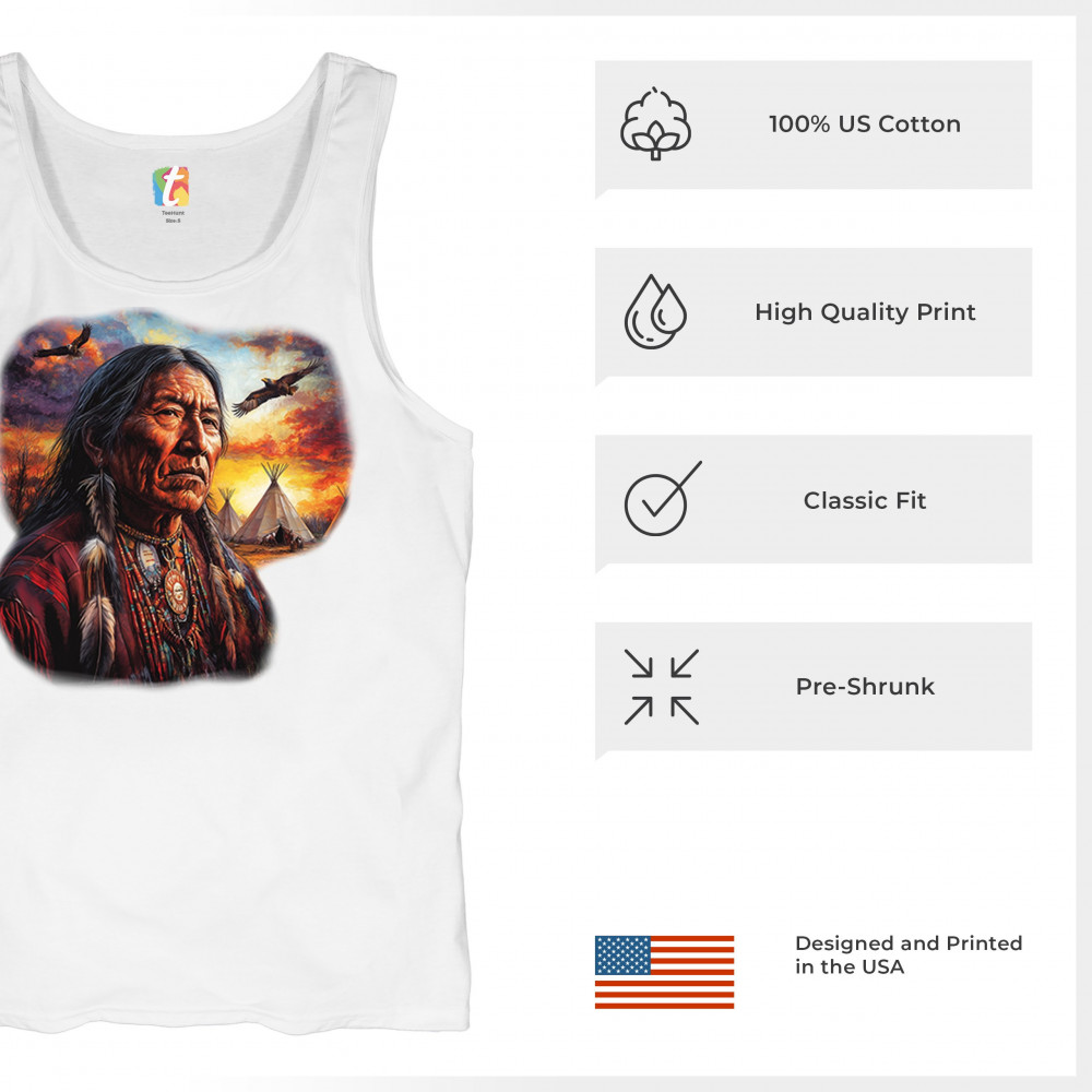 This vivid artwork features a Native American elder in traditional feathered attire, set before a blazing sunset with soaring eagles and peaceful teepees. The scene symbolizes strength, heritage, and spiritual wisdom. A heartfelt tribute to tribal pride, ancestral legacy, and cultural connection to land.