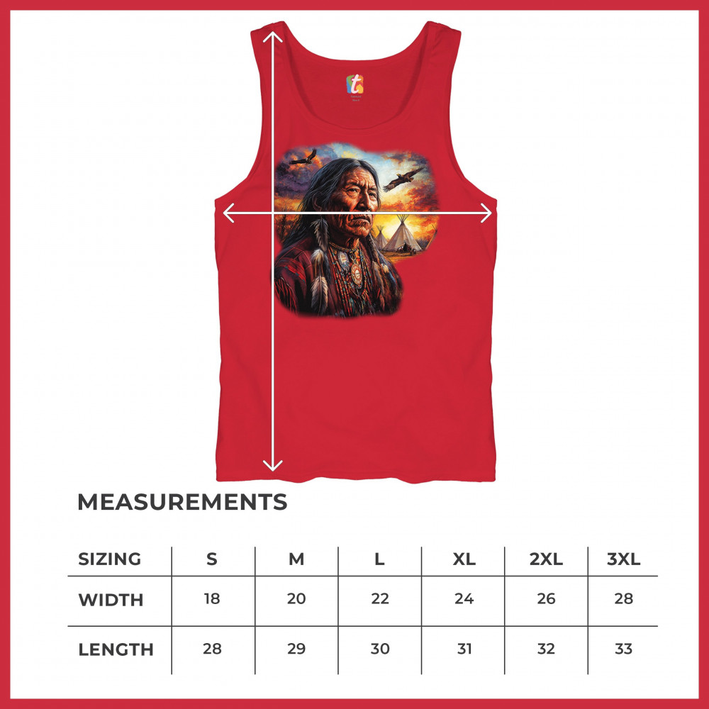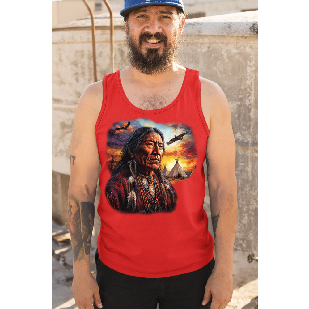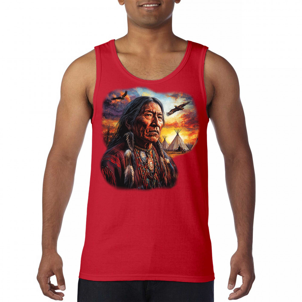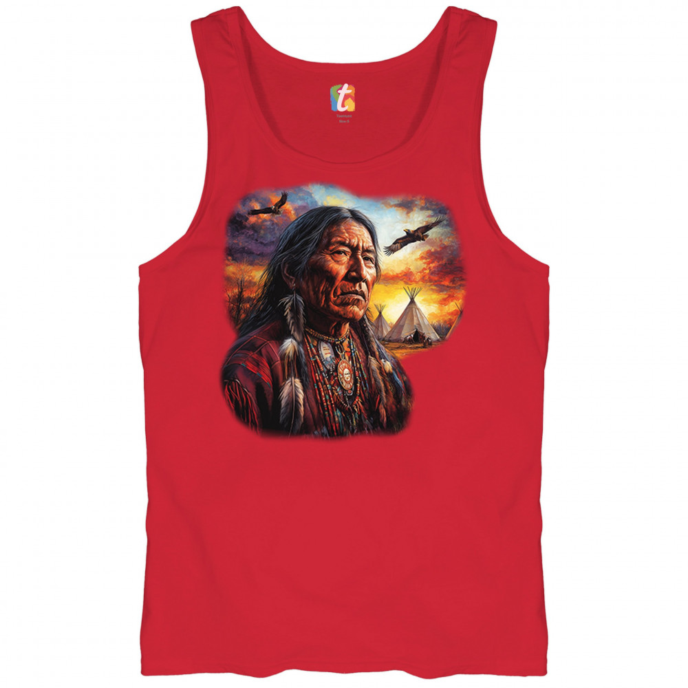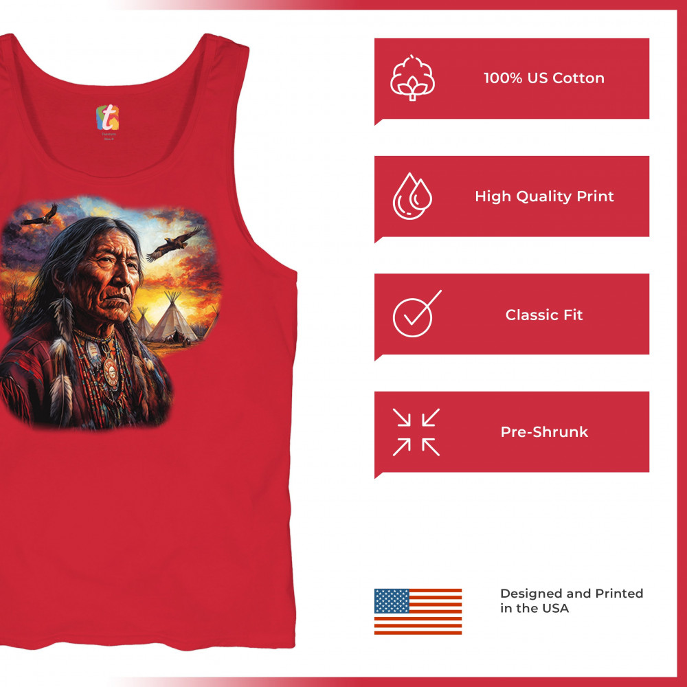 This vivid artwork features a Native American elder in traditional feathered attire, set before a blazing sunset with soaring eagles and peaceful teepees. The scene symbolizes strength, heritage, and spiritual wisdom. A heartfelt tribute to tribal pride, ancestral legacy, and cultural connection to land.