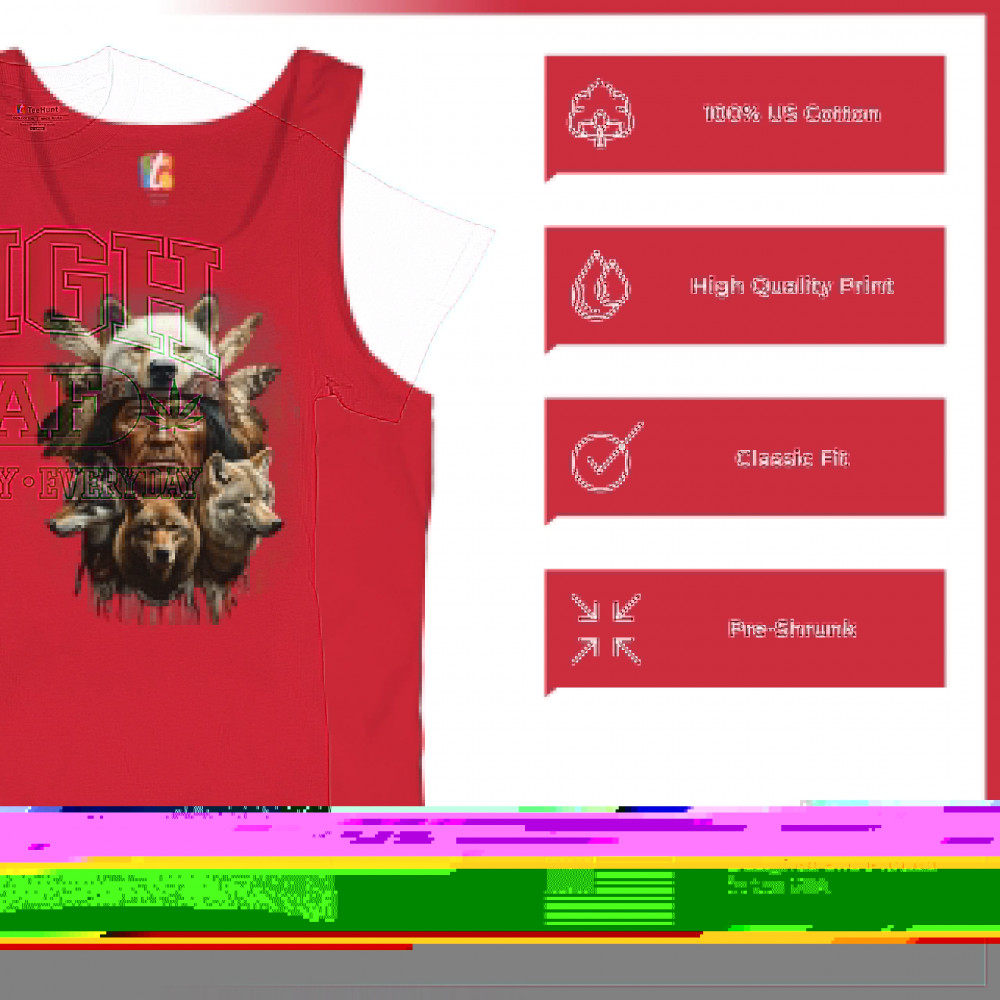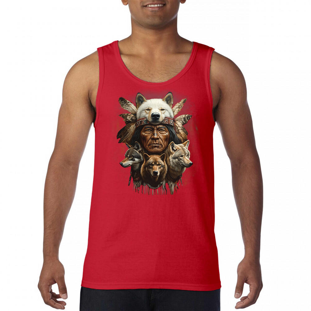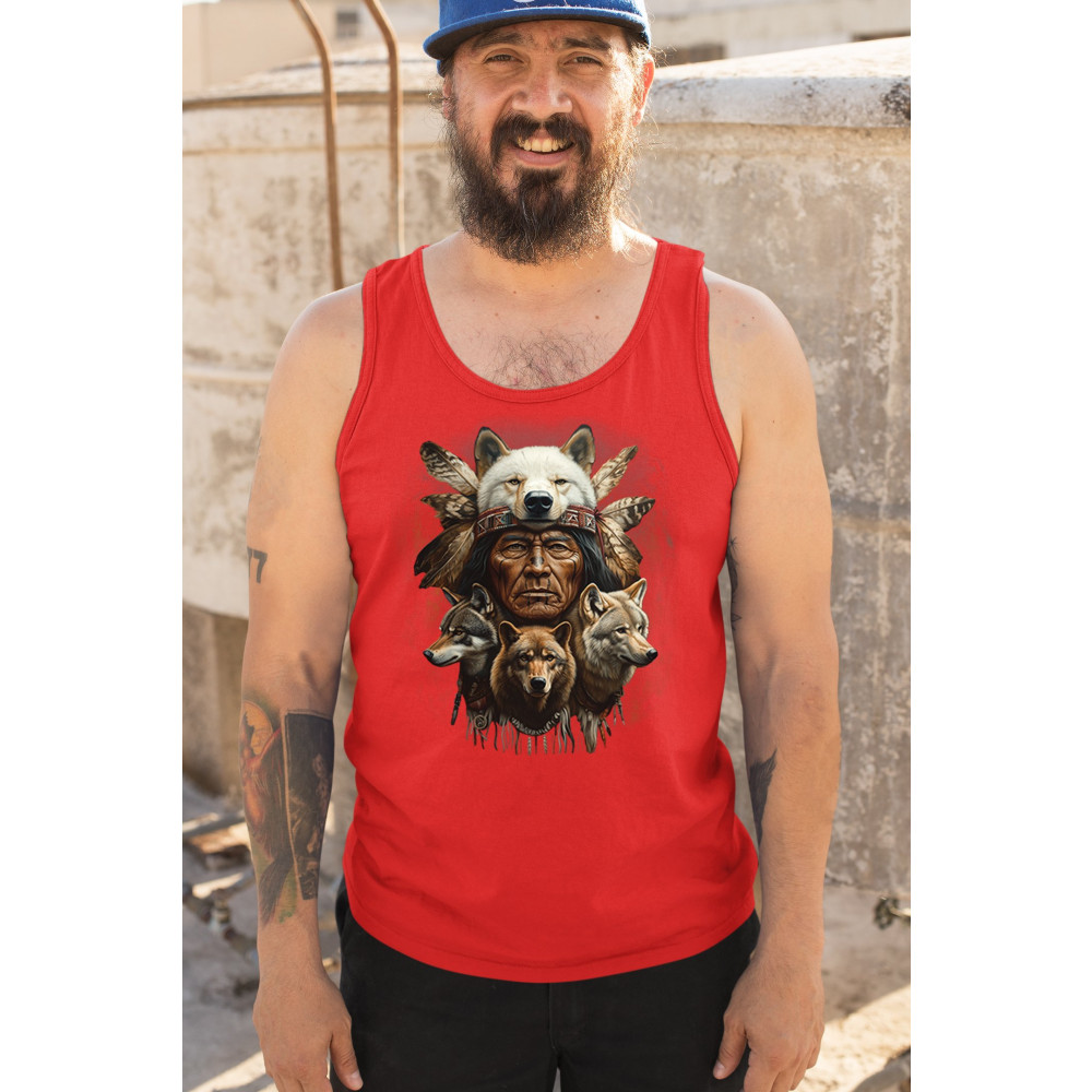 This spiritual tribal design showcases a Native American elder in a detailed wolf headdress surrounded by guardian wolves. It represents strength, loyalty, instinct, and sacred unity with nature. A powerful totem for honoring animal bonds, native pride, and ancestral spiritual guidance through the spirit of the wolf.