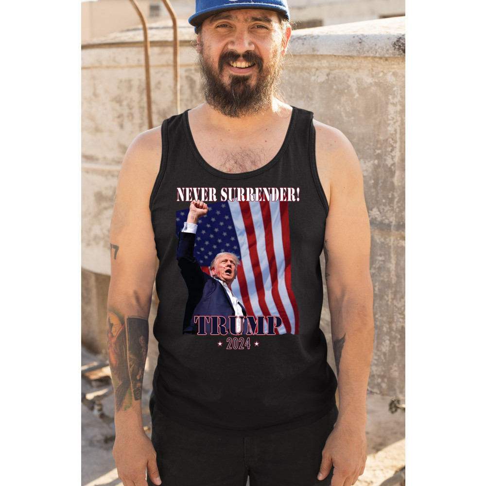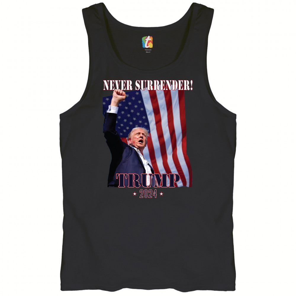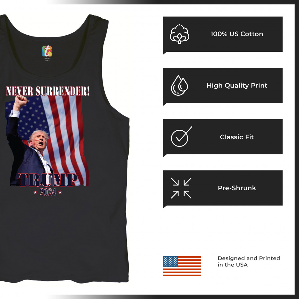 Support Donald Trump with our bold "Never Surrender! Trump 2024" design, featuring Trump against the American flag. Perfect for rallies and everyday wear.