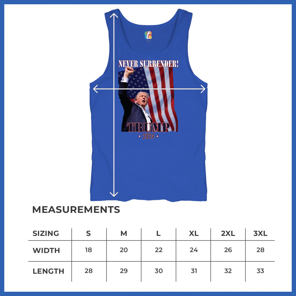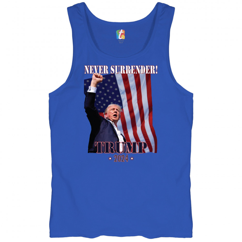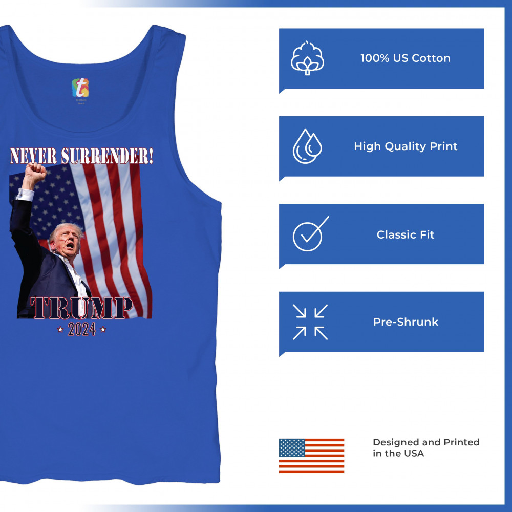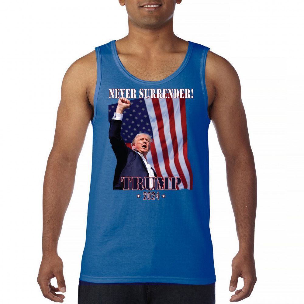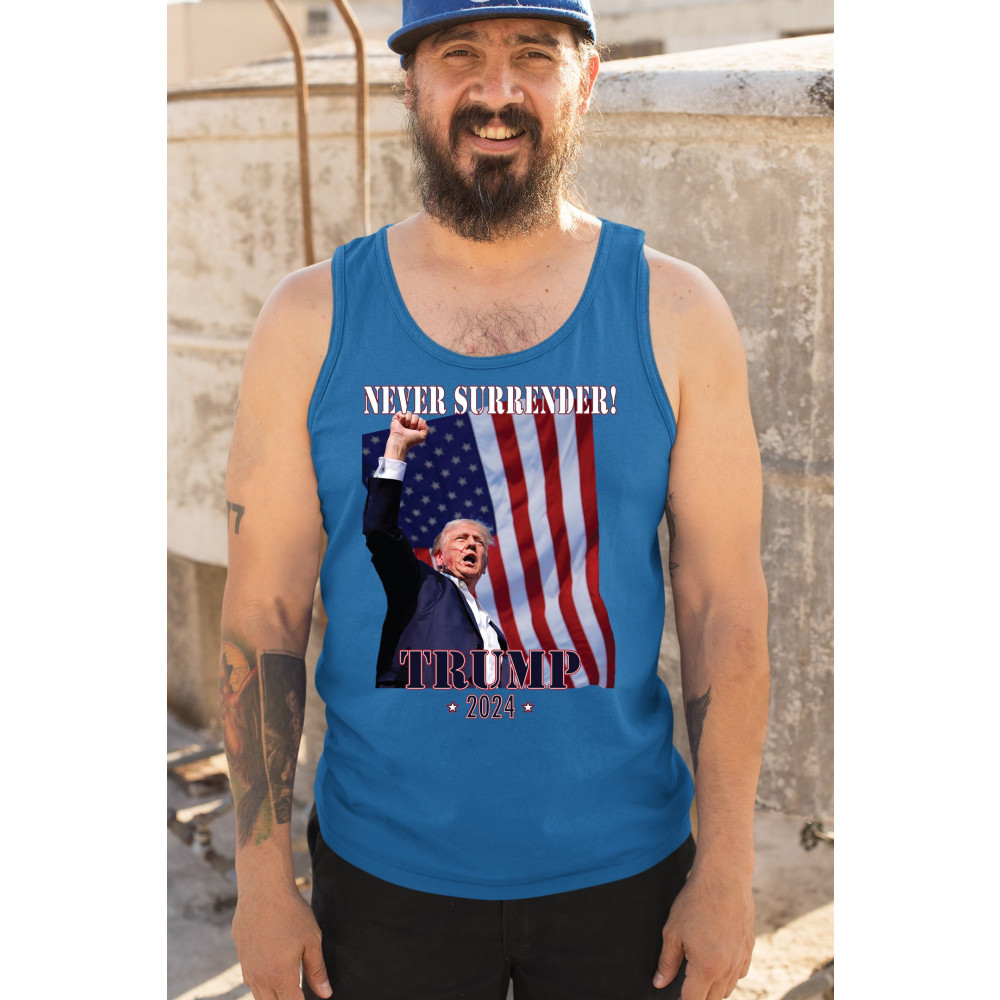 Celebrate your patriotic spirit and political stance with our "Never Surrender! Trump 2024" design. This powerful graphic showcases Donald Trump with a raised fist against the backdrop of the American flag, symbolizing resilience and determination. Ideal for rallies, events, and everyday wear, this design is crafted from premium materials for comfort and durability. Stand out and show your support for America's future with this striking and bold statement piece, perfect for any proud Trump supporter.