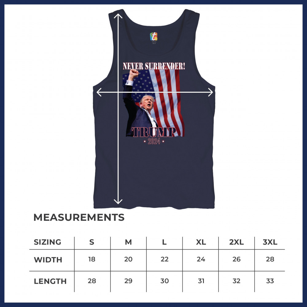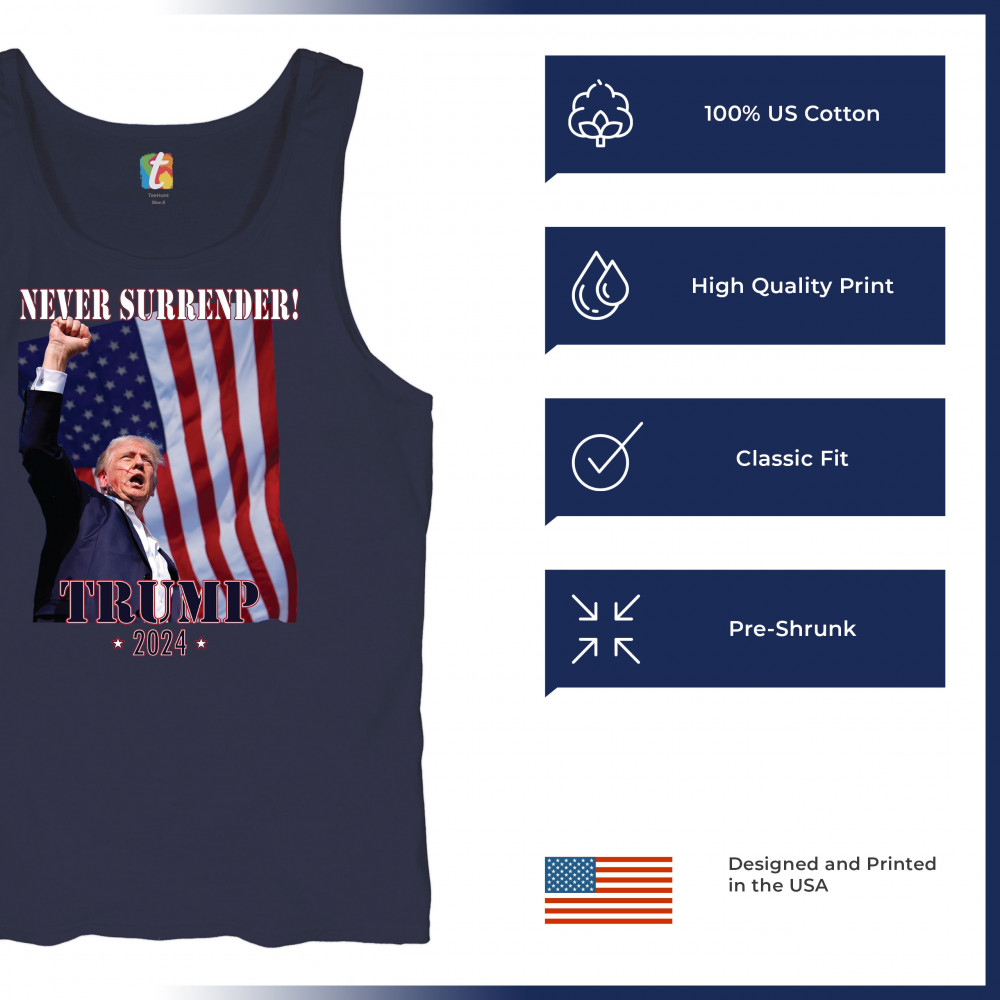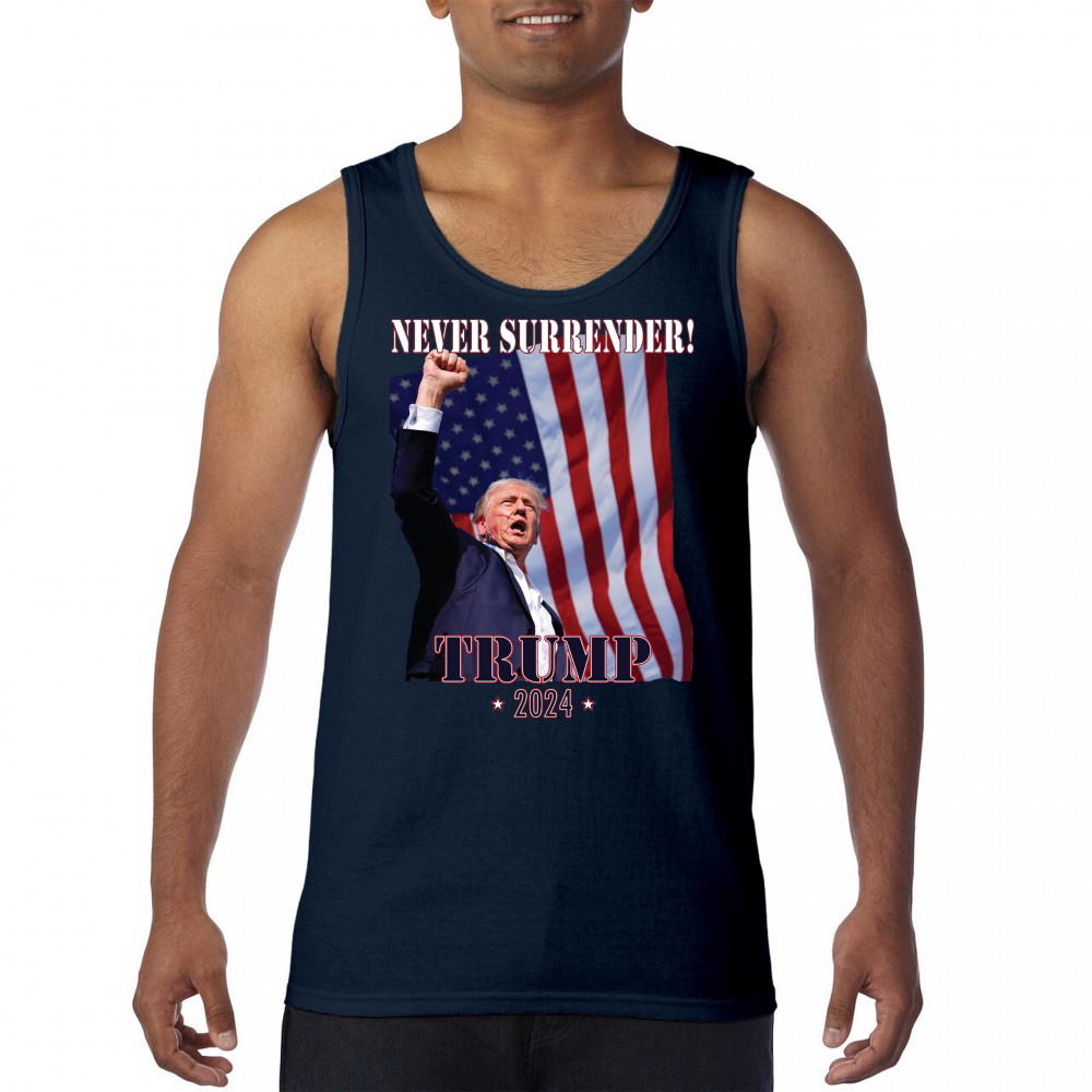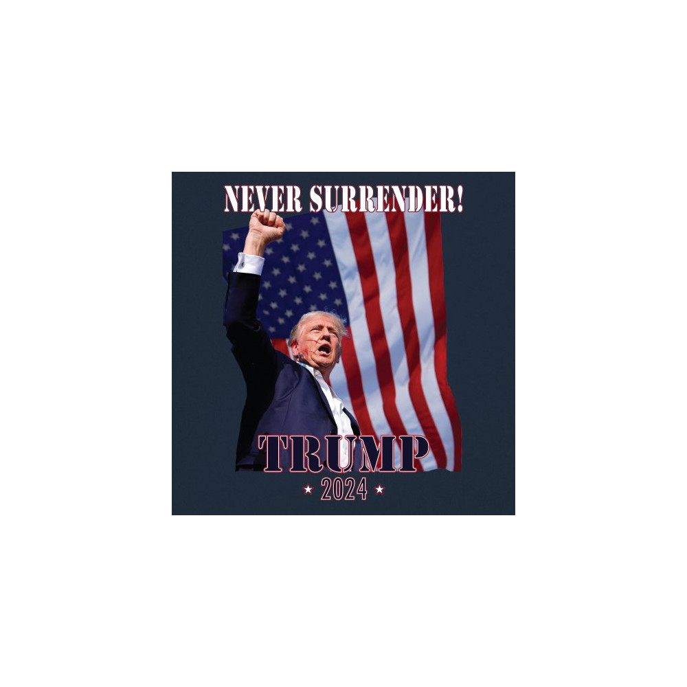 Celebrate your patriotic spirit and political stance with our "Never Surrender! Trump 2024" design. This powerful graphic showcases Donald Trump with a raised fist against the backdrop of the American flag, symbolizing resilience and determination. Ideal for rallies, events, and everyday wear, this design is crafted from premium materials for comfort and durability. Stand out and show your support for America's future with this striking and bold statement piece, perfect for any proud Trump supporter.