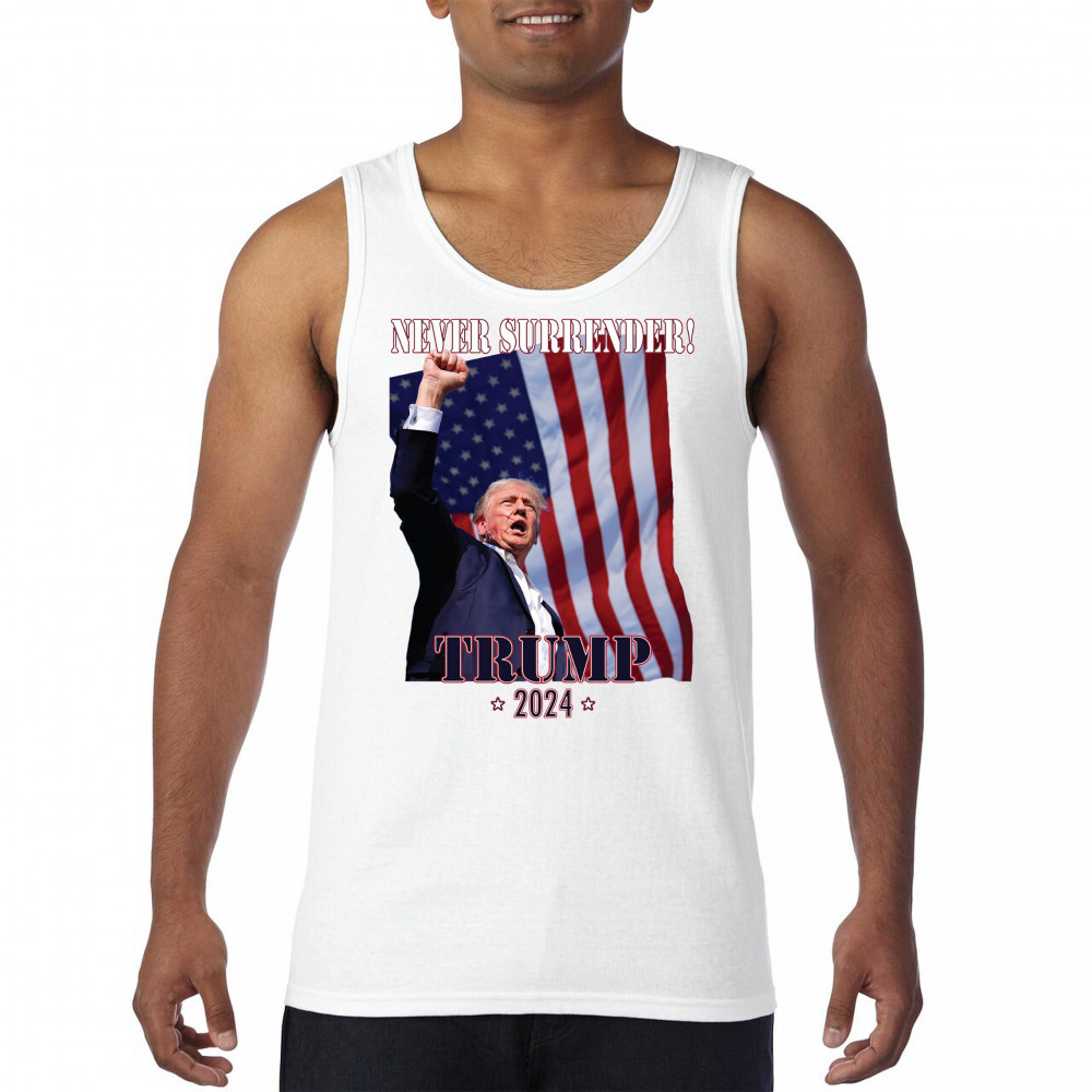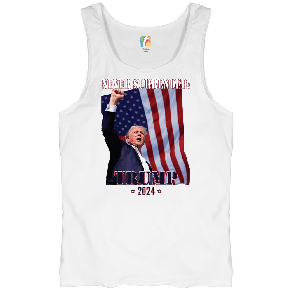Celebrate your patriotic spirit and political stance with our "Never Surrender! Trump 2024" design. This powerful graphic showcases Donald Trump with a raised fist against the backdrop of the American flag, symbolizing resilience and determination. Ideal for rallies, events, and everyday wear, this design is crafted from premium materials for comfort and durability. Stand out and show your support for America's future with this striking and bold statement piece, perfect for any proud Trump supporter.
