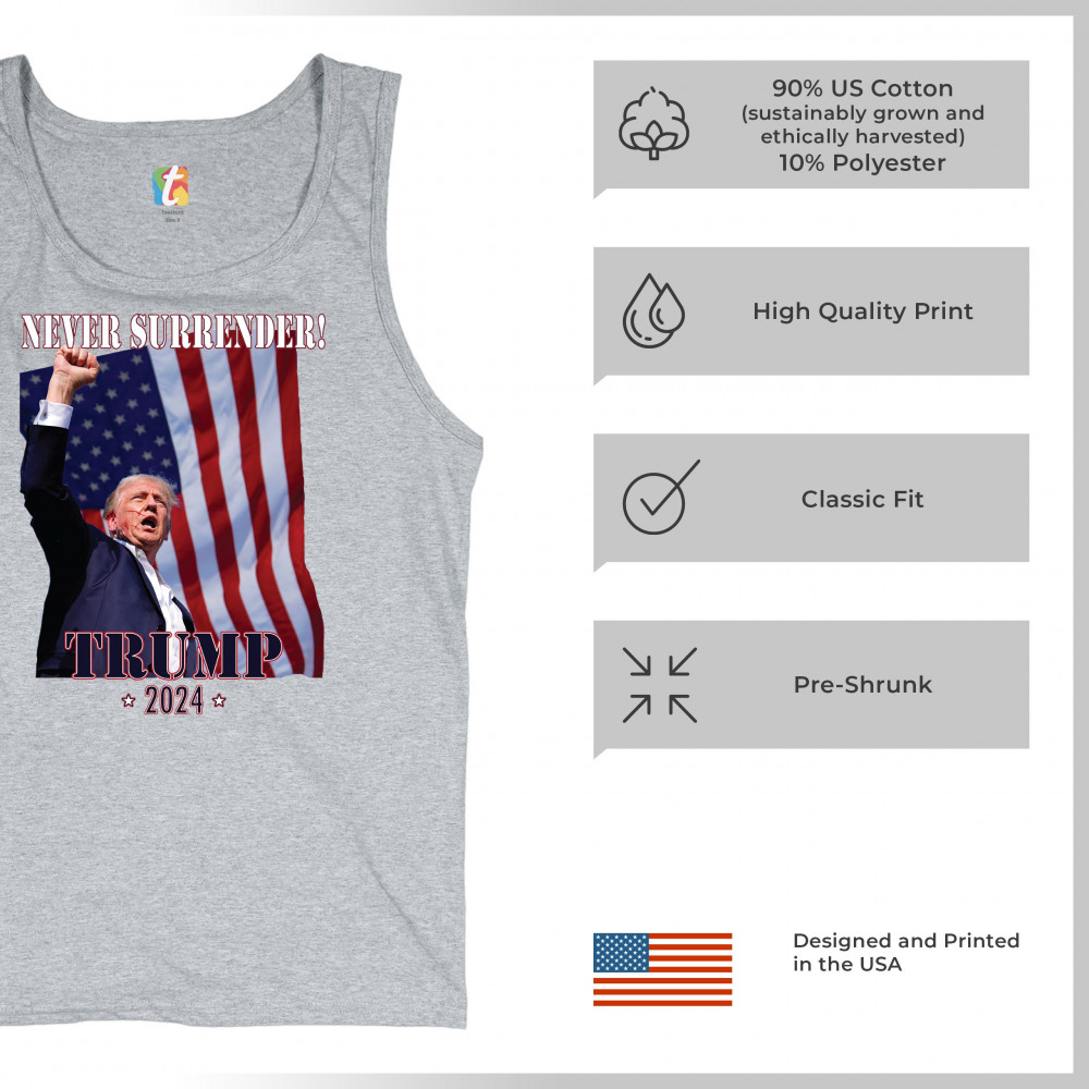 Support Donald Trump with our bold "Never Surrender! Trump 2024" design, featuring Trump against the American flag. Perfect for rallies and everyday wear.