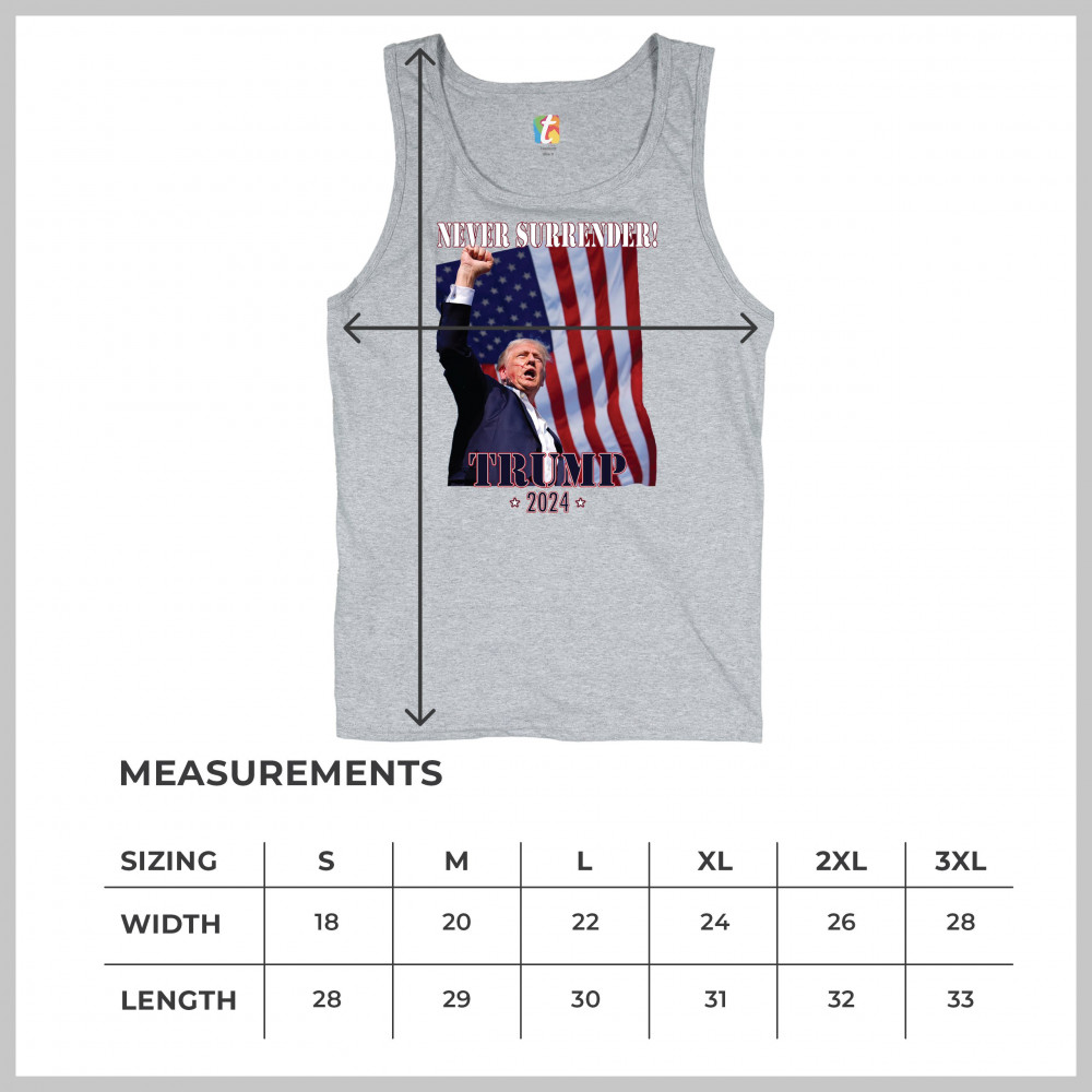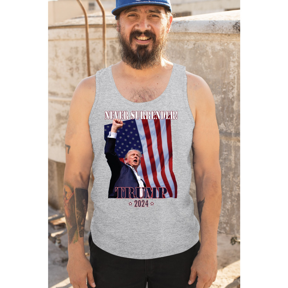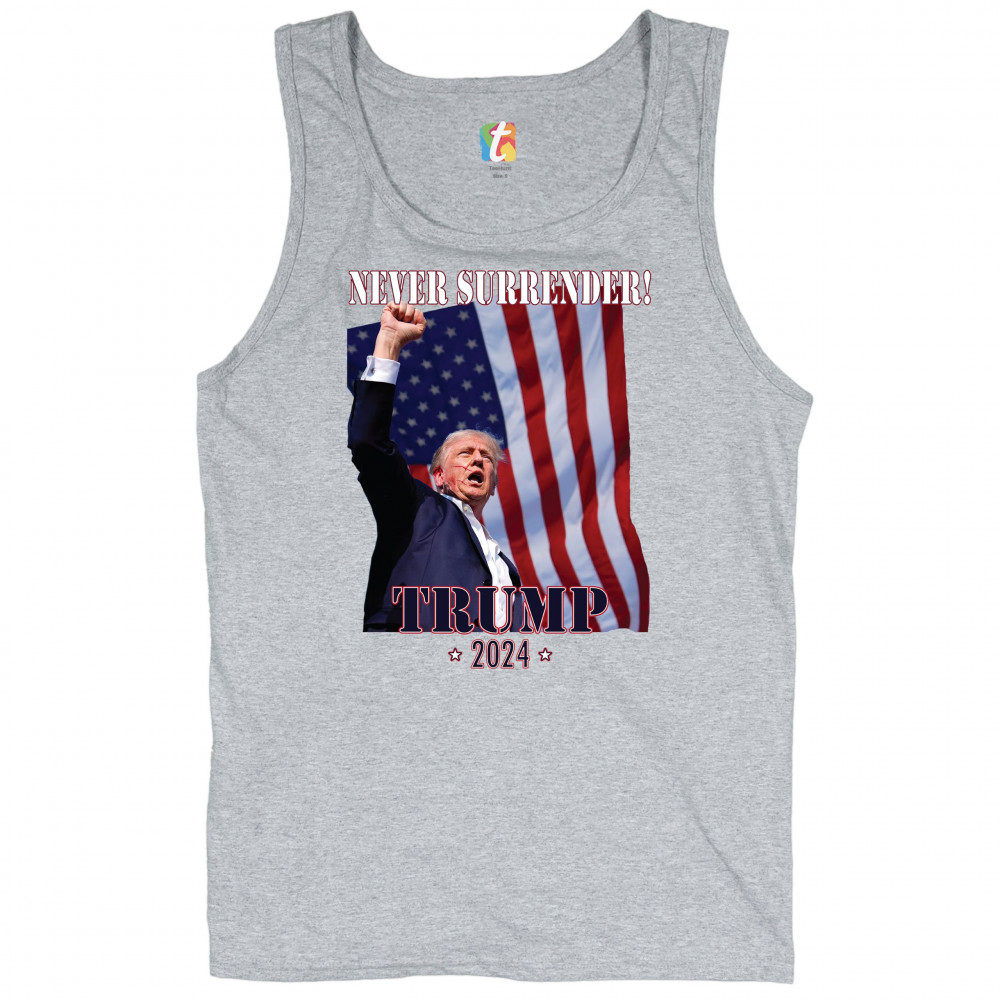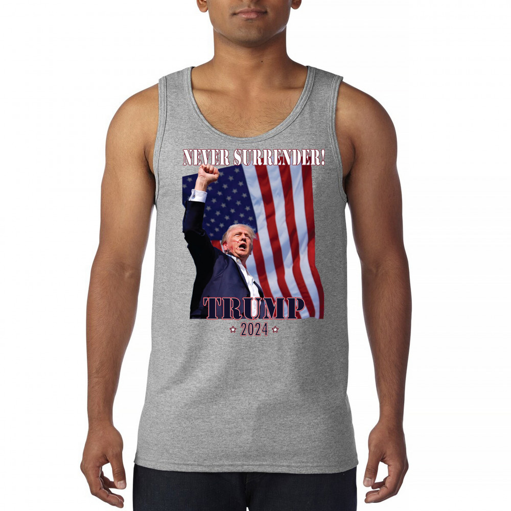 Celebrate your patriotic spirit and political stance with our "Never Surrender! Trump 2024" design. This powerful graphic showcases Donald Trump with a raised fist against the backdrop of the American flag, symbolizing resilience and determination. Ideal for rallies, events, and everyday wear, this design is crafted from premium materials for comfort and durability. Stand out and show your support for America's future with this striking and bold statement piece, perfect for any proud Trump supporter.