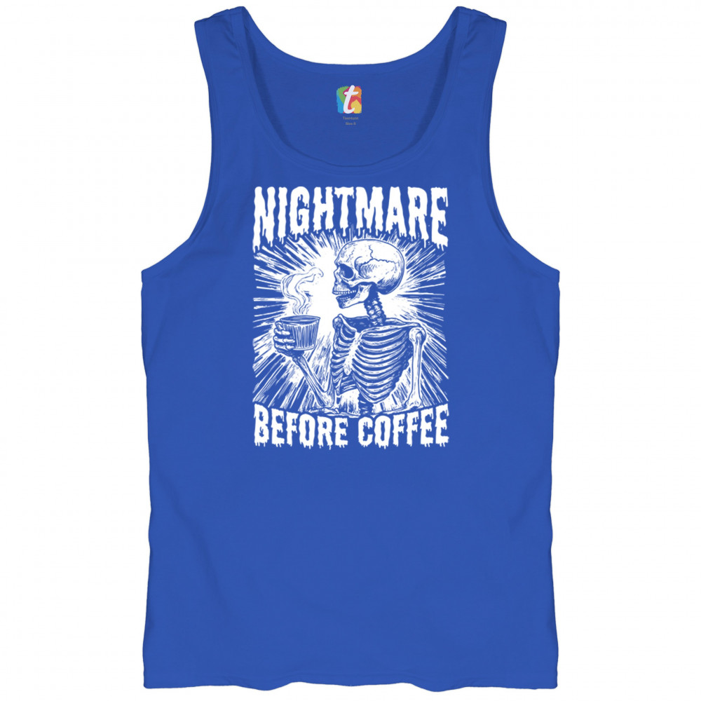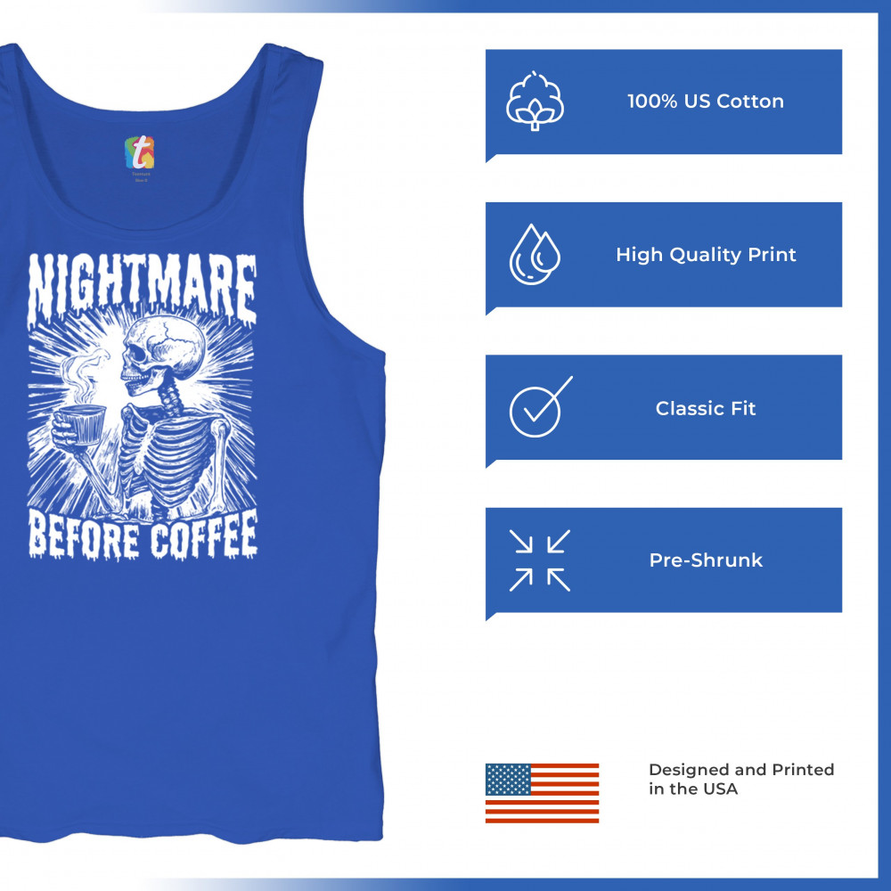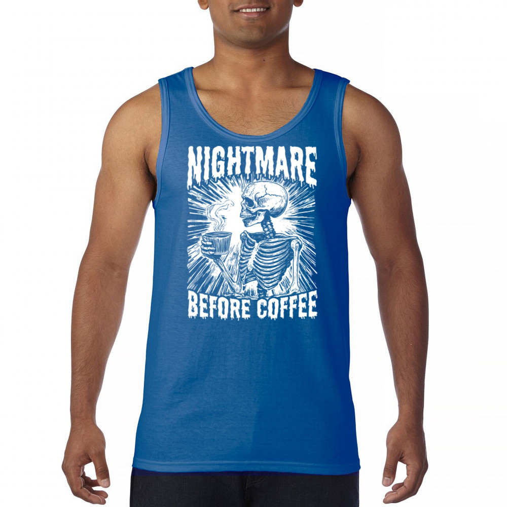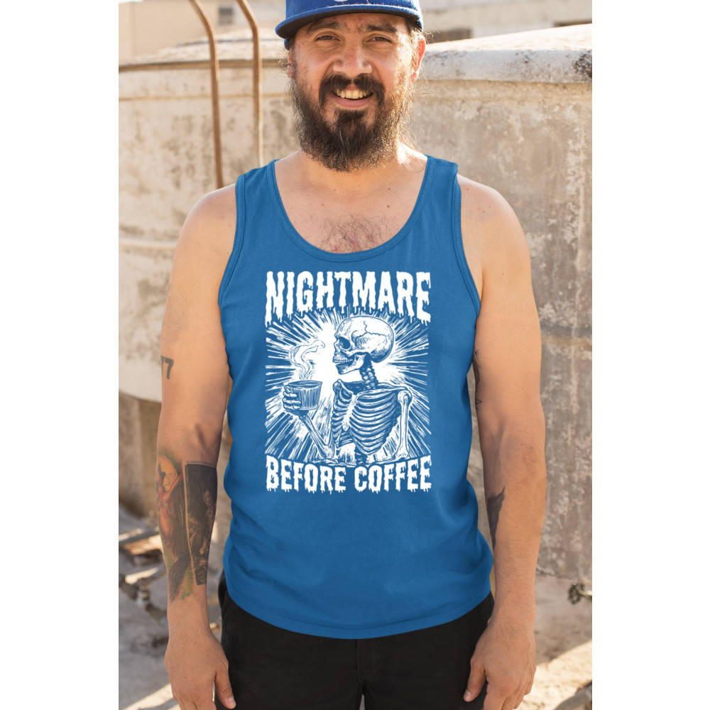 Show off your love for coffee with this quirky "Nightmare Before Coffee" skeleton design, blending humor and gothic style for caffeine lovers.