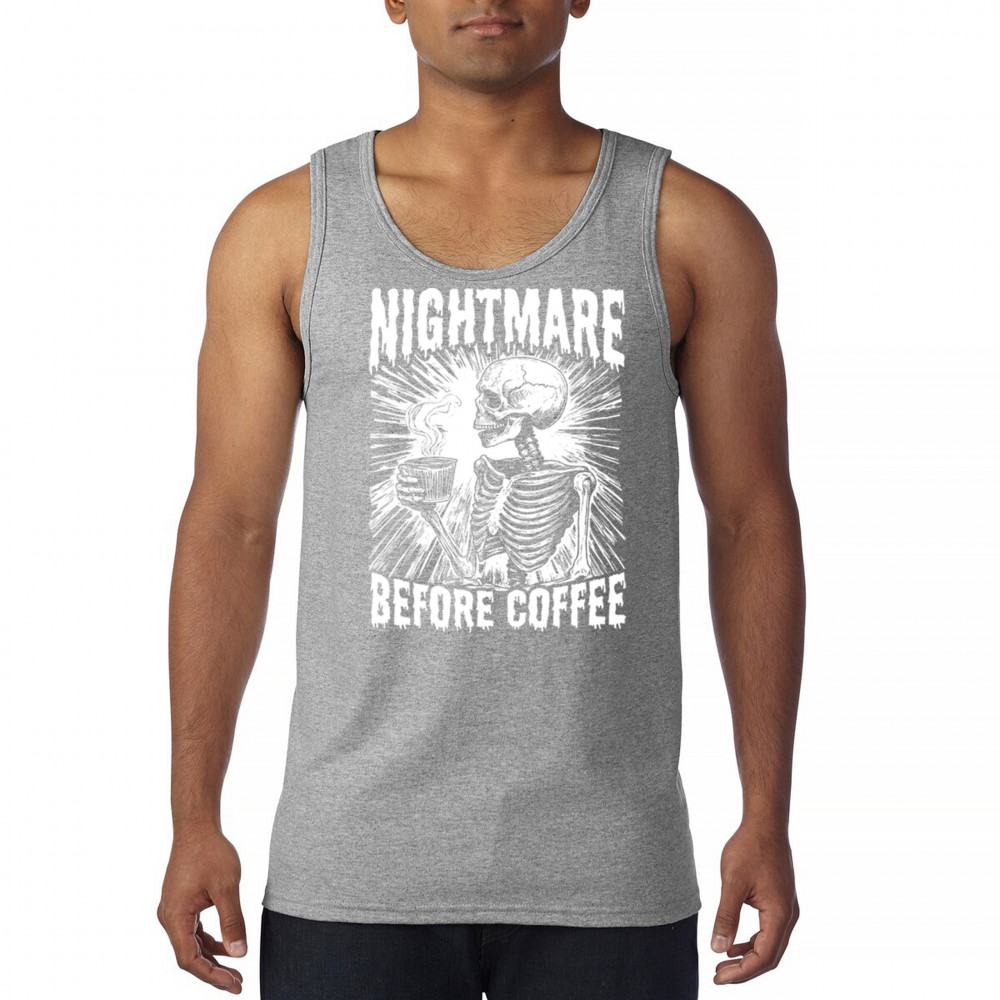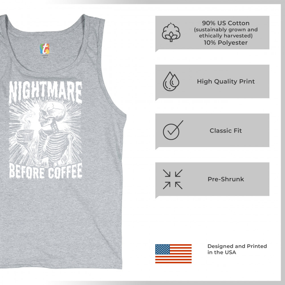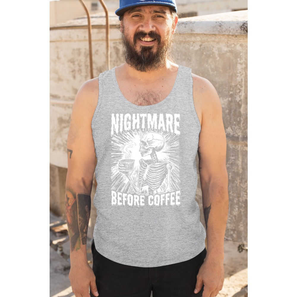Show off your love for coffee with this quirky "Nightmare Before Coffee" skeleton design, blending humor and gothic style for caffeine lovers.
