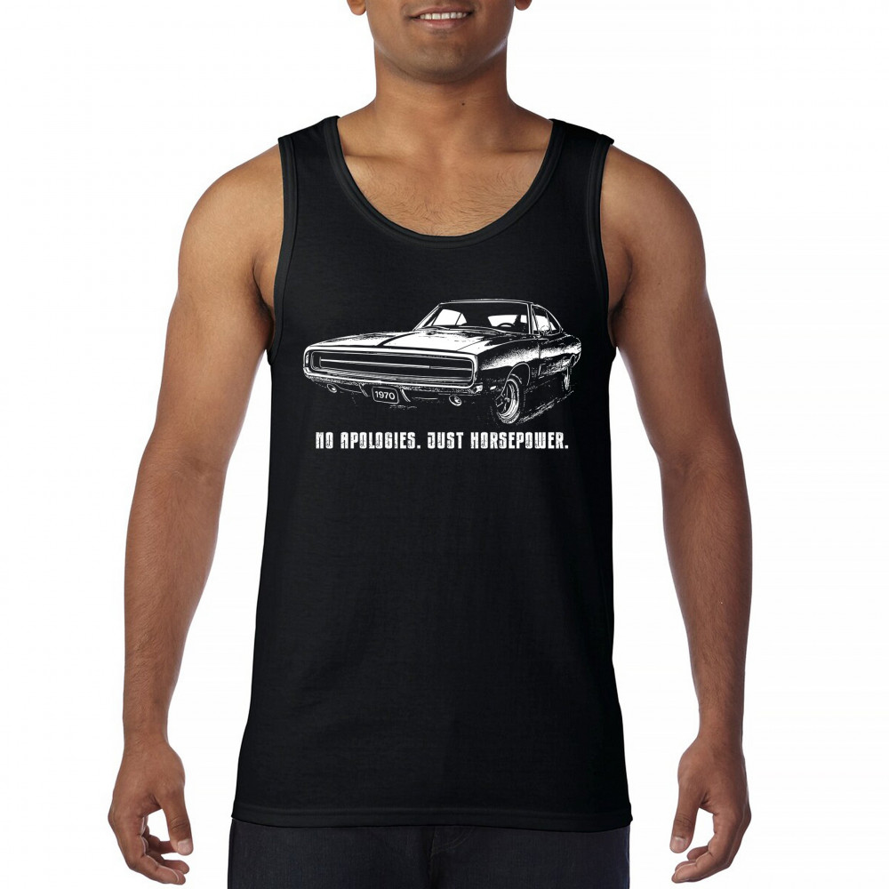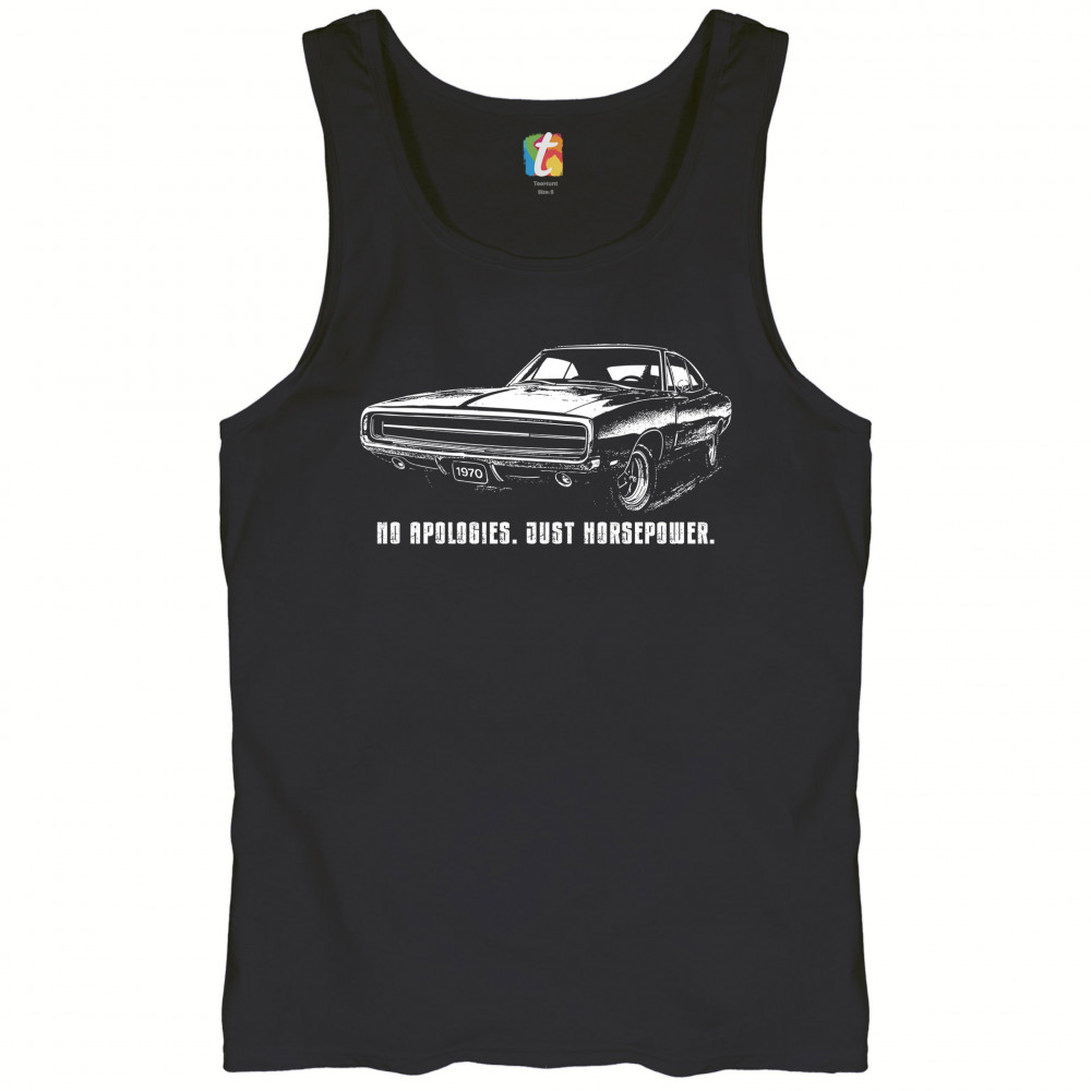 NO APOLOGIES JUST HORSEPOWER tank top vintage '70 muscle car classic men's top black