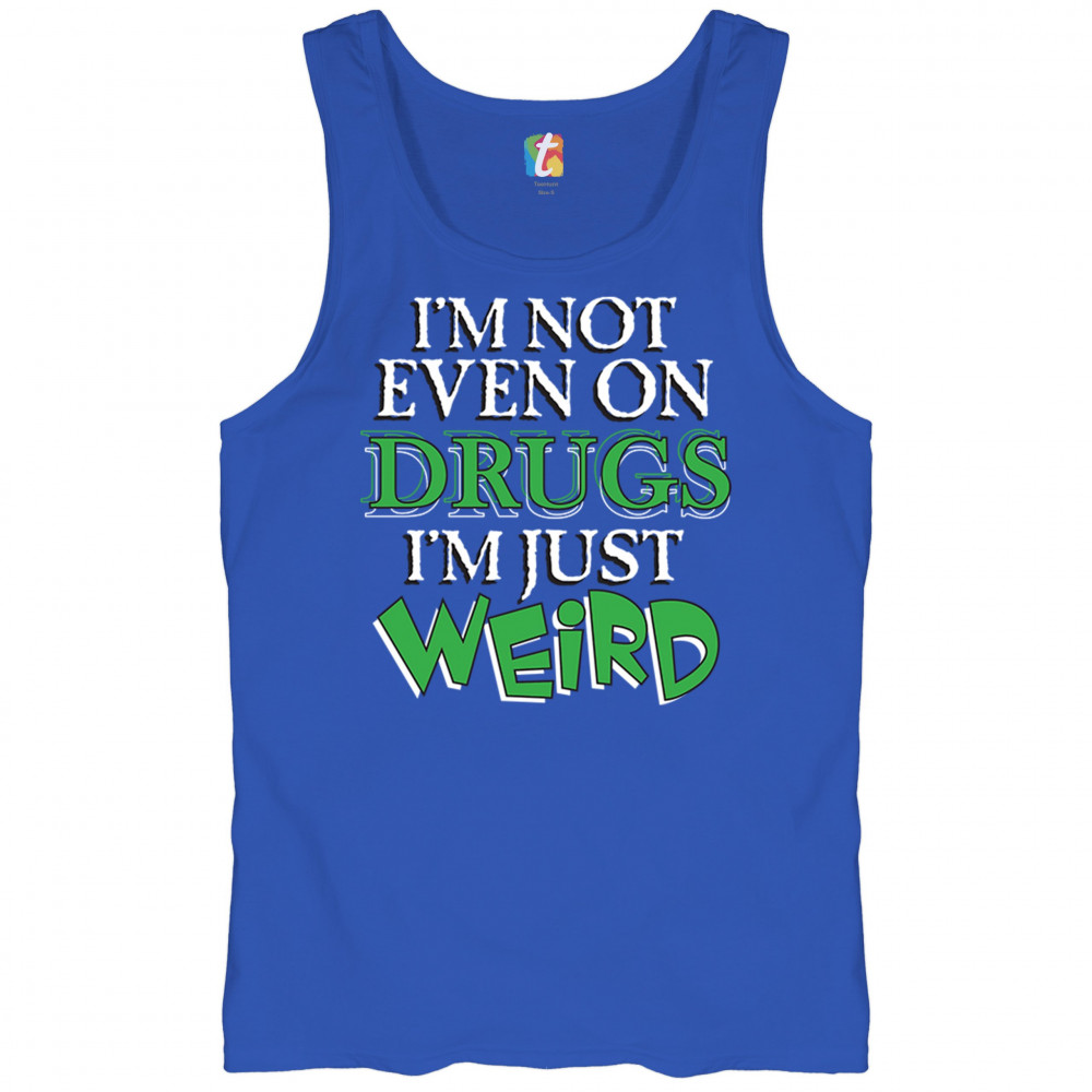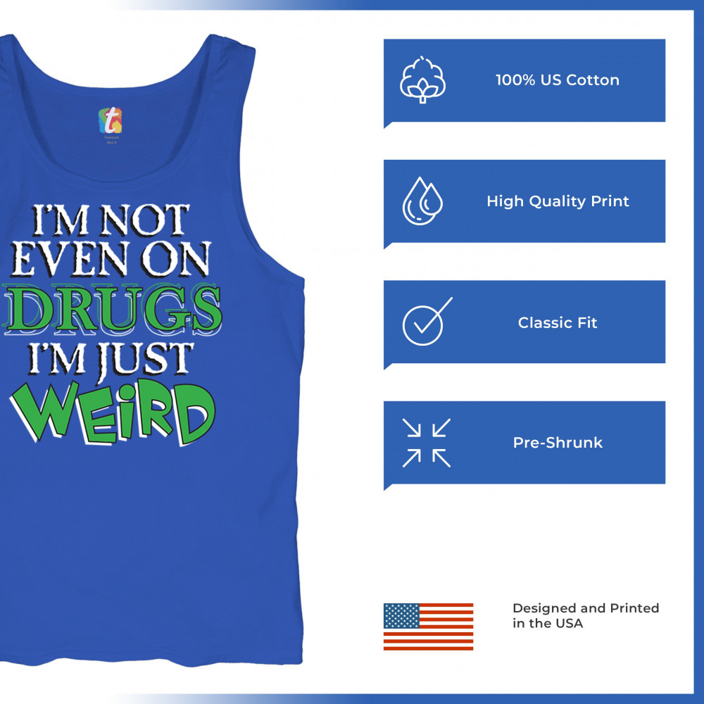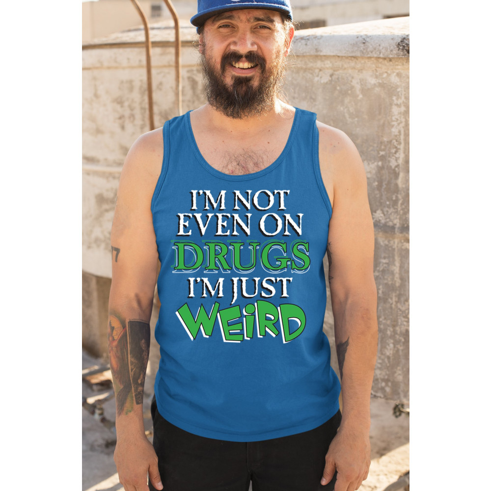Bold weird design for introverts and quirky minds. Says “I'm not even on drugs I'm just weirdâ€â€”perfect for awkward humor and loud energy.